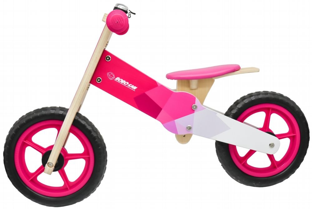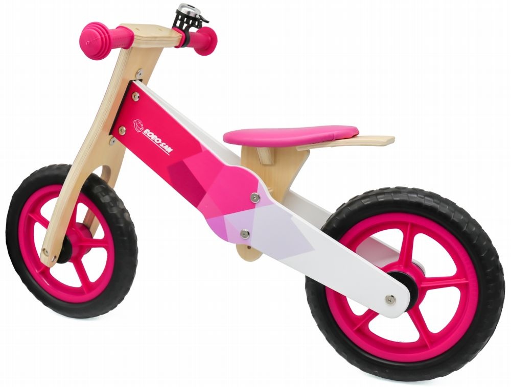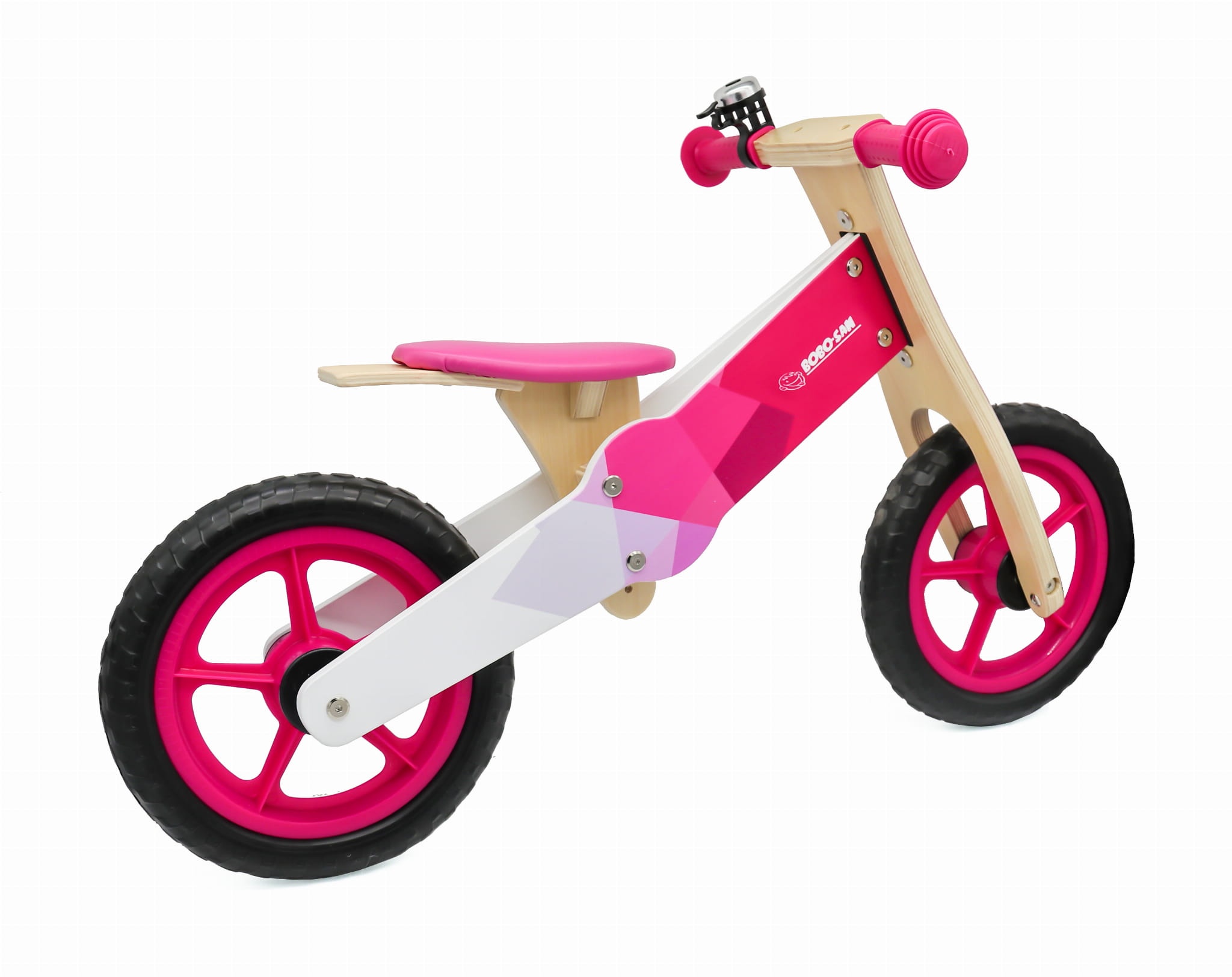 Dětské dřevěné odrážedlo, se zatáčecími řídítky, ergonomicky tvarovaným a výškově nastavitelným sedátkem.