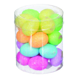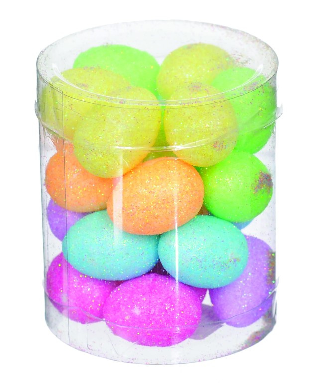 Vyrobené z lehkého polystyrenu a pokryté třpytkami, jsou ideální pro zdobení stolů, velikonočních košíků, dekorací nebo váz s vejci. Díky živým barvám a lesklému povrchu budou přitahovat pozornost a představují vynikající dekorativní prvek pro jarní a velikonoční svátky. Vejce jsou k dispozici v tubě, což usnadňuje jejich skladování a přepravu.