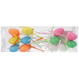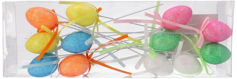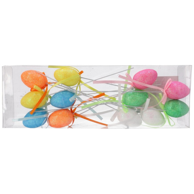 Obohať svou velikonoční dekoraci o tato elegantní polystyrenová vajíčka pokrytá třpytkami! Sada 12 vajec na špejli je skvělý způsob, jak vytvořit jarní, zářivou atmosféru ve vašem domově. Ideálně se hodí k dekoraci stolů, velikonočních košíků, váz nebo jiných jarních aranžmá.