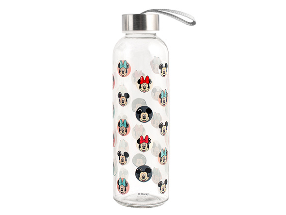 Lehká, praktická láhev s barevným obrázkem hravého Mickeyho a Minnie Mouse - vyrobená z bezpečnostního skla. Užitečná láhev na vodu nejen do školy a školky, ale také na procházky, výlety, domů nebo na hraní. Láhev na vodu je pevně uzavřená a má praktické držadlo s popruhem. Snadno se vejde do batohu nebo jeho boční kapsy. Snadno se čistí. Lze ji mýt v myčce nádobí. Její objem je 0,5 litru. Vyrobeno ze skla.