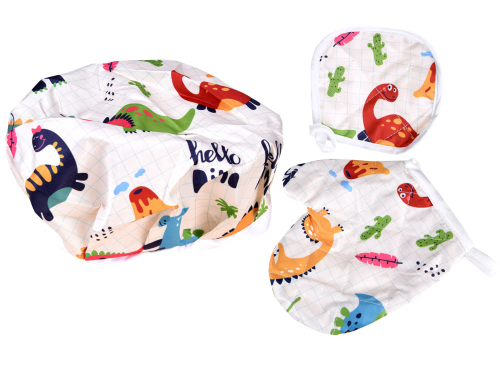 Sada vyrobená z látky s roztomilou grafikou dinosaurů si získá přízeň každého šéfkuchaře.