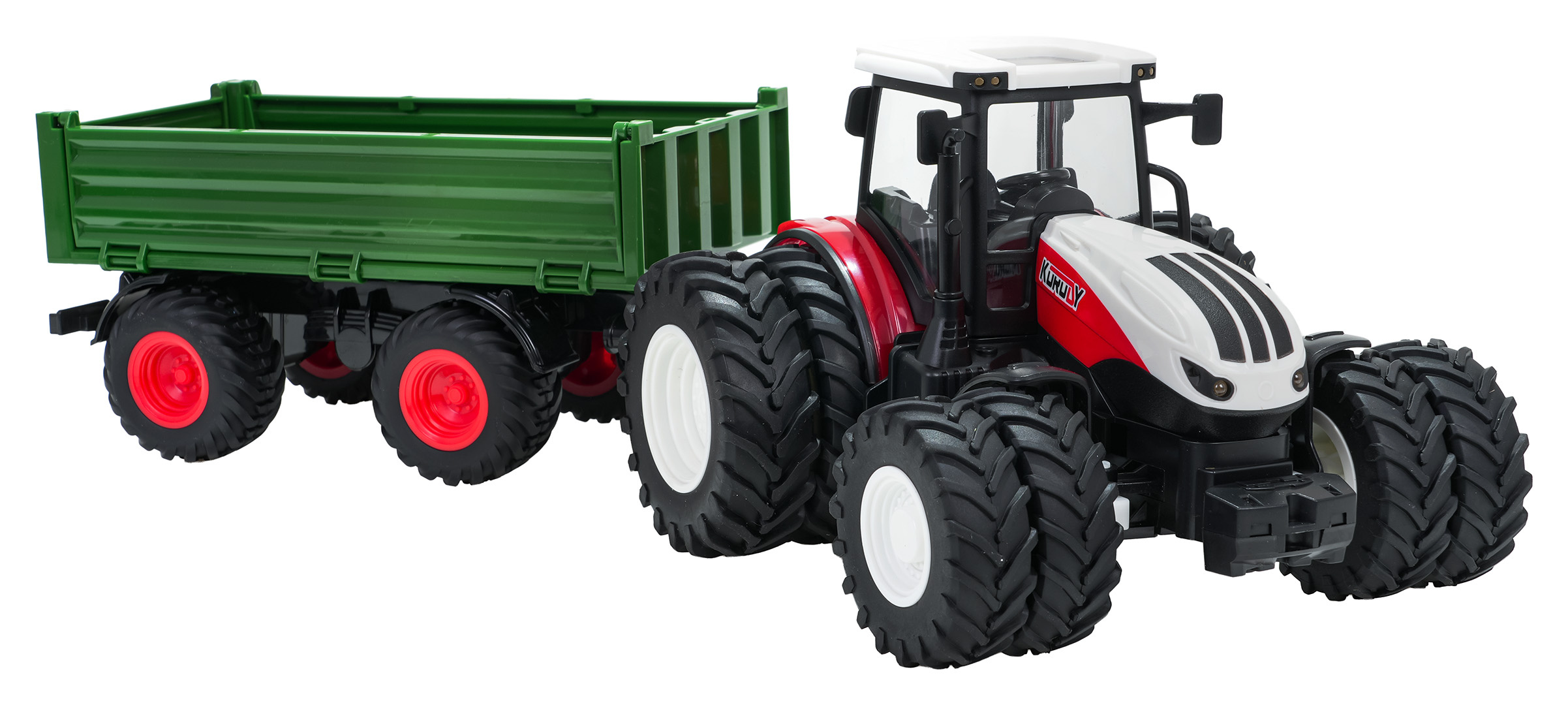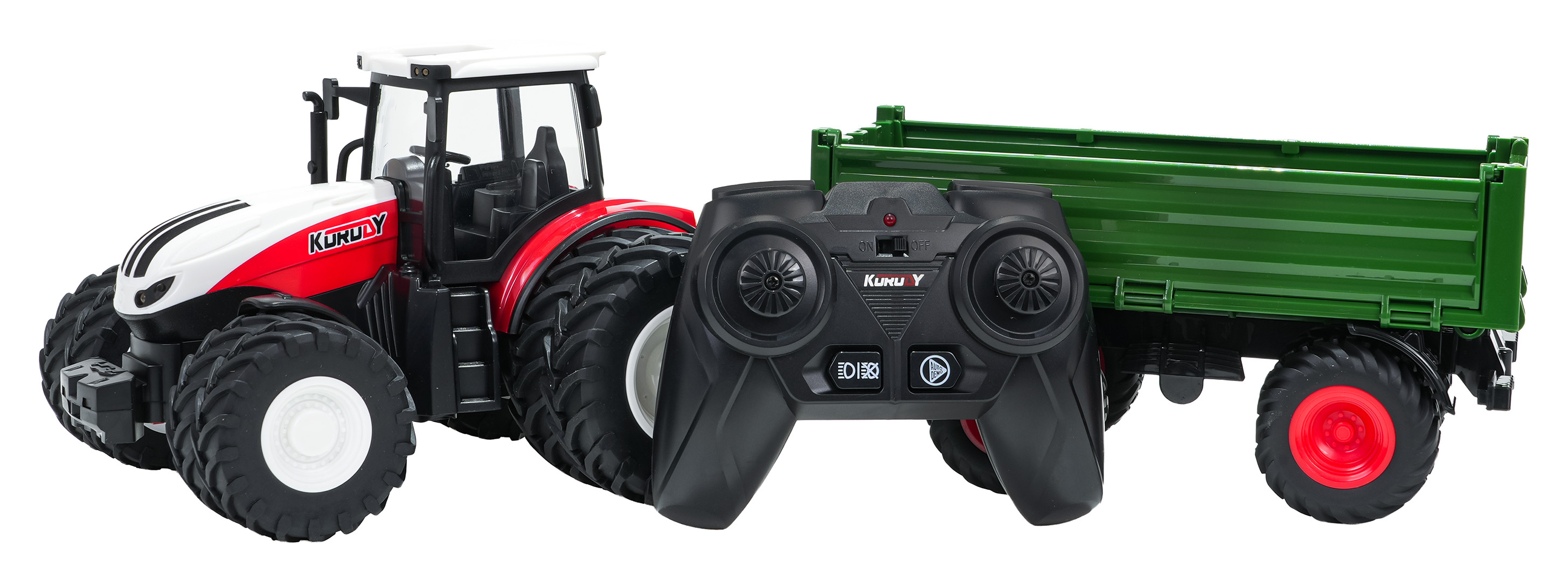 Dálkově ovládaný traktor s přívěsem v měřítku 1:24, pro děti od tří let. Traktor se pohybuje ve všech směrech, dopředu, dozadu, doprava a doleva, na velkých gumových kolech, která mu zajišťují dobrou přilnavost k povrchu. Návěs lze odpojit od traktoru nebo jej manuálně zvednout nahoru, aby se vyprázdnil náklad. Návěs má také odnímatelné boční stěny. Z ovladače můžeme vypínat osvětlení vozidla nebo spustit demo režim, ve kterém vozidlo předvádí všechny své schopnosti. Po delší nečinnosti se traktor vypne, aby šetřil spotřebu baterie. Hračka je napájena akumulátorem typu 3,7V, ovladač bateriemi typu 2 x AAA 1,5V (nejsou součástí balení).