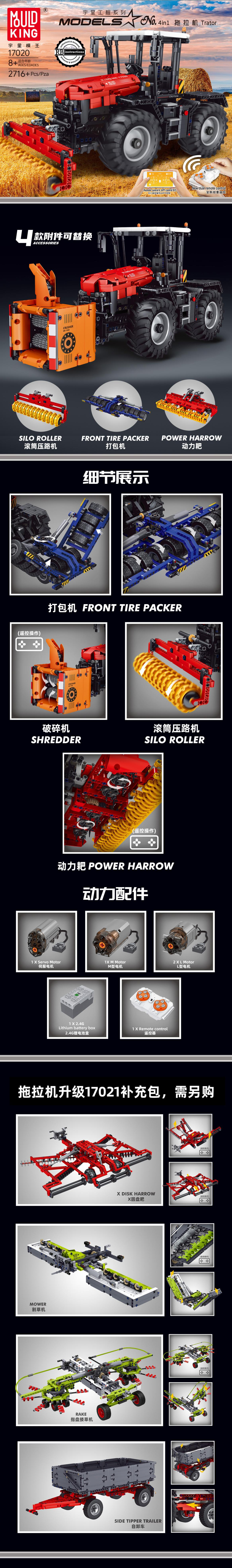 Kvalitní stavebnice pro děti od čtrnácti let. Sada se skládá z 2716 prvků, ze kterých si můžete sestavit dálkově ovládaný červený traktor s vyměnitelnými prvky - bránami, drtičem, lisem, válcem. Traktor má mnoho pohyblivých částí, jako je poklop motoru, ramena lisu a dálkově ovládané součásti - převody drtiče, podvozek brány. Velká gumová kola zajišťují stabilní jízdu traktoru v každém směru. Model můžeme ovládat pomocí dálkového ovladače nebo aplikace stažené do chytrého telefonu. Přístupový kód najdete na obalu. Aplikace umožňuje přístup k řadě funkcí, jako je pohyb vozidla, pohyb příslušenství nebo plánování tras pomocí jednoduchého programování. Traktor je napájen dobíjecí baterií typu 7,4 V (je součástí dodávky), dálkové ovládání bateriemi typu 2 x AAA 1,5 V (nejsou součástí dodávky).