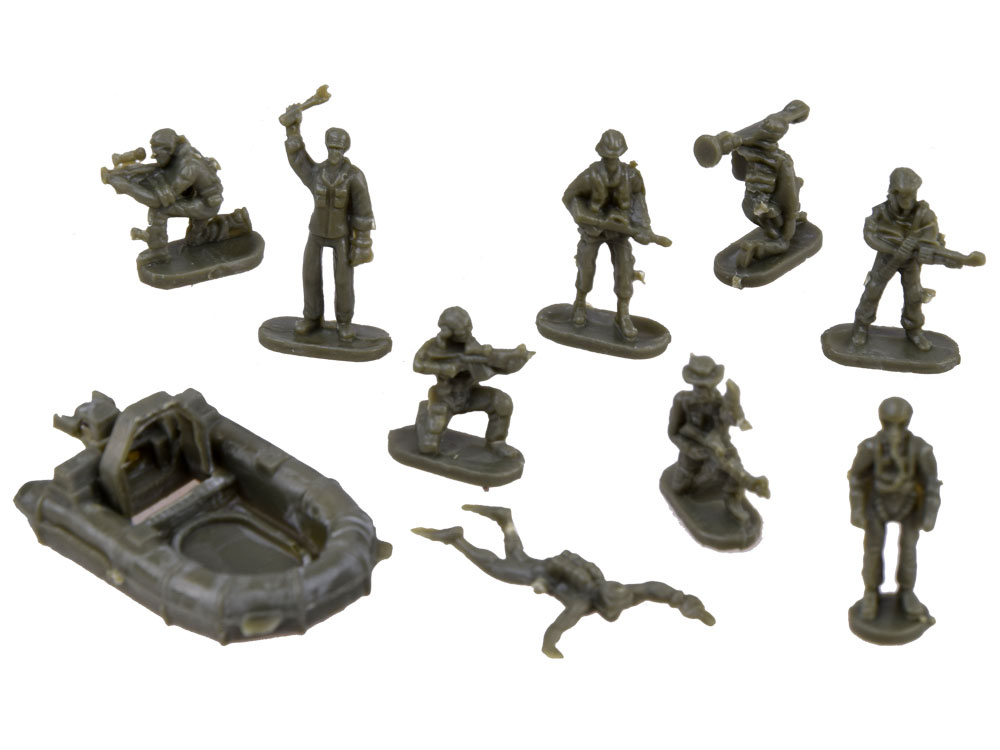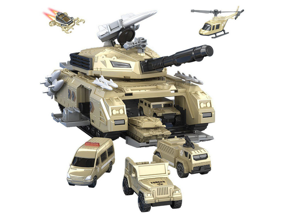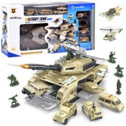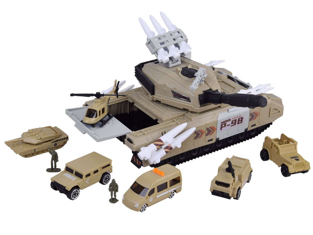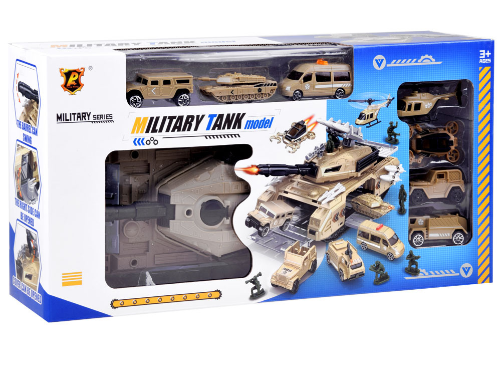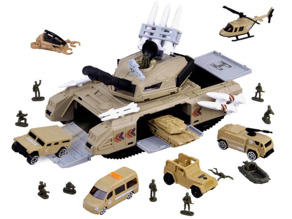 Sada obsahuje: - kontejnerový tank -auto Hummer - malý tank s otočnou věží - dodávkové auto - vrtulník - dron - vojenský džíp - bojové vozidlo - vojáky - člun - raketomet - rakety - samolepky
