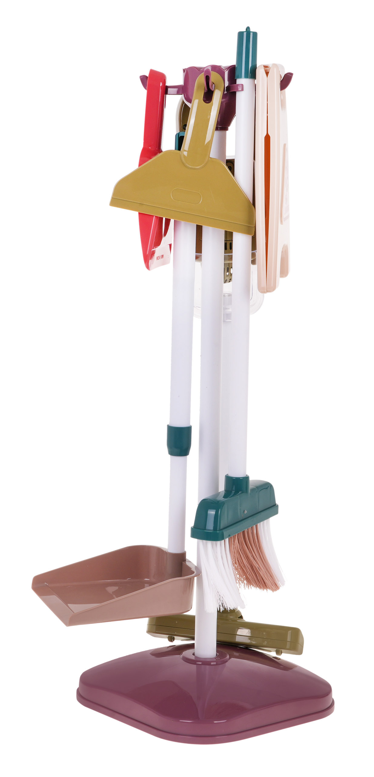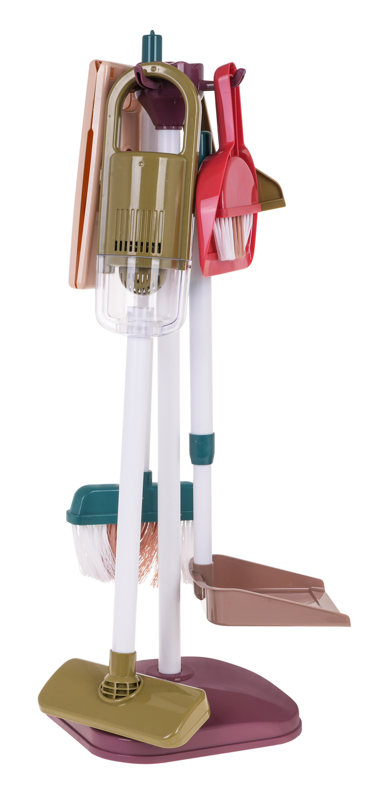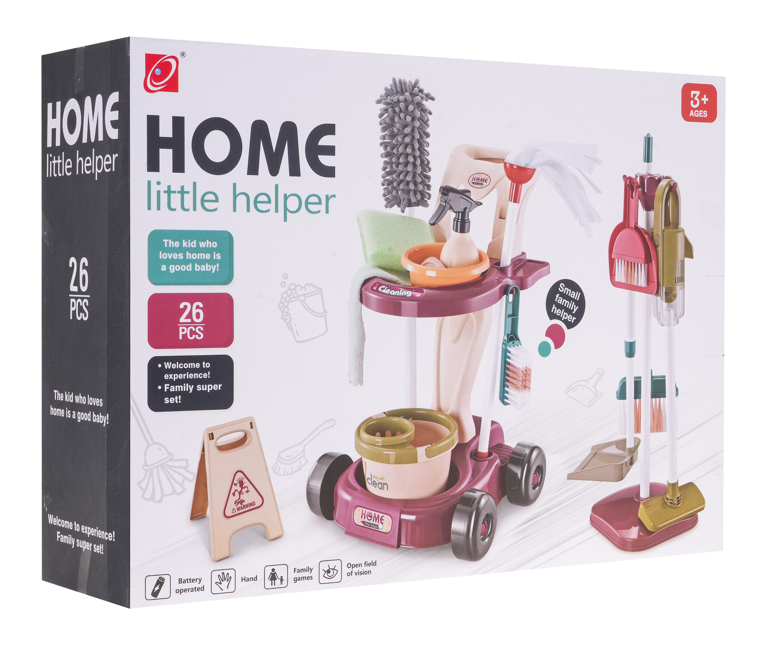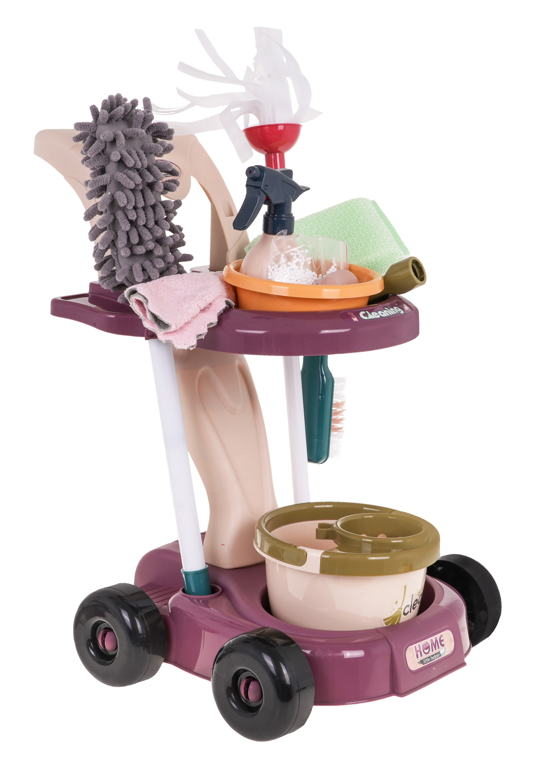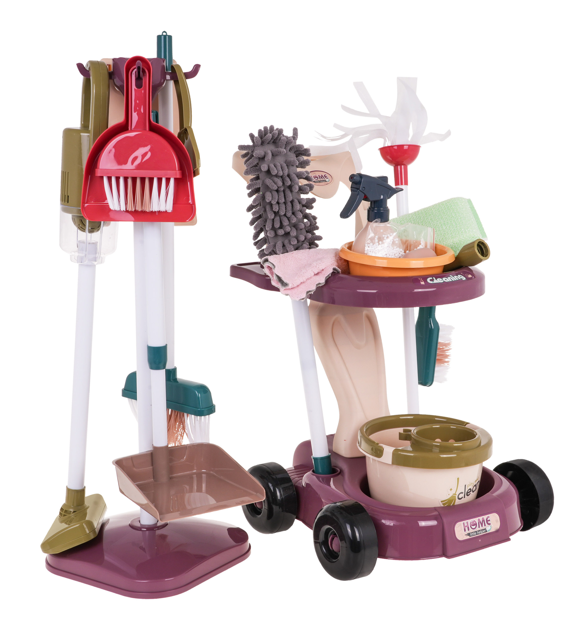 Velká, dobře vybavená úklidová sada s vozíkem, stojanem, vertikutátorem a příslušenstvím je vhodná pro děti od 3 let. Sada obsahuje až 26 prvků. Vozík má kolečka, pohodlnou rukojeť na tlačení a dvě police pro uložení příslušenství. Stojanový vysavač je vybaven dvěma vyměnitelnými hubicemi, jako je kartáčová a štěrbinová hubice. Je napájen 3 bateriemi AA 1,5 V, baterie nejsou součástí balení. Po zapnutí vydává zvuk vysávání a nasává malé polystyrenové kuličky. Některé doplňky, jako je tyčový smeták a kartáč, jsou nastavitelné. Nádobku s rozprašovačem lze doplňovat vodou.