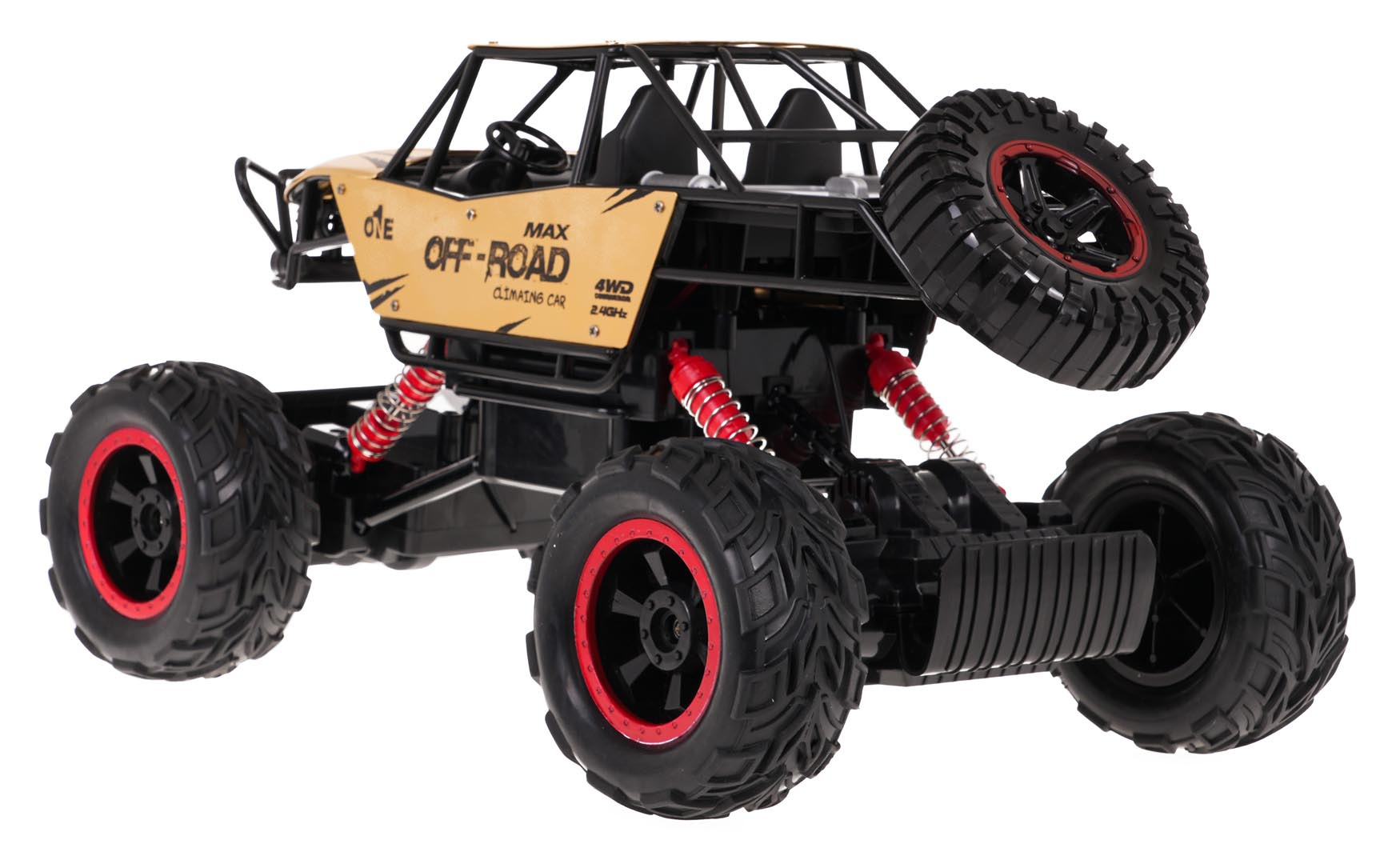 Kovový crawler One Max, vyrobený v měřítku 1:12, dálkově ovládaný s pohonem na čtyři kola, je určen pro děti od 6 let. Velké gumové pneumatiky, pružinové zavěšení způsobuje, že vozidlo bez problémů překoná jakýkoli povrch. Vozidlo je vyrobeno z vysoce kvalitních materiálů, má kovovou karoserii, což mu zajišťuje odolnost. Hračka je napájena akumulátorem typu 700 mAh 7,2 V (v balení), ovladač bateriemi typu 2 x AA 1,5 V (nejsou součástí balení).
