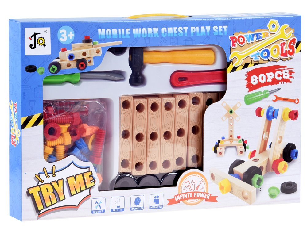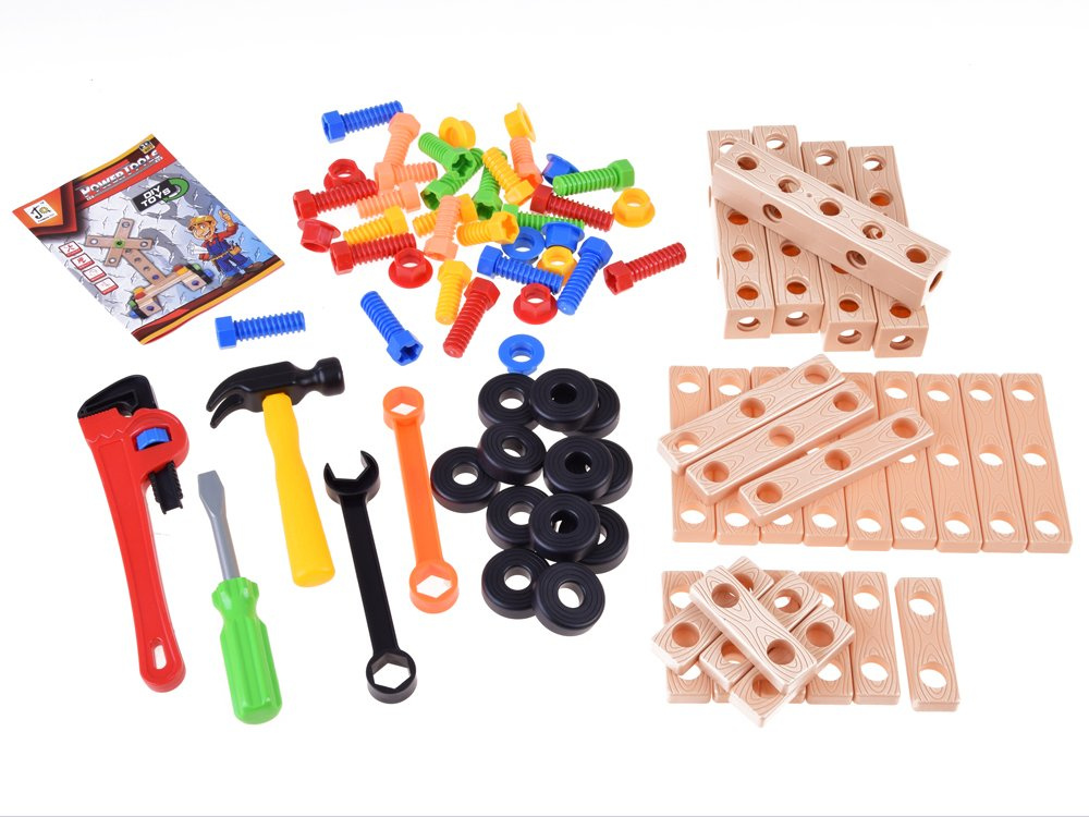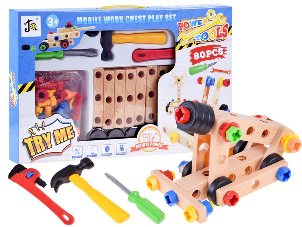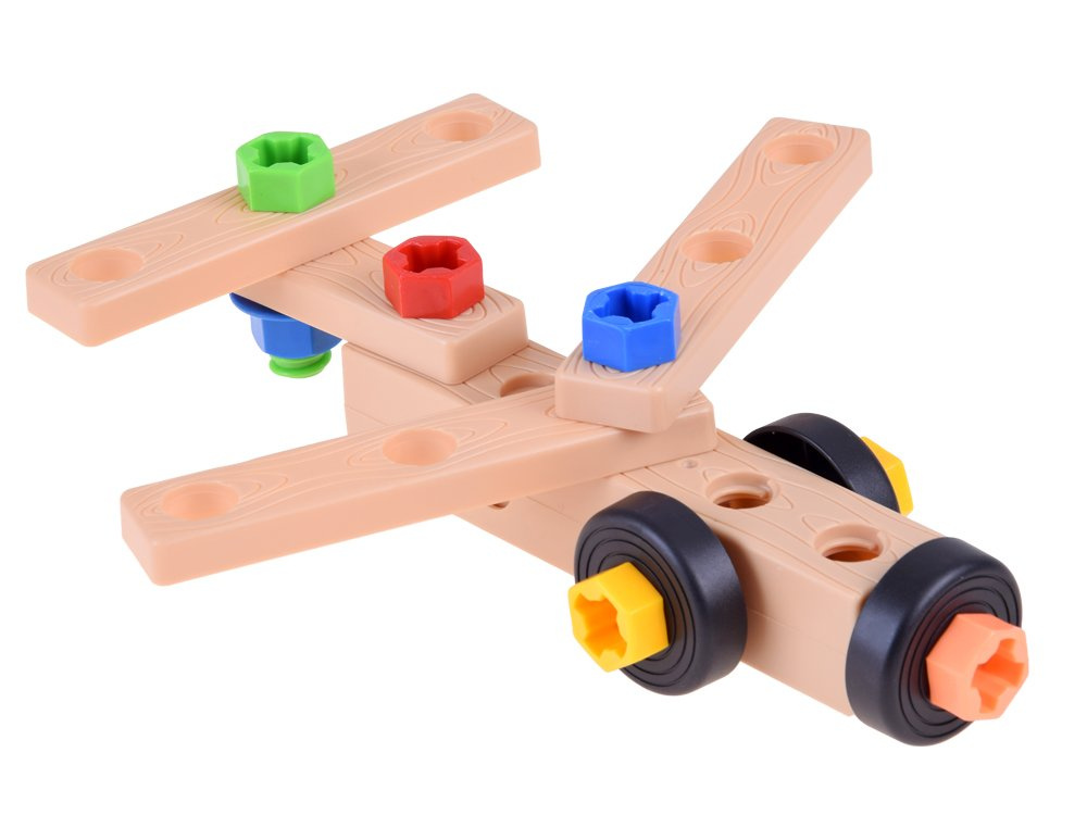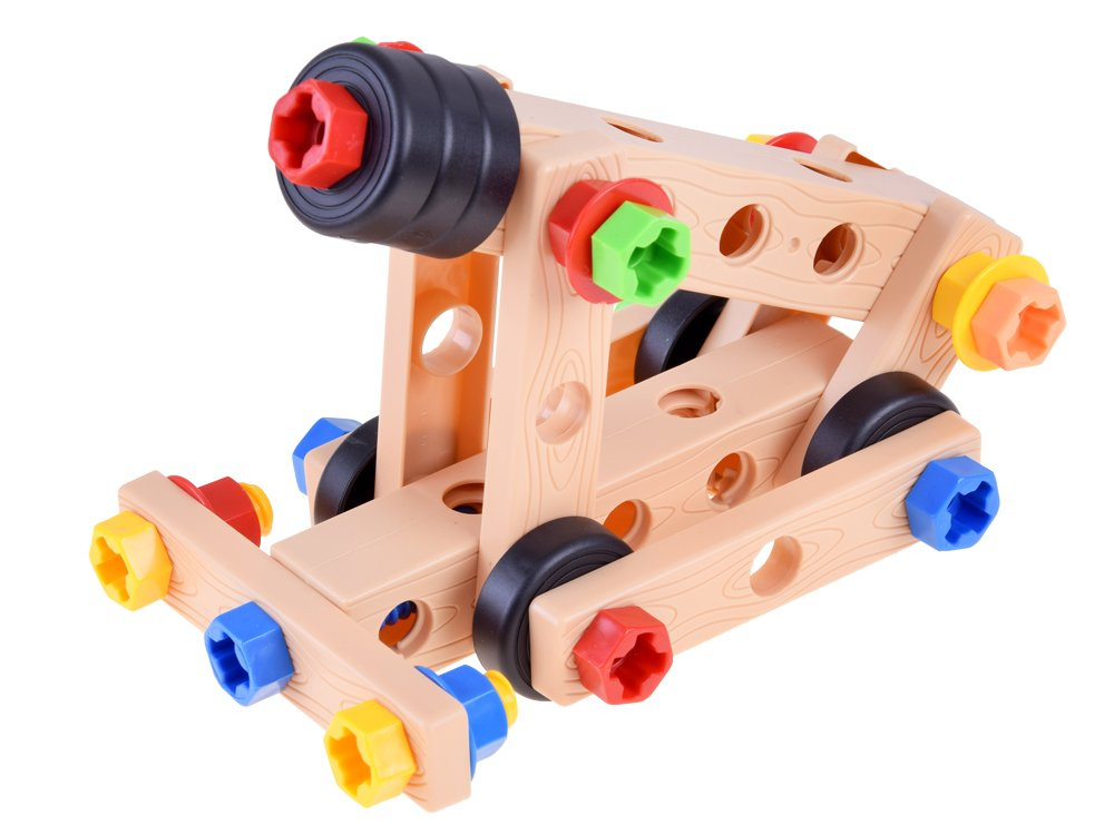 Senzační sada 80 dílků umožní každému malému staviteli postavit úžasné budovy, vozidla a stavby. Základem konstrukce je systém otvorů a děr umístěných v hlavních komponentech, ke kterým dotahujeme další díly barevnými šrouby. Kreativní bloky rozvíjejí prostorovou představivost, manuální dovednosti a motorickou koordinaci.