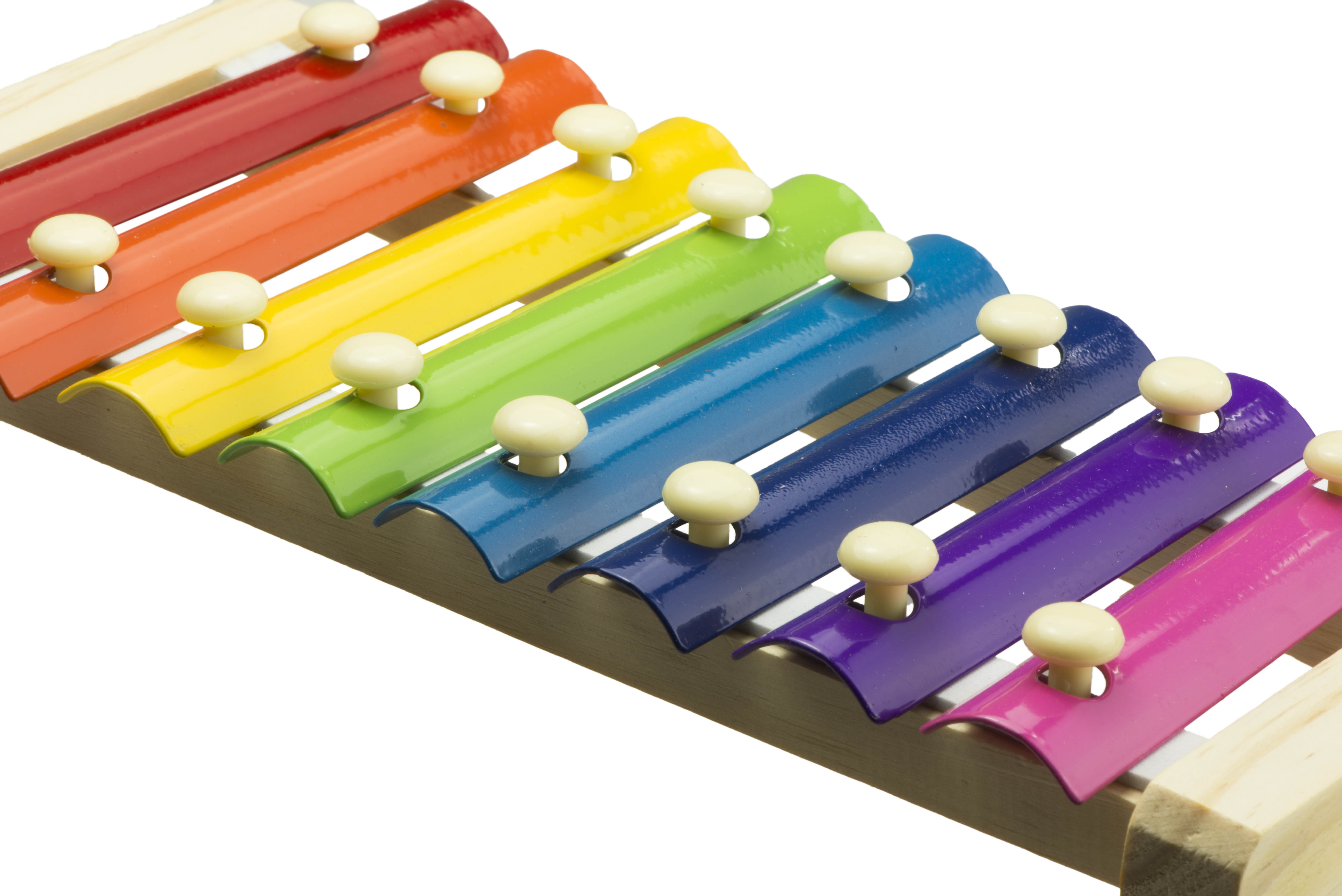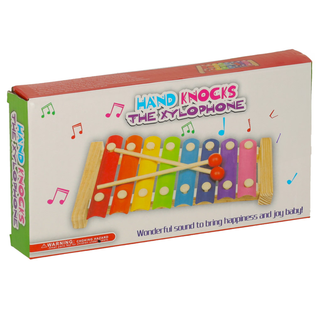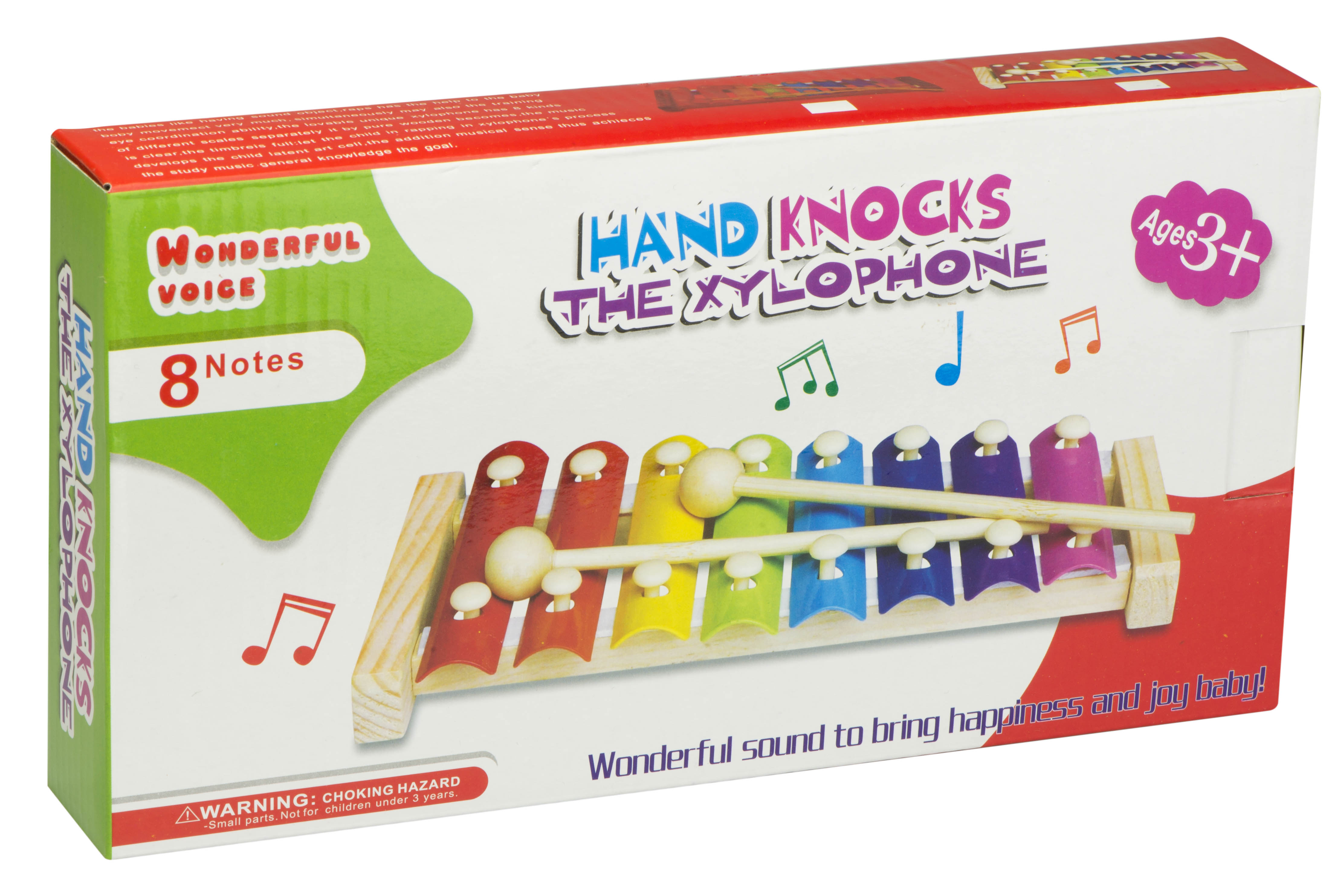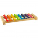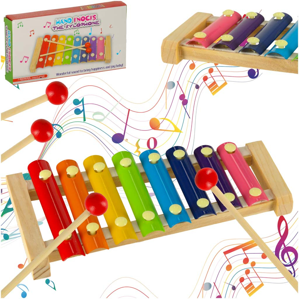 Barevný hudební xylofon s dřevěným rámem, ideální pro začínající hudebníky. Xylofon je vyroben z osmi kovových desek různých barev. Hra s nástrojem učí děti rozeznávat zvuky a prospívá jejich smyslu pro rytmus. Hračka navíc podněcuje kreativitu a tvůrčí myšlení, učí trpělivosti a zlepšuje paměť a soustředění.