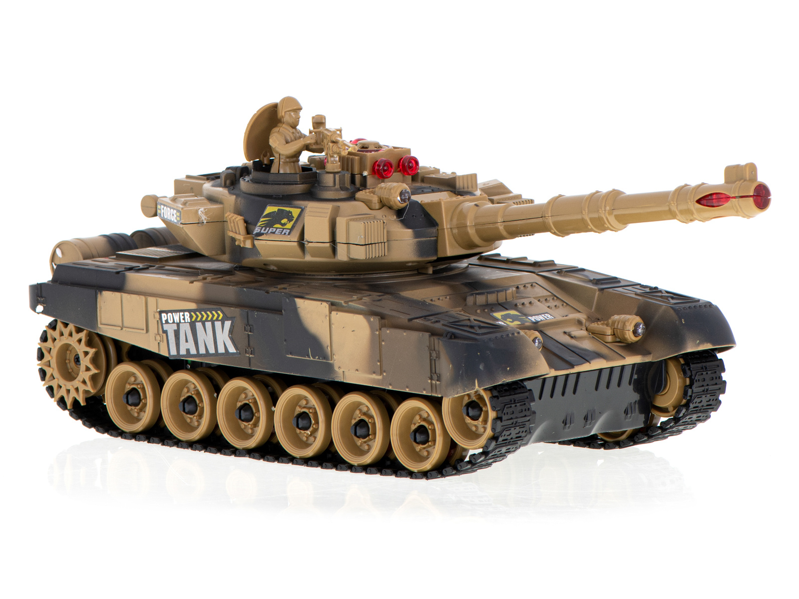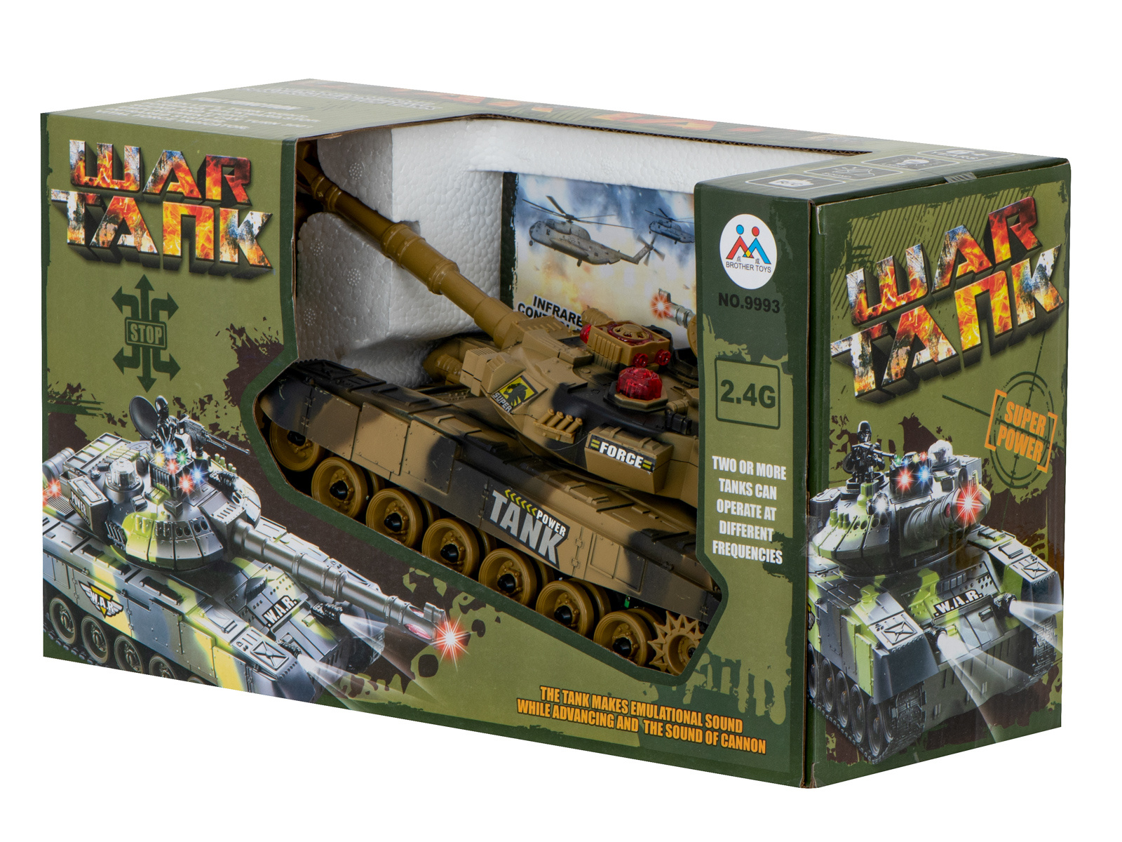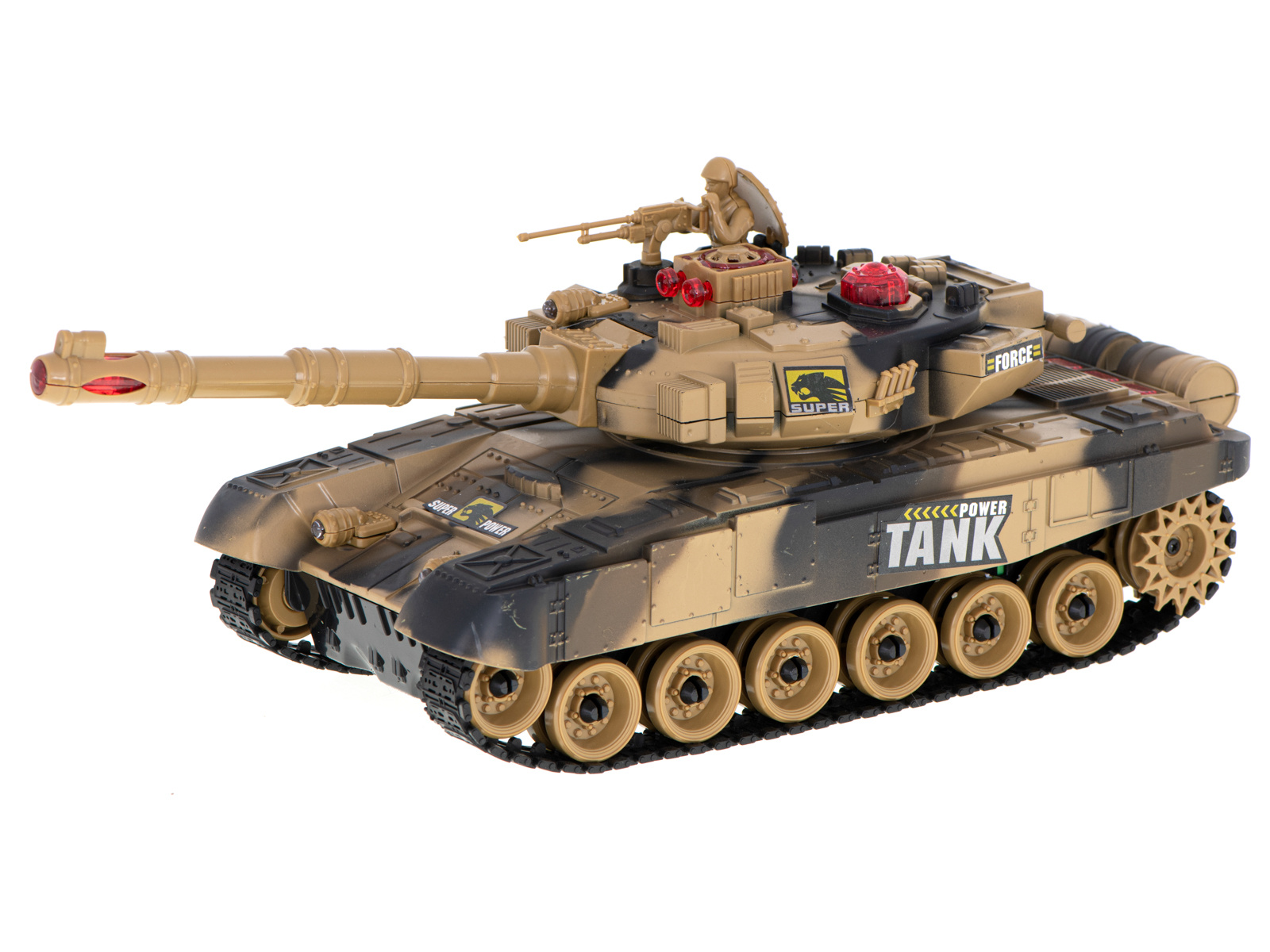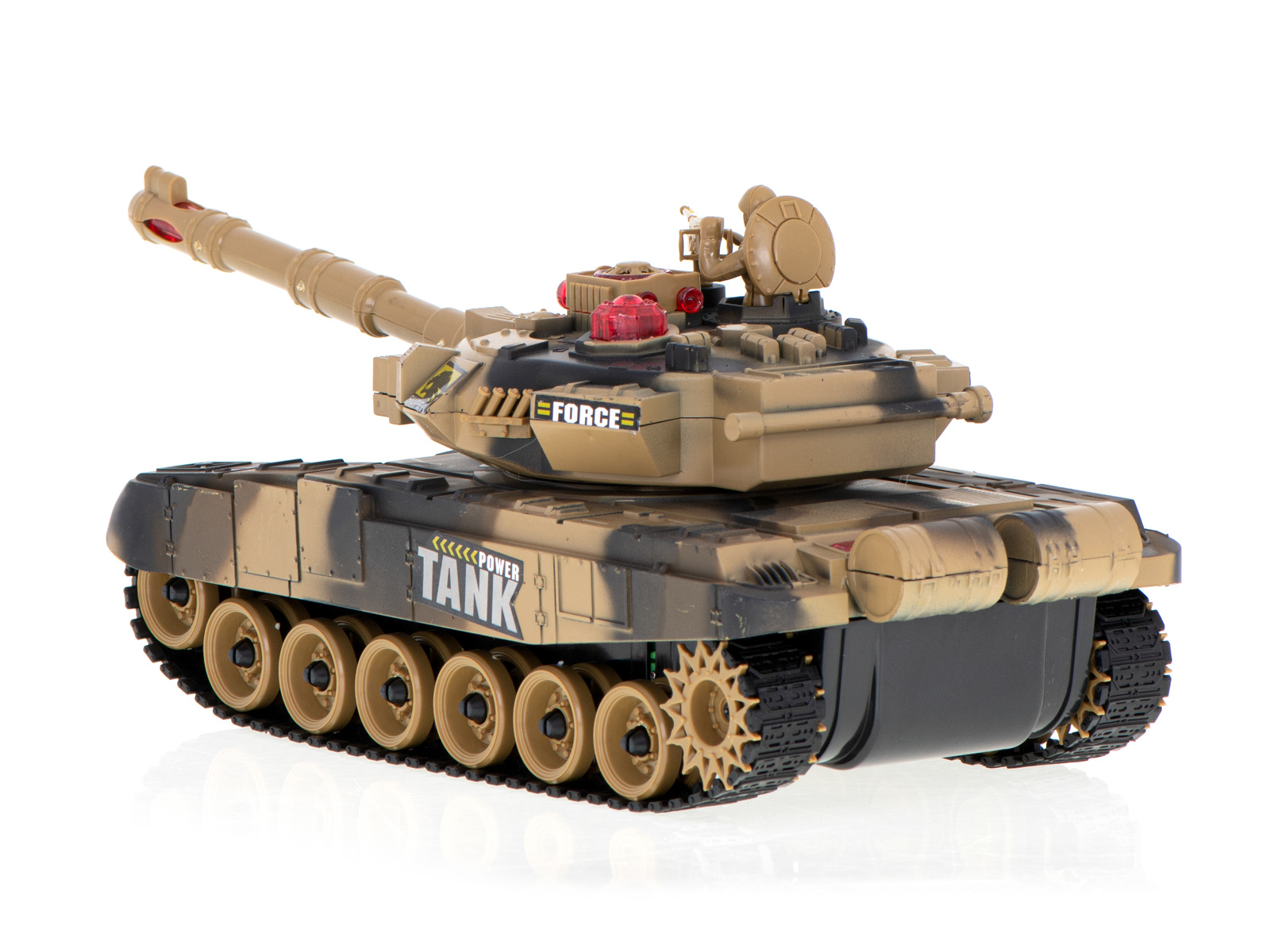 Jízda všemi směry. Zvuky, osvětlení. Zpětný ráz při střelbě. Dálkově otočná věž. Tank ve 2 barvách a může bojovat na infračerveném světle. Napájení: dobíjecí baterie Ni-Cd 7,2 V 700 mAh, 9V baterie. Rozměry: 47x20,5x18,5 cm.Celý popis