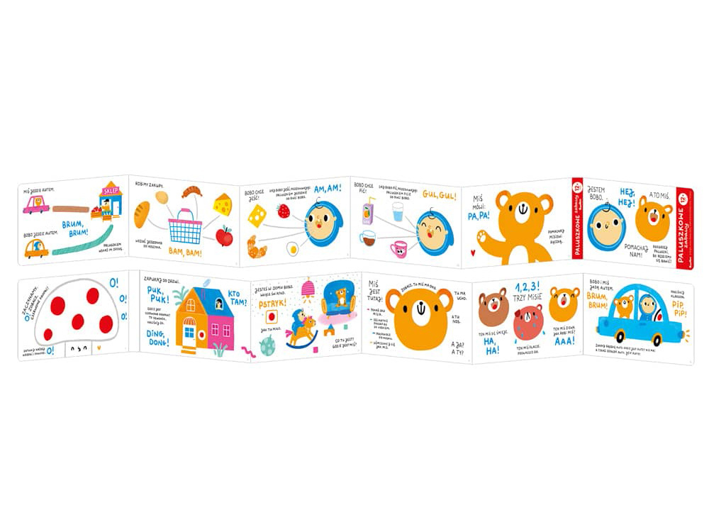 Dlouhá harmoniková kniha obsahuje úkoly, které dítě zapojí do hry a procvičování dovedností. Prstové hry jsou plné zajímavých, barevných ilustrací a nápadů na zábavné hry přizpůsobené dovednostem a zájmům dětí.