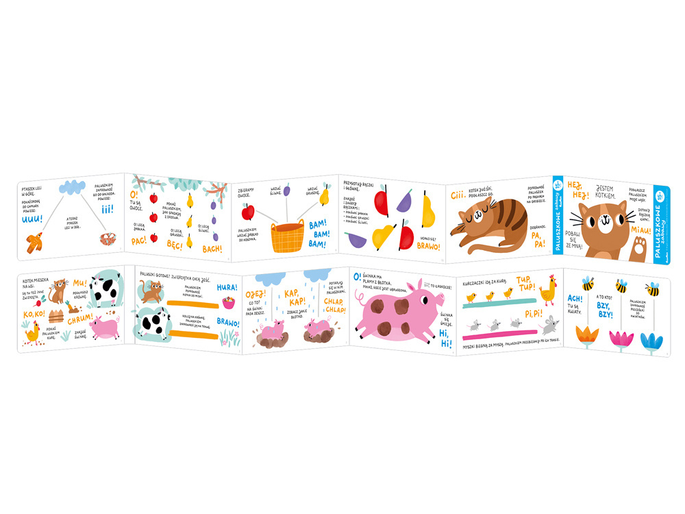 Dlouhá harmoniková kniha obsahuje úkoly, které dítě zapojí do hry a procvičování dovedností. Prstové hry jsou plné zajímavých, barevných ilustrací a nápadů na zábavné hry přizpůsobené dovednostem a zájmům dětí.