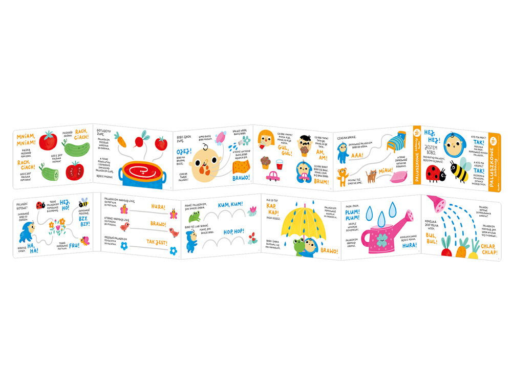 Dlouhá harmoniková kniha obsahuje úkoly, které dítě zapojí do hry a procvičování dovedností. Prstové hry jsou plné zajímavých, barevných ilustrací a nápadů na zábavné hry přizpůsobené dovednostem a zájmům dětí.