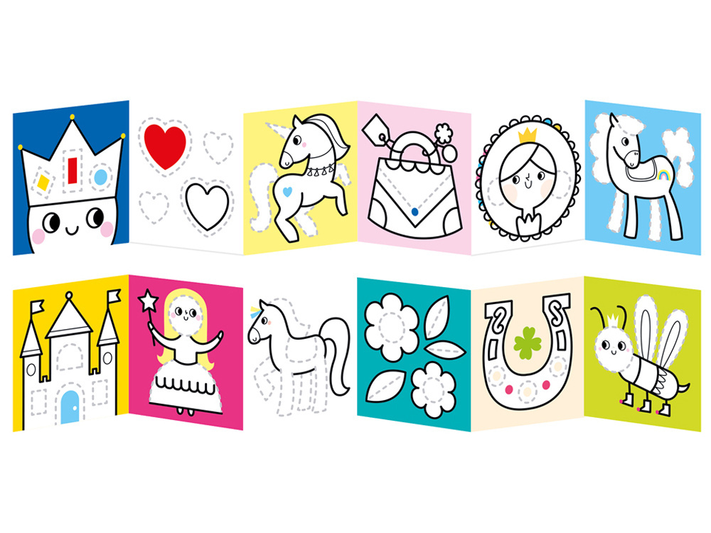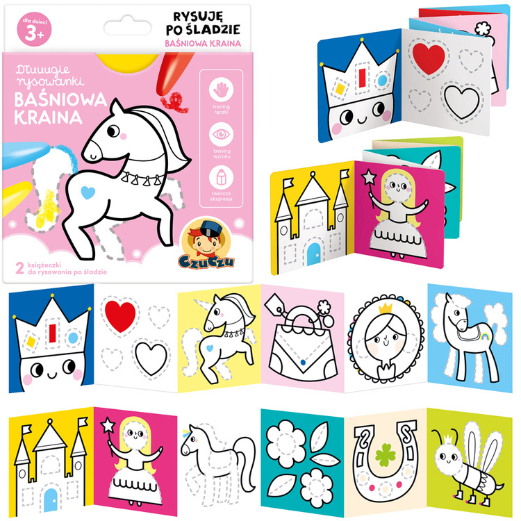 Kreativní sada ukrývá 2 dlouhé sešity pro harmoniku. Oblíbený námět vybízí děti, aby sáhly po pastelkách a barvičkách: kouzelné ilustrace, které inspirují k tvořivé hře. Kreslete po stopě, vybarvujte, přidávejte vlastní prvky a zlepšujte přitom manuální zručnost a představivost.
