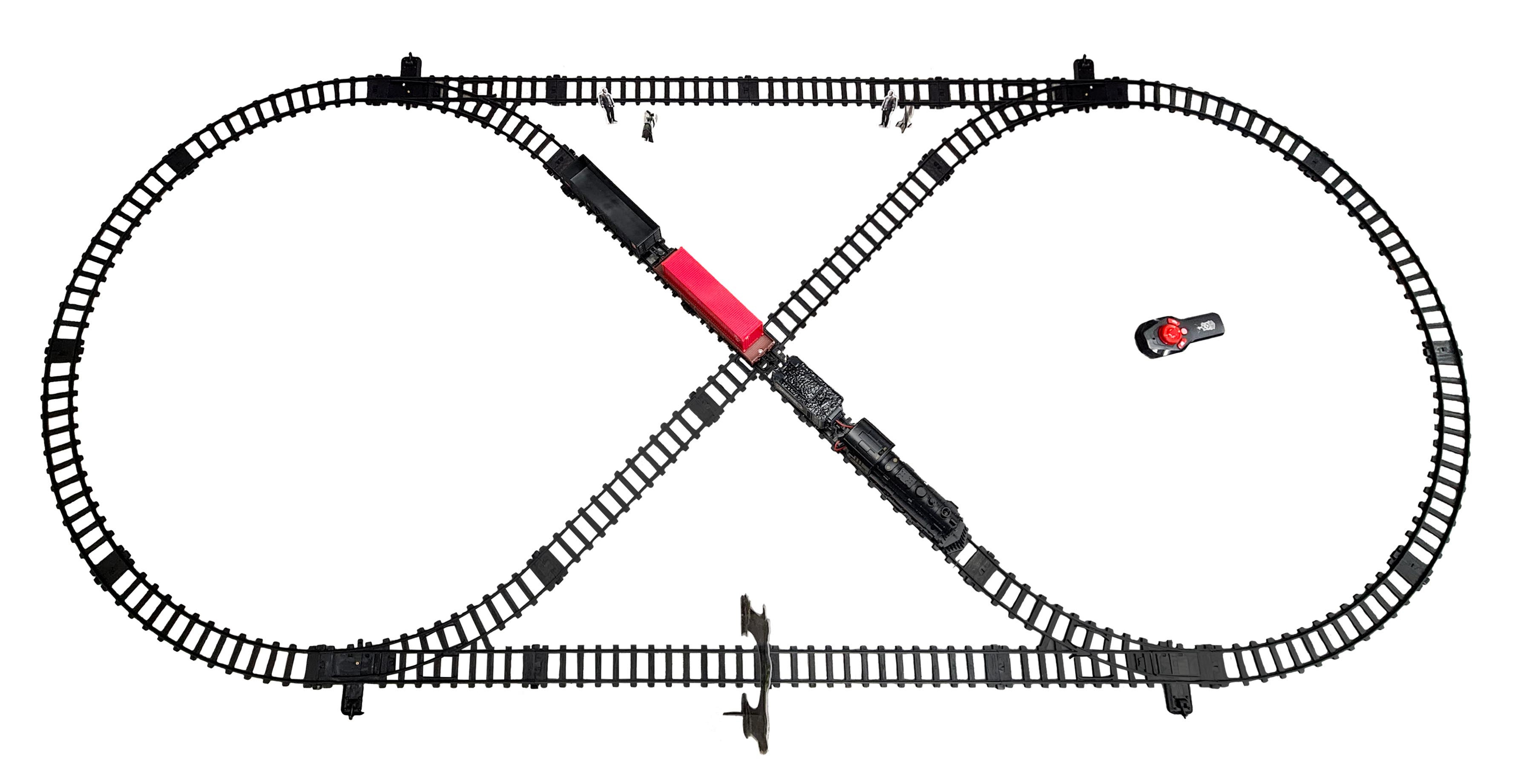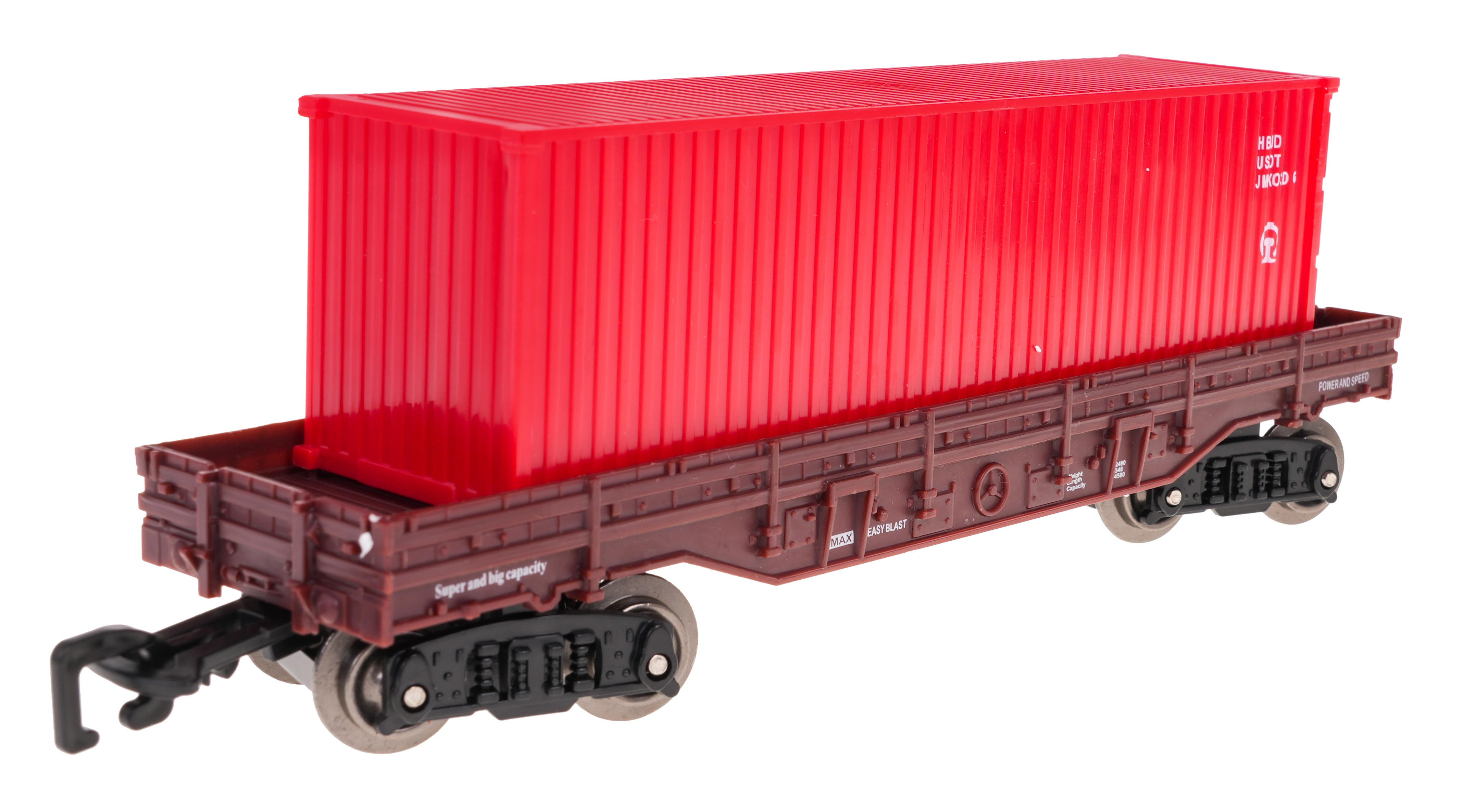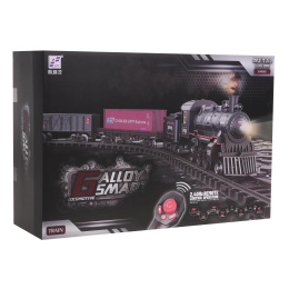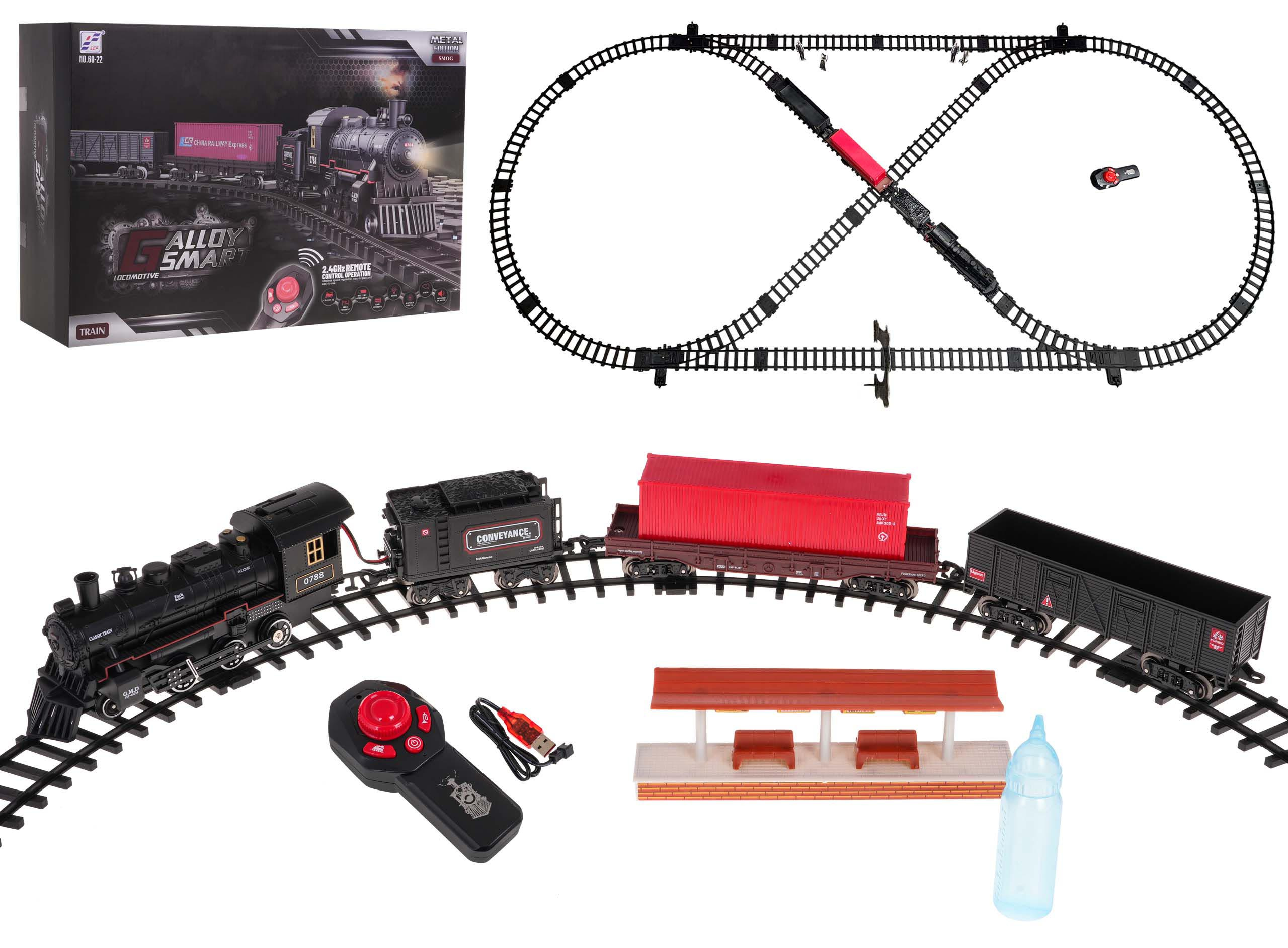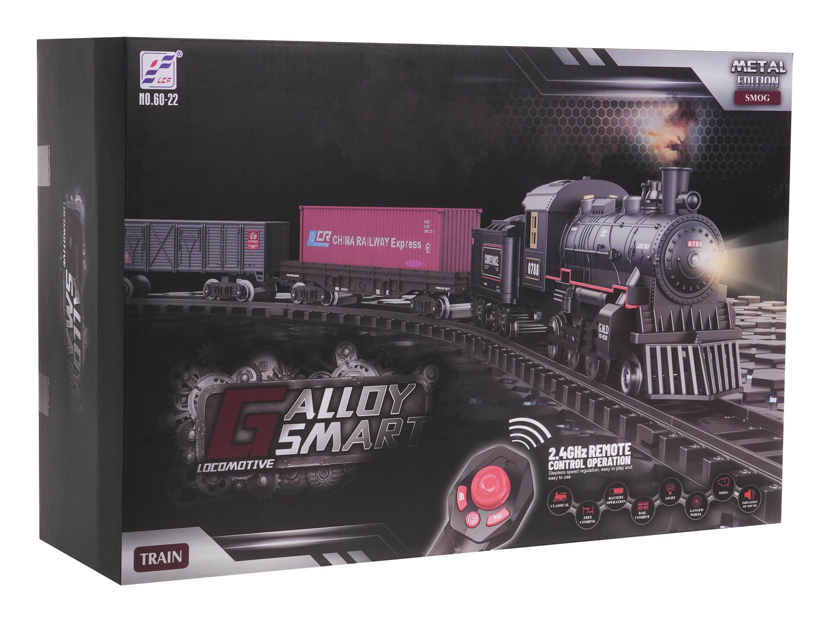 | - lokomotiva, - vůz s uhlím, - kontejnerový vůz, - zvířecí vůz, - součásti trati, - dálkové ovládání 2,4 GHz, - 3,7V baterie, - vodní pipeta, - nabíjecí kabel USB, - návod k použití, - stanice, - kartonové dekorativní prvky: hory, město, most, strom, semafory, dopravní značky, 5 figurek |