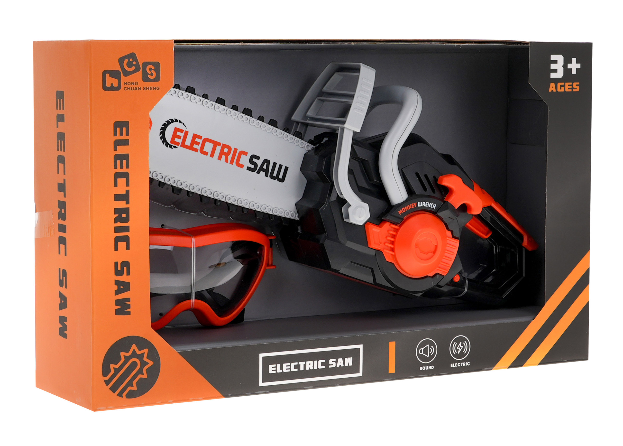 Sada mechanické pily se zvukovými efekty a ochrannými brýlemi je určena pro děti od 3 let. Pila je pro děti zcela bezpečná. Je vyroben z nejkvalitnějšího plastu a nemá ostré hrany. Řetěz byl vyroben z gumy. Chcete-li pilu spustit, stiskněte tlačítko ve spodní části hračky a poté stiskněte oranžové tlačítko, které se nachází na spodní straně rukojeti pily. Poté uslyšíme zvuk zapalování a běhu motoru. Pokud naopak stisknete a podržíte oranžové tlačítko, řetěz se začne otáčet a vydávat řezavé zvuky. Součástí balení jsou ochranné brýle s gumičkou. Hračka je napájena 3 bateriemi AA 1,5 V, baterie nejsou součástí balení.