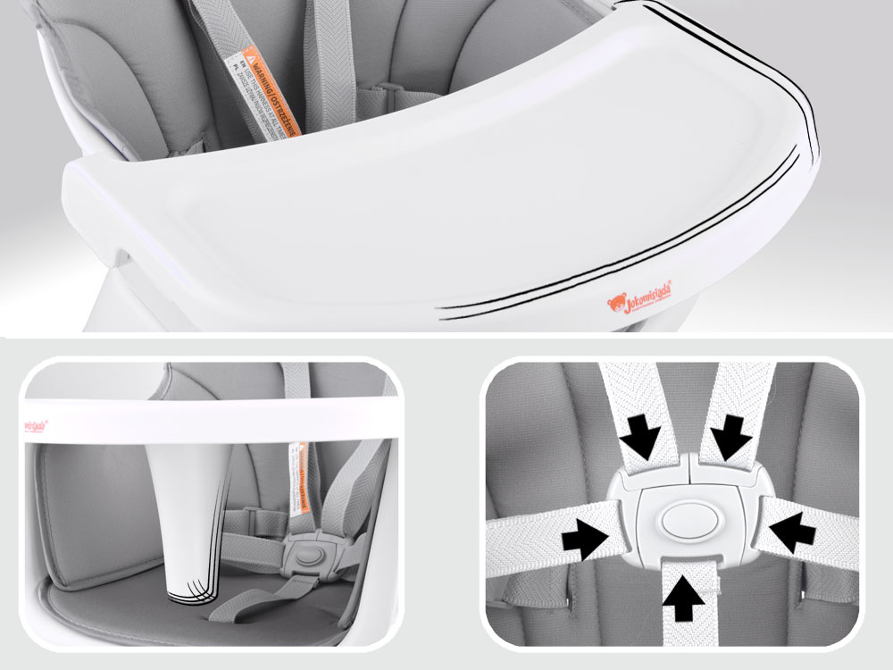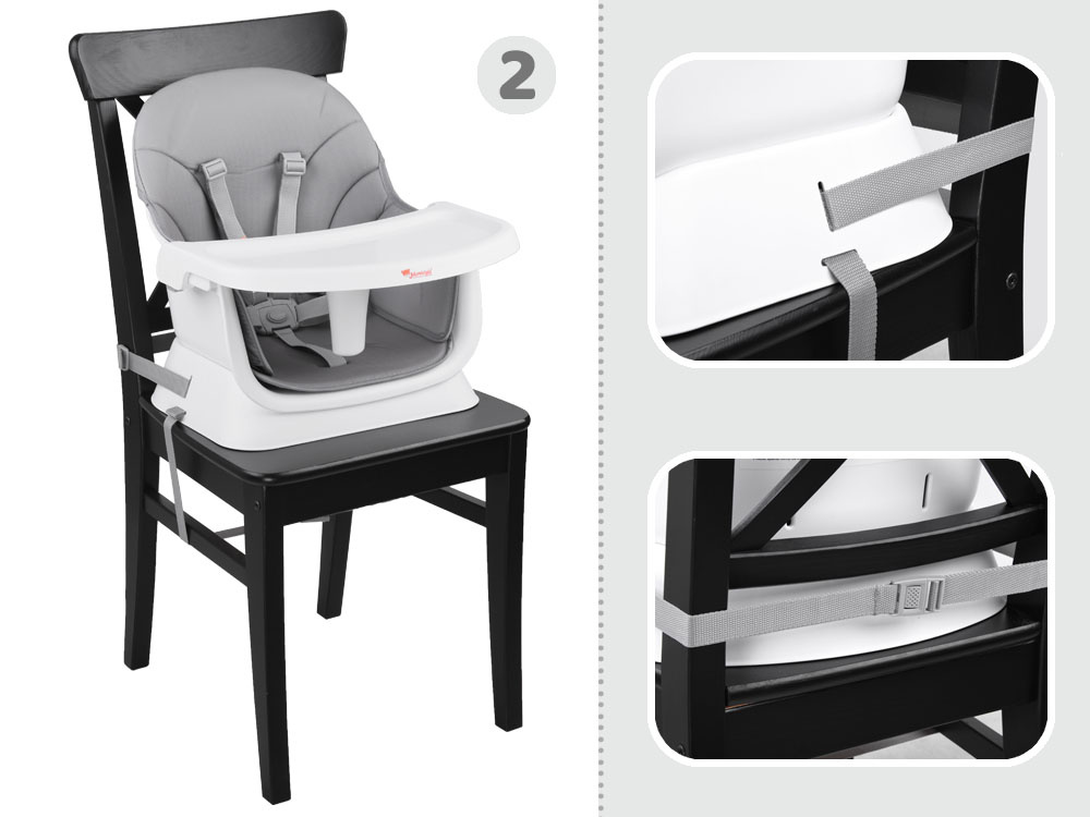 Sedačka má jednoduchou montáž, takže nezpůsobí žádné potíže při úpravě nábytku. Vše funguje na jedno kliknutí, je stabilní a bezpečné. Samotná autosedačka má pětibodové bezpečnostní pásy a pojistku mezi nohama dítěte, která zabraňuje sklouznutí dítěte. Popruhy pro připevnění sedačky k židli jsou pevné, takže dítě může sedět s rodiči u stolu a společně konzumovat jídlo.