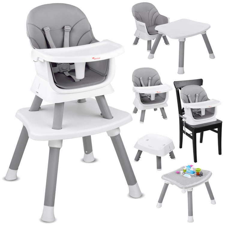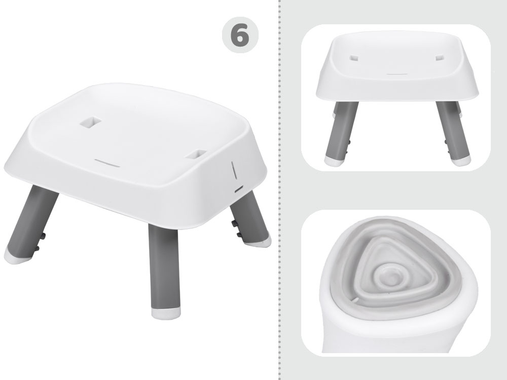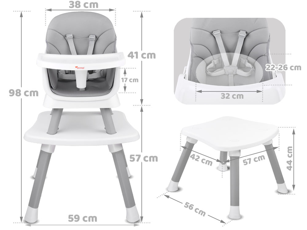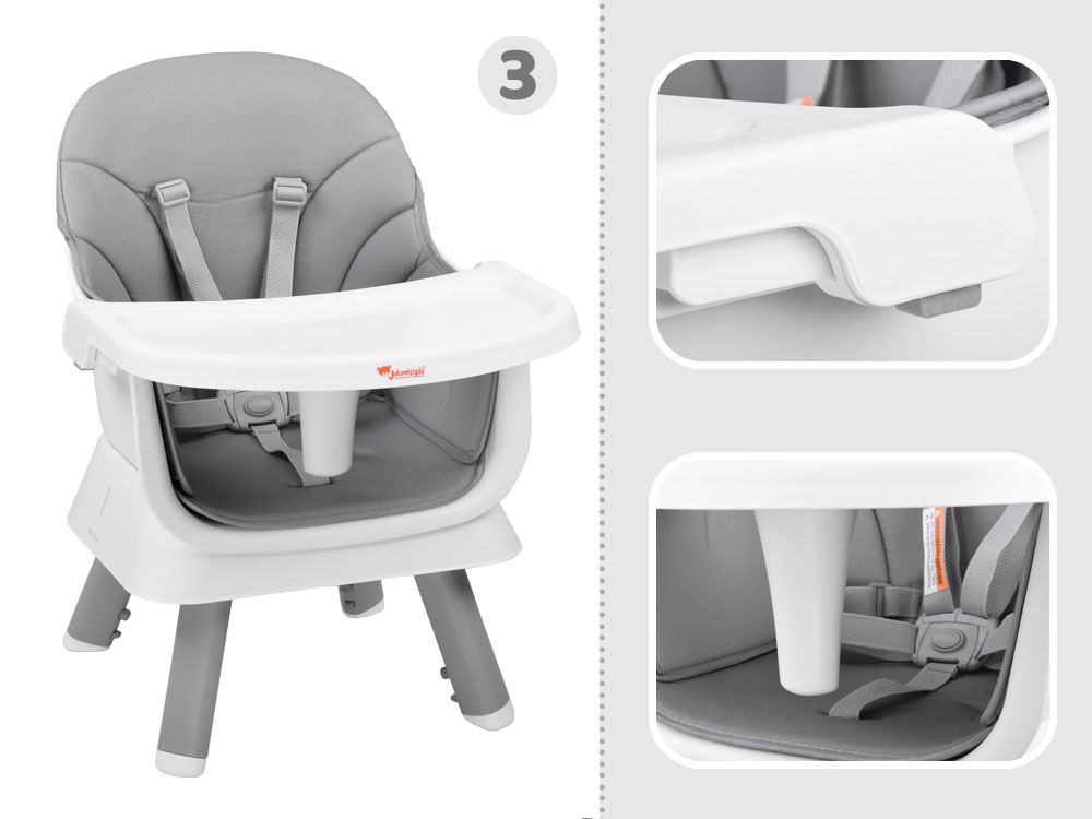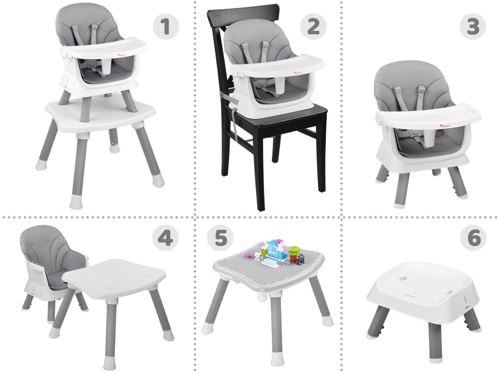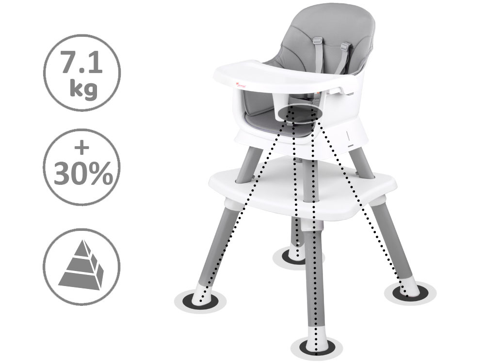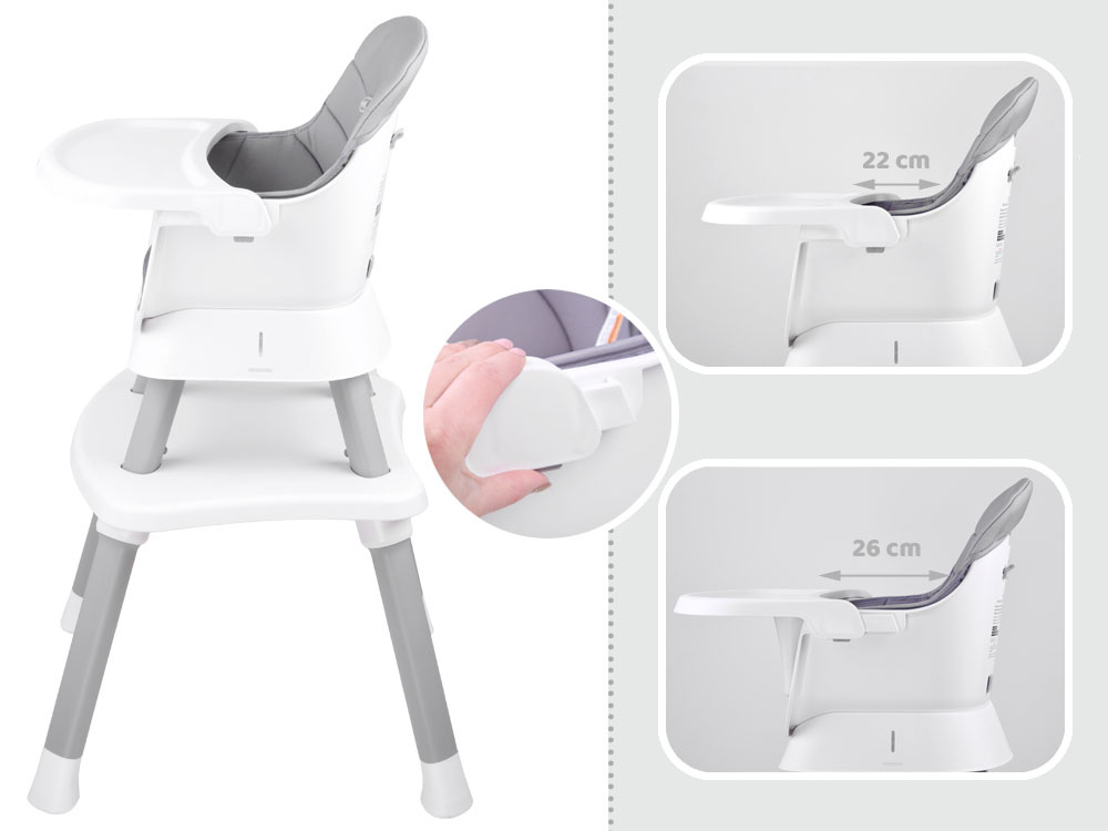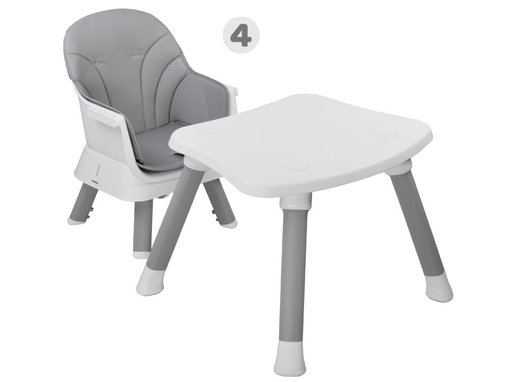 Židlička na krmení je sada 6v1 ideální pro děti již od 6 měsíců, které začaly samostatně sedět. Modulární nábytek v moderním stylu se hodí do každého dětského pokoje, obývacího pokoje nebo kuchyně. Díky své variabilitě se hodí k jídelnímu stolu i do dětského koutku. Pohodlné sedadlo, správně tvarované, s pětibodovými bezpečnostními pásy a protiskluzovým zámkem. Čalounění sedadla je prodyšné a vyrobené ze snadno čistitelného materiálu, což je důležité pro udržení čistoty nábytku. Nábytek má odnímatelný, snadno čistitelný podnos. Nohy židle mají protiskluzové podložky. Tento multifunkční kus nábytku poroste s dítětem a snadno se přizpůsobí potřebám dané situace.