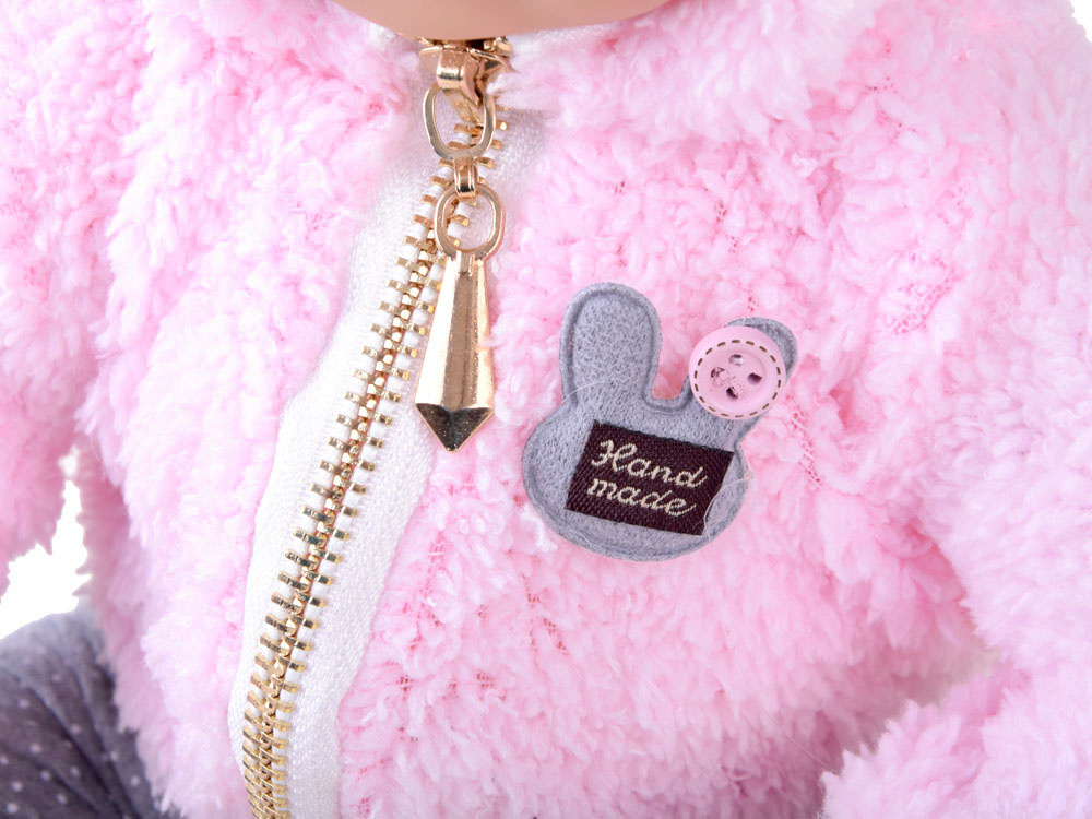 Panenka vypadá jako novorozeně. Má měkké látkové bříško a hlava, ruce a nohy jsou vyrobeny z tvrdé gumy. Když panenku položíte, zavřou se jí oči. Stejně jako skutečné dítě nemá na hlavě žádné vlasy, ale před chladem ji chrání teplá, na dotek příjemná růžová mikina. Celý outfit doplňují stylové šedé legíny s puntíky.