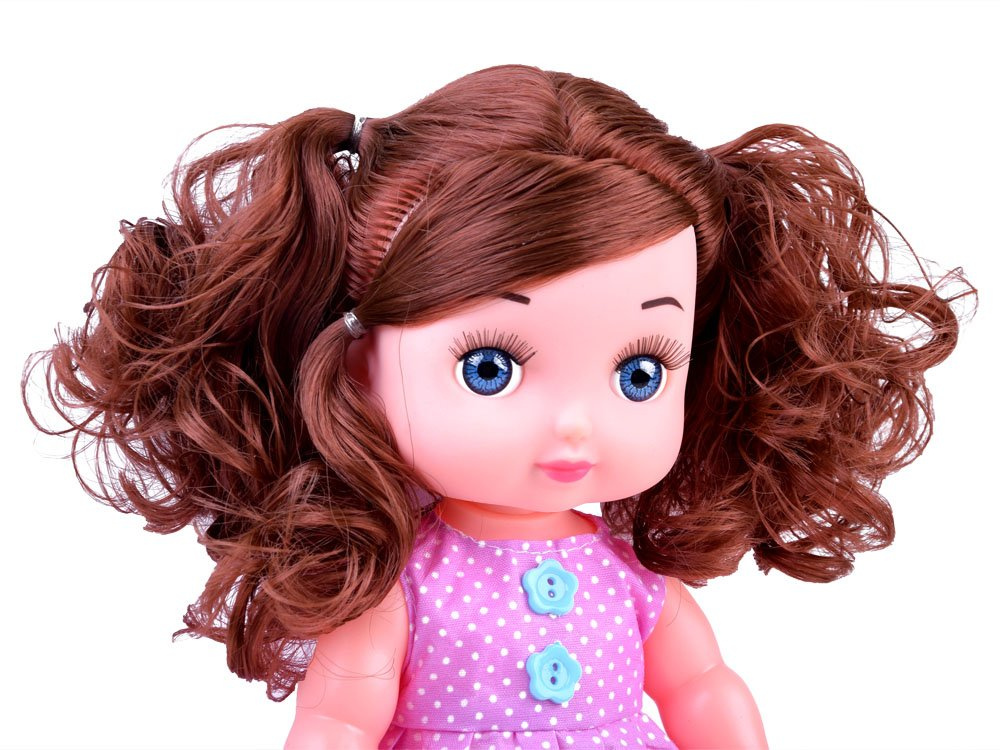 Krásná panenka má dlouhé kudrnaté vlasy, které se skvěle češou. Pozornost upoutají její velké modré oči obklopené vějířem řas. Trup je vyroben z kvalitního plastu příjemného na dotek.Barevný oděv je ušit esteticky a s důrazem na detail. Boty panenky jsou odnímatelné.