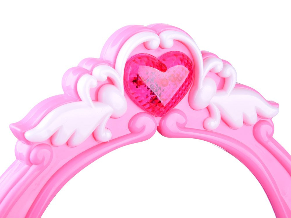 Rozkošná sada toaletního stolku se židlí a doplňky se bude dobře vyjímat v každém dívčím pokoji. Sada je celá vyrobena z plastu v krásné růžové barvě. Na toaletě je zrcadlo s kouzelným tlačítkem ve tvaru srdce, které skrývá kouzelný zvuk.