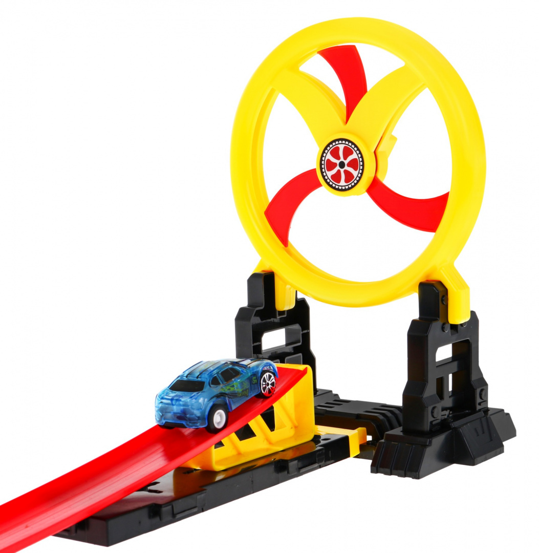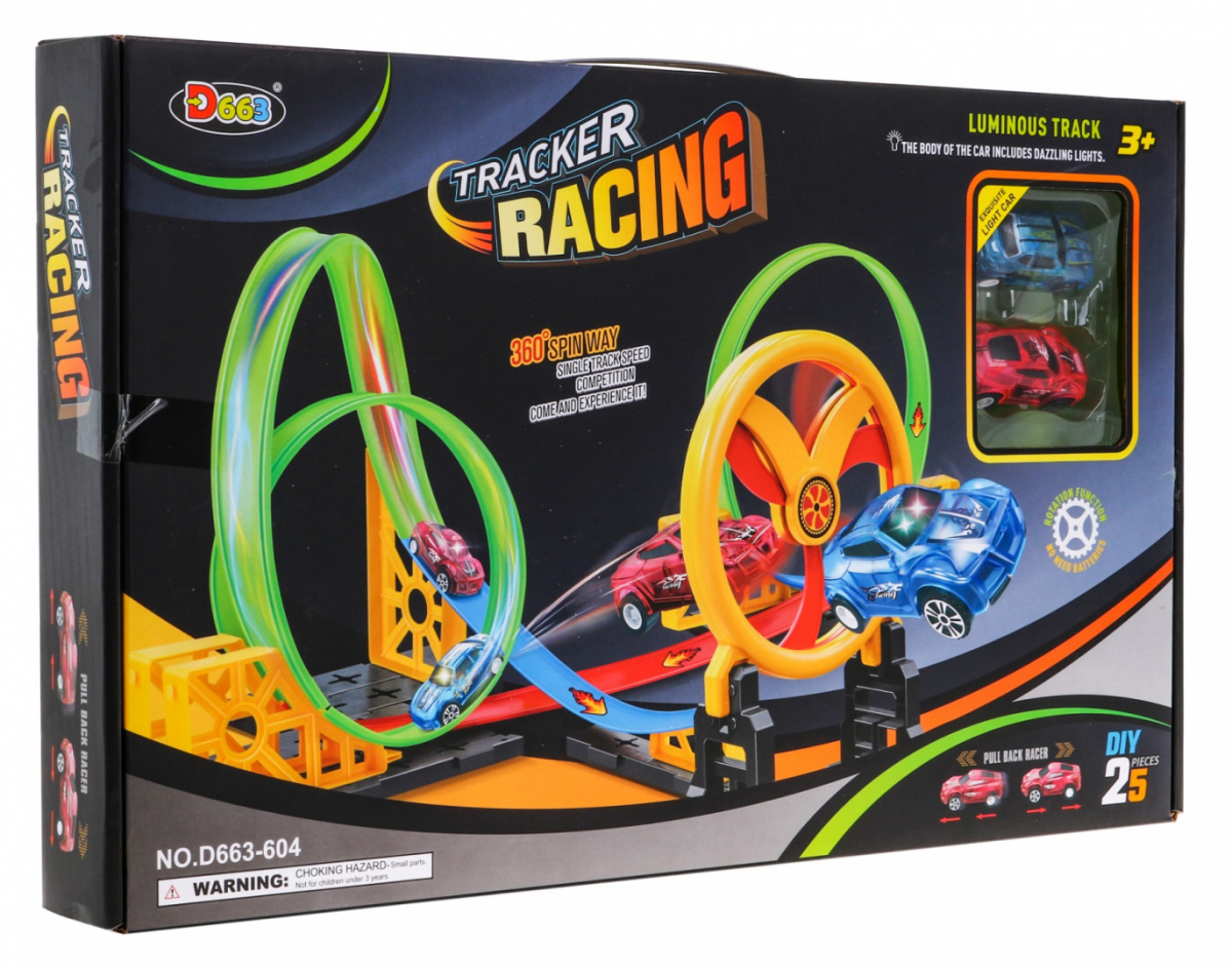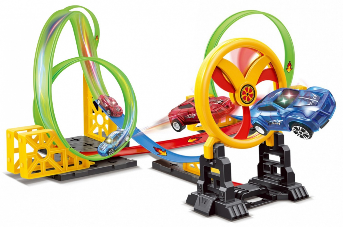 Závodní dráha se dvěma autíčky, smyčkami a pohyblivou obručí na skákání je vhodná pro děti od 3 let. Autíčka jsou poháněna 3 bateriemi AG13, které jsou součástí sady, jezdí na pohon a mají LED světla. Dráha se snadno pokládá, nezabírá mnoho místa a snadno se používá. Stačí jen zrychlit auto po dráze, které pak udělá tři smyčky a přeskočí zábradlí. Zábradlí je pohyblivé, což znamená, že se přes něj auto vždy nedostane. Tato hra nikdy nenudí a je velmi zábavná.