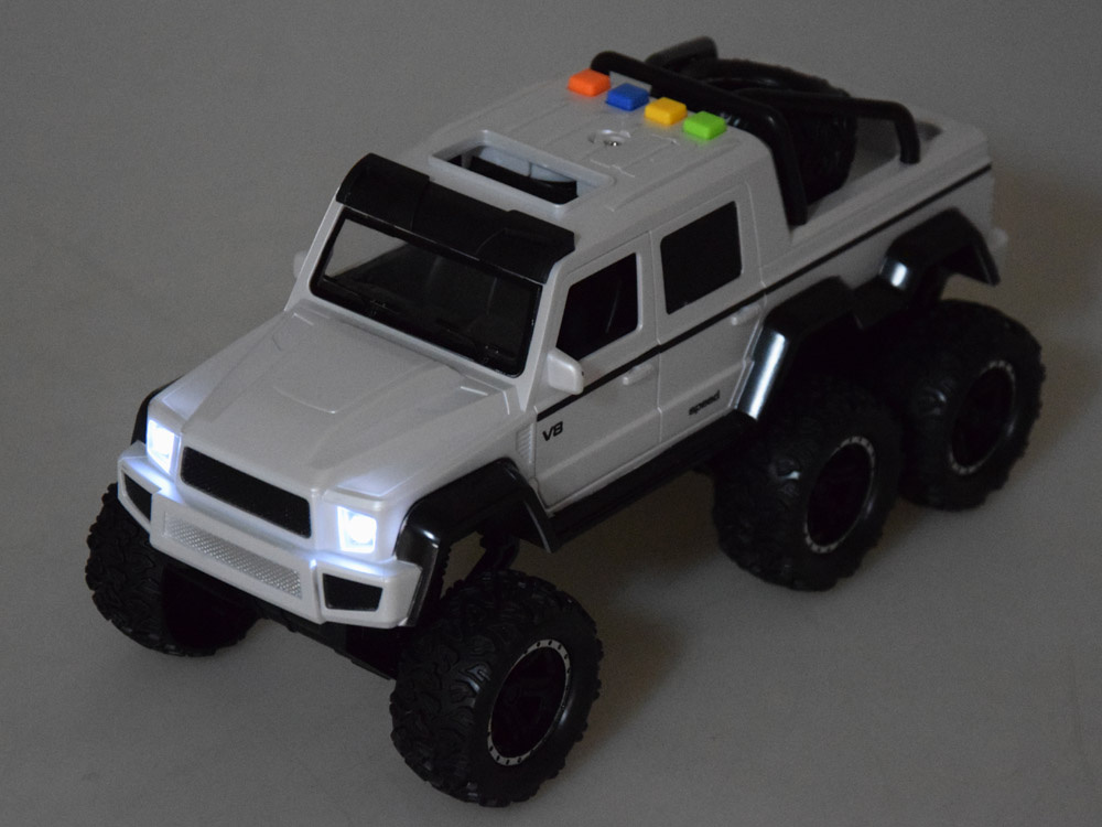 - po stisknutí tlačítka na střeše se ozve zvuk odpovědný za zvuk startu vozidla, klakson, zvuk couvání, zvuk sirény, zvuk dálkového ovládání