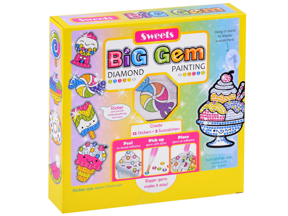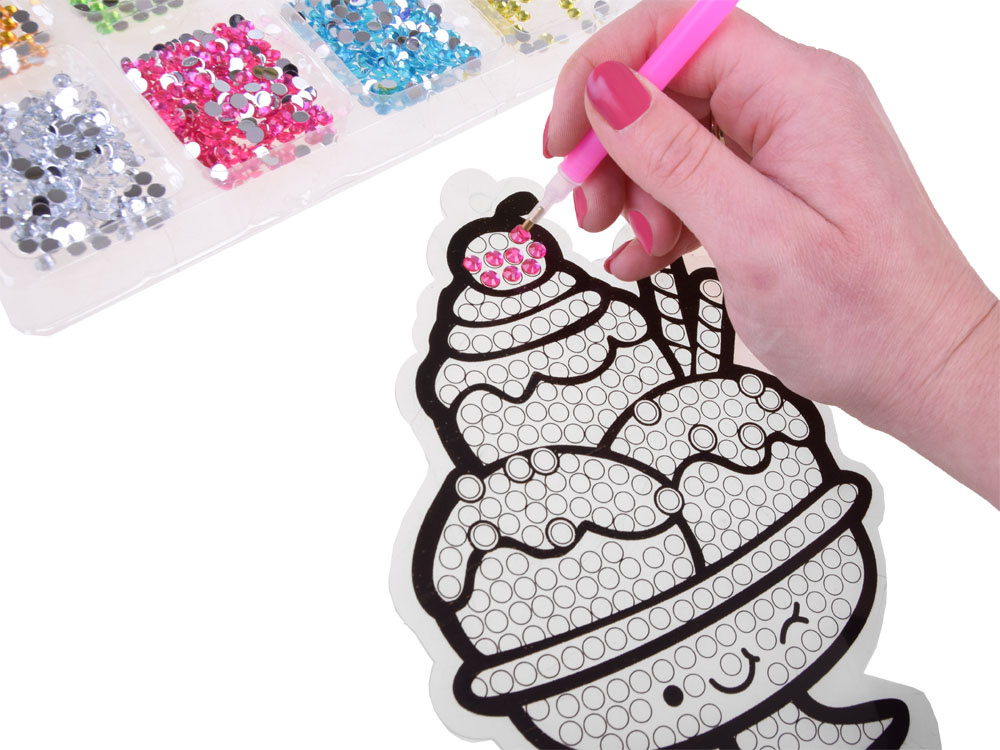 Kreativní sada s diamantovou výšivkou SWEET je nejmódnější kreativní hrou pro děti v této sezóně. Sada umožňuje vytvářet nádherné vzory s pohádkově barevnými diamanty. Hra spočívá v přiřazování správných barev diamantů a jejich přenášení na šablonu pomocí lepidla a speciálního pera. Po uspořádání dílků vznikne nádherná barevná dekorace. Pomocí přiložených plastových talířků a silikonových přísavek s háčky lze hotová díla umístit například na zeď. na psacím stole, na poličce, zavěsit je na sklo či zrcadlo nebo si jimi ozdobit oblíbený sešit, složku či diář.