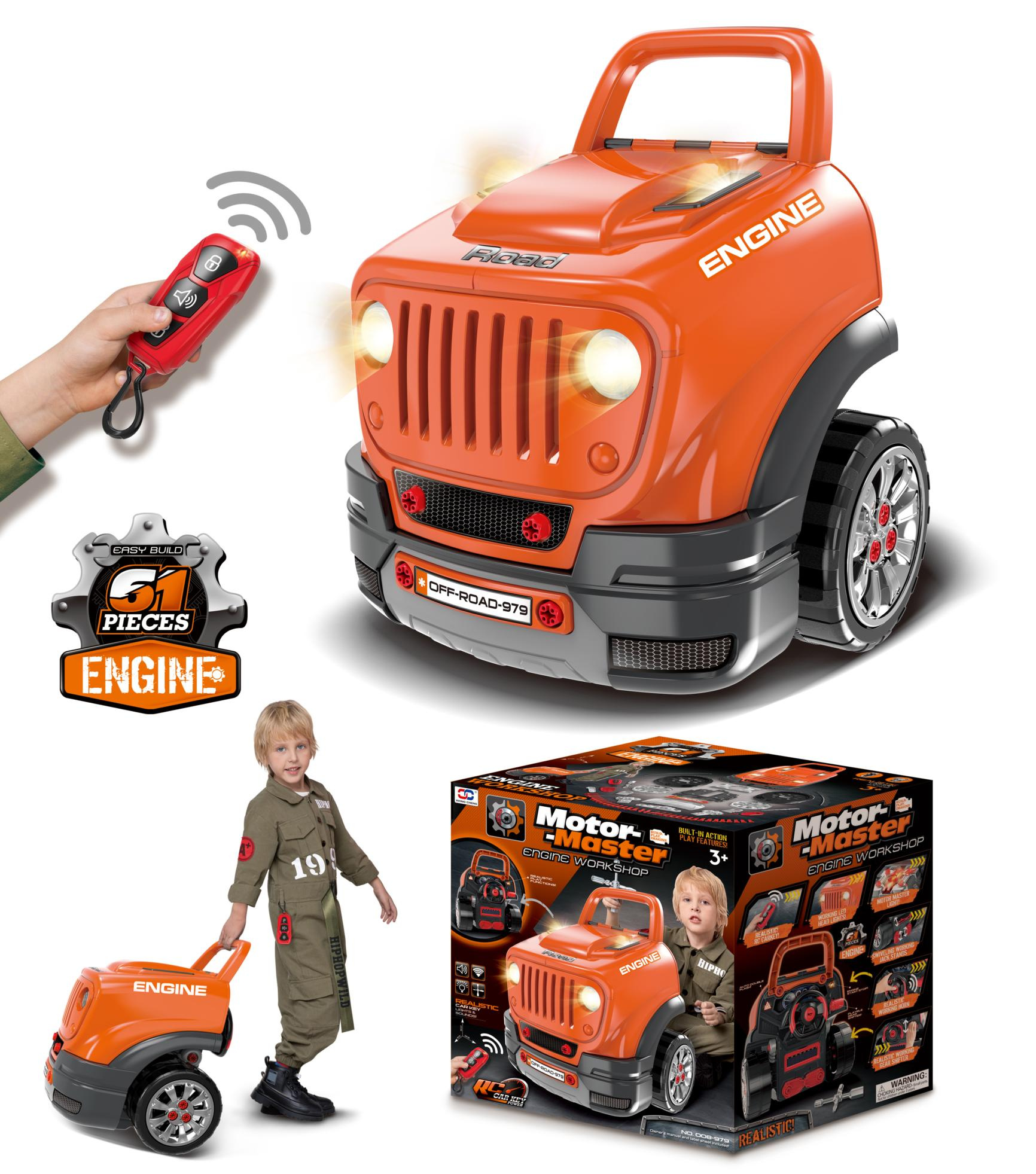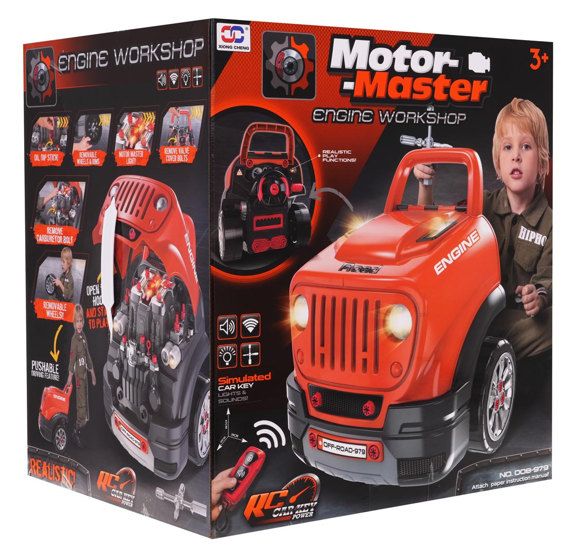 Interaktivní hračka, přední část nákladního auta se zvedací kapotou a palubní deskou určená pro děti od 3 let. Sada obsahuje prvky nákladního auta a nástroje potřebné k montáži a demontáži částí, jako je šroubovák nebo klíče. Pod kapotou nákladního auta se nachází velký rozebíratelný motor, který si dítě může rozložit na jednotlivé části. K výměně se také hodí zapalovací svíčky a kola. Na palubní desce se nachází tlačítko startu vozidla se zvuky startování motoru, pohyblivý volant s klaksonem a výstražný signál. Pod volantem je umístěna přihrádka, do které lze vložit všechny potřebné nástroje, šrouby, knoflíky. Automobil je vybaven automatickou převodovkou - má řadicí páku jako ve skutečném vozidle. V závislosti na změně řadicí páky na odpovídající převod uslyšíme zvuk například nastartovaného vozidla, zvuk jízdy nebo při zpátečce zvuk couvání. Sada obsahuje dálkový ovladač ve tvaru klíčů od auta, který umožňuje ovládání světelných modulů (svítící reflektory a horní část motoru) a zvukových modulů (zvuk otevírání a zavírání auta, klakson). Hračka má pohodlnou rukojeť pro přenášení. Napájení bateriemi typu 3 x AA 1,5 V – auto (není součástí balení), CR2025 3V – dálkový ovladač (v balení). Hračka pro malého mechanika rozvíjí manuální dovednosti, jemnou motoriku a koordinaci oko-ruka.