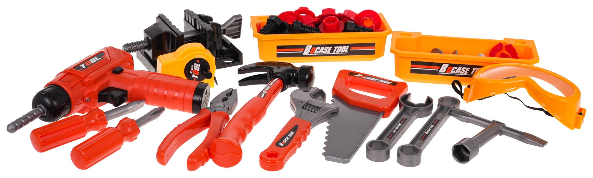 Mezi četným nářadím jsou klíče , kladivo , kleště , pila a svinovací metr – vše, co potřebujete k vytvoření zajímavých projektů. Pracovní stůl má ručně ovládaný svěrák a je lehký a snadno přenosný, takže si s ním vaše dítě může hrát na různých místech.