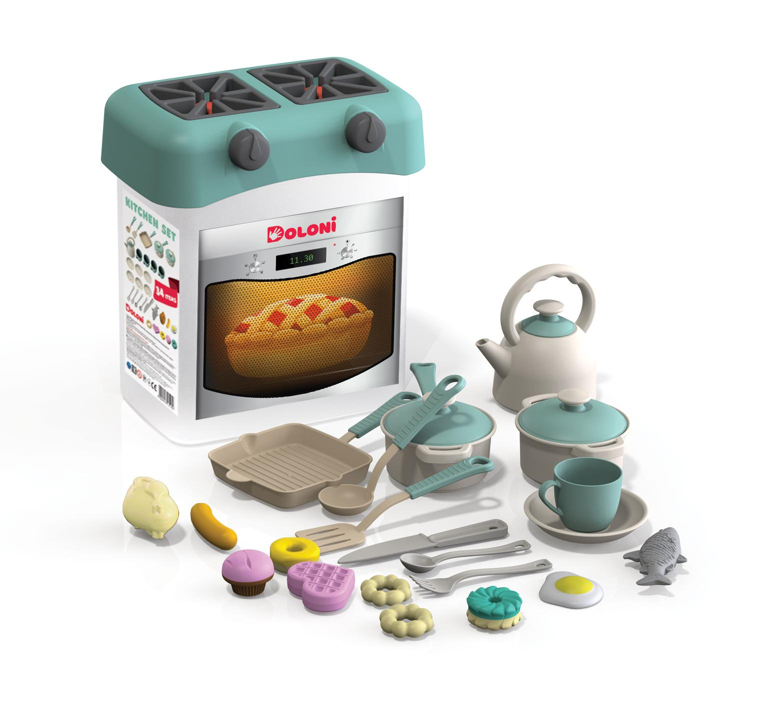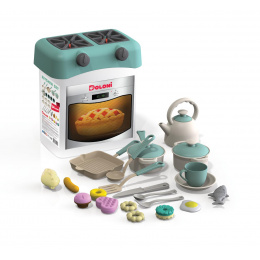 Tento model dětské kuchyňky je vybaven 34 doplňky - čajník s poklicí, 6x talíř, 4x sklenice, 2x vidlice, 2x lžíce, nůž, naběračka, špachtle, kastrol s rukojetí a poklicí, hrnec s poklicí, pánev, klobása, ryba, míchaná vejce, kuře a 5x sušenka.