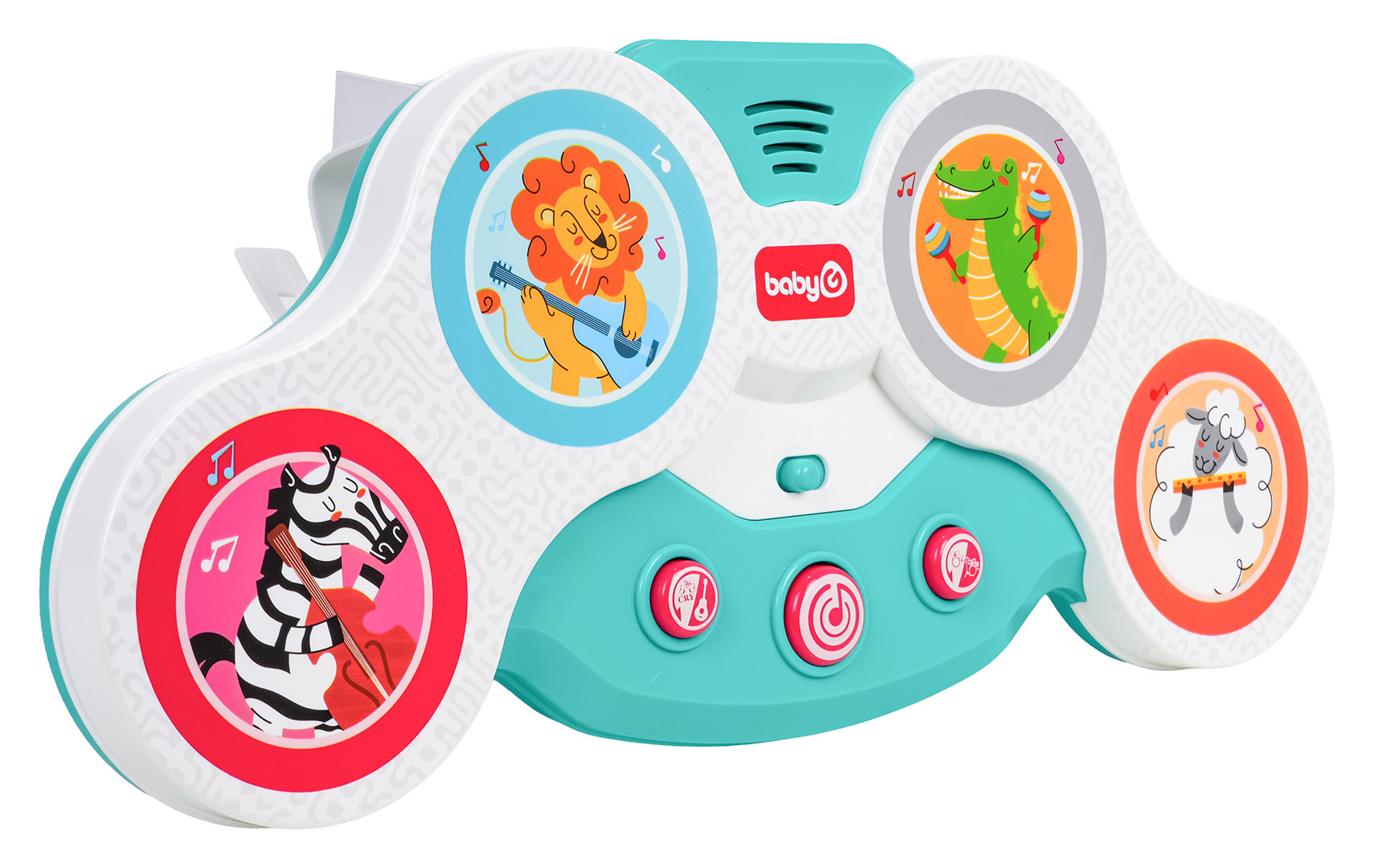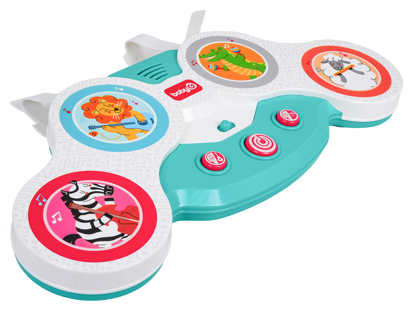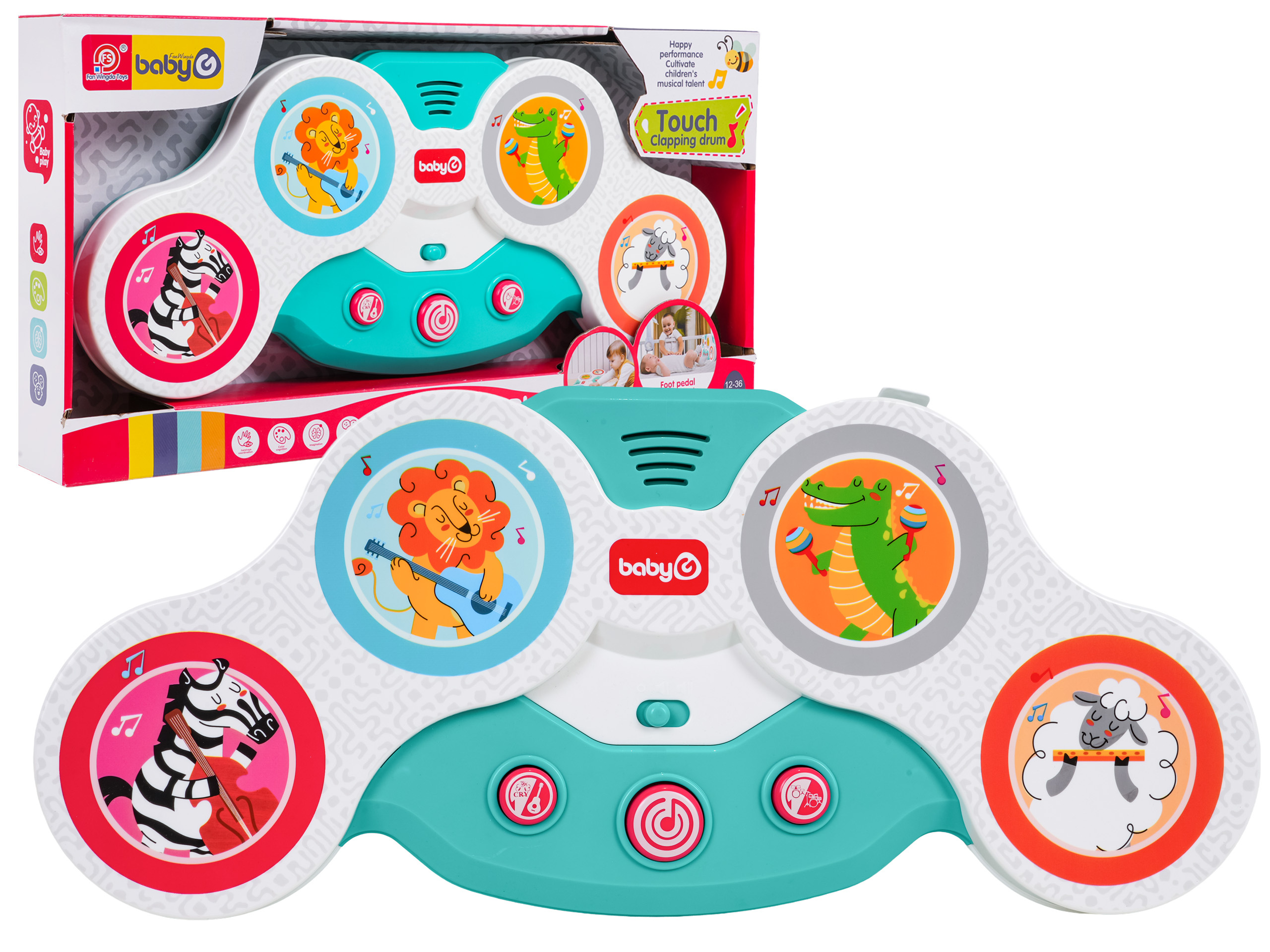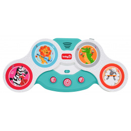 Interaktivní dotyková bicí souprava pro nejmenší od dvanáctého měsíce života. Hračka je vyrobena z nejkvalitnějších materiálů a nemá ostré hrany. Zvukové efekty a bohatství barev stimulují smysly dítěte na mnoha úrovních. Dotykové bubny mají barevné obrázky veselých zvířátek: zebry, lva, krokodýla a beránka s nástroji. Pod bubny byla umístěna dvoustupňová regulace hlasitosti a níže 3 kulaté tlačítka. Tlačítko s kytarou spouští zvuky nástrojů, které drží zvířátka, a zvuky těchto zvířátek. Tlačítko s notou veselé melodie a tlačítko s bicími její různé zvuky. Hračka je napájena bateriemi typu 3 x AA 1,5V (nejsou součástí balení).