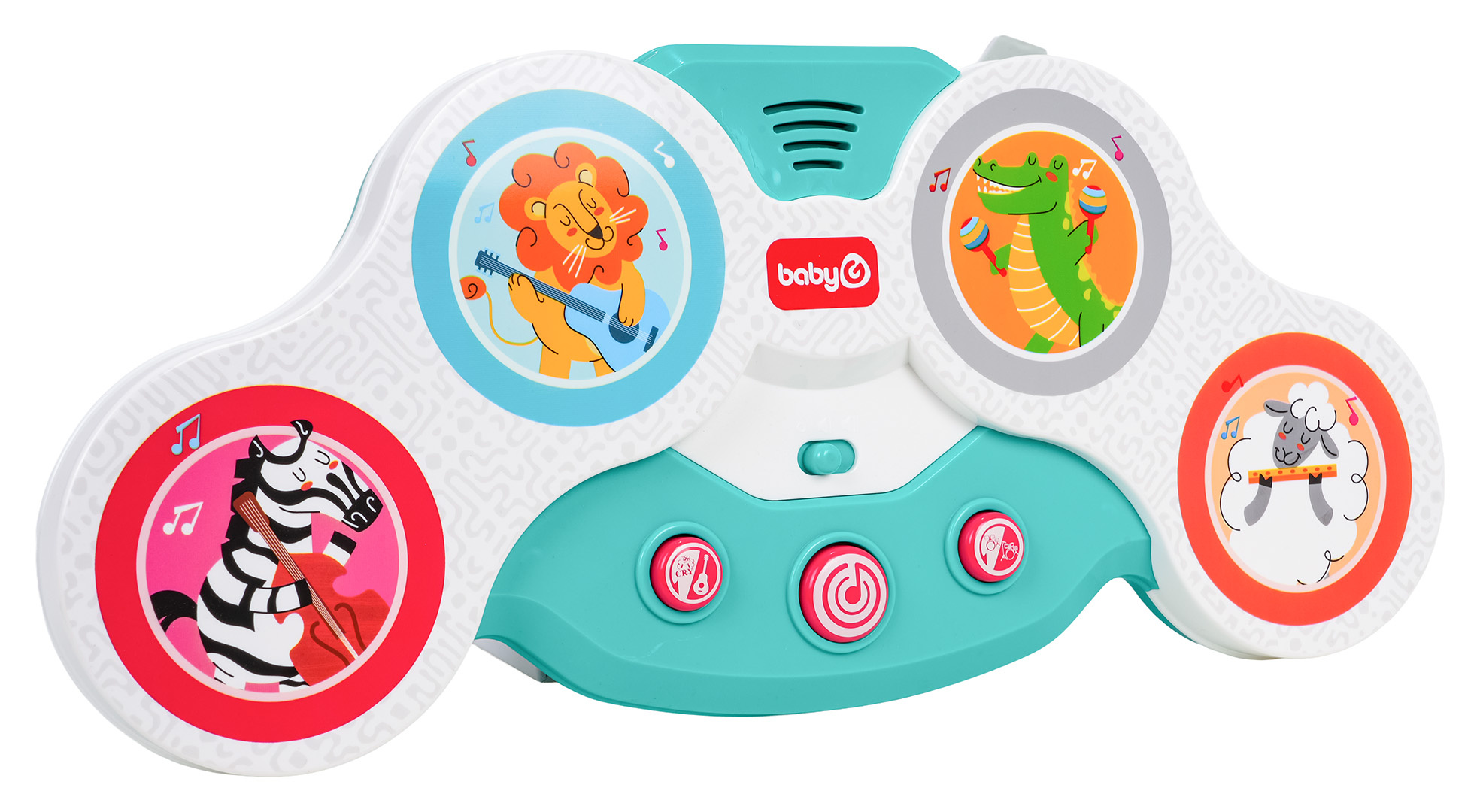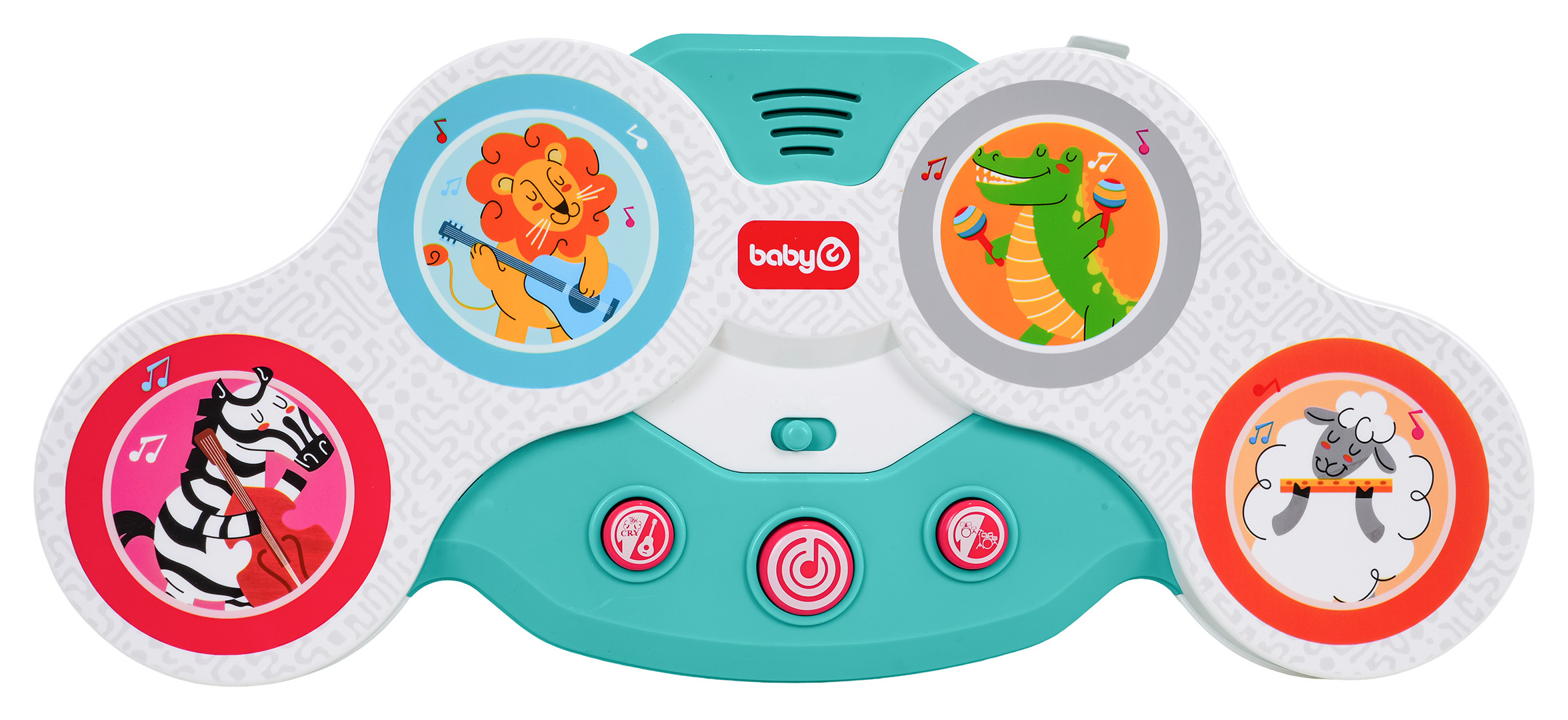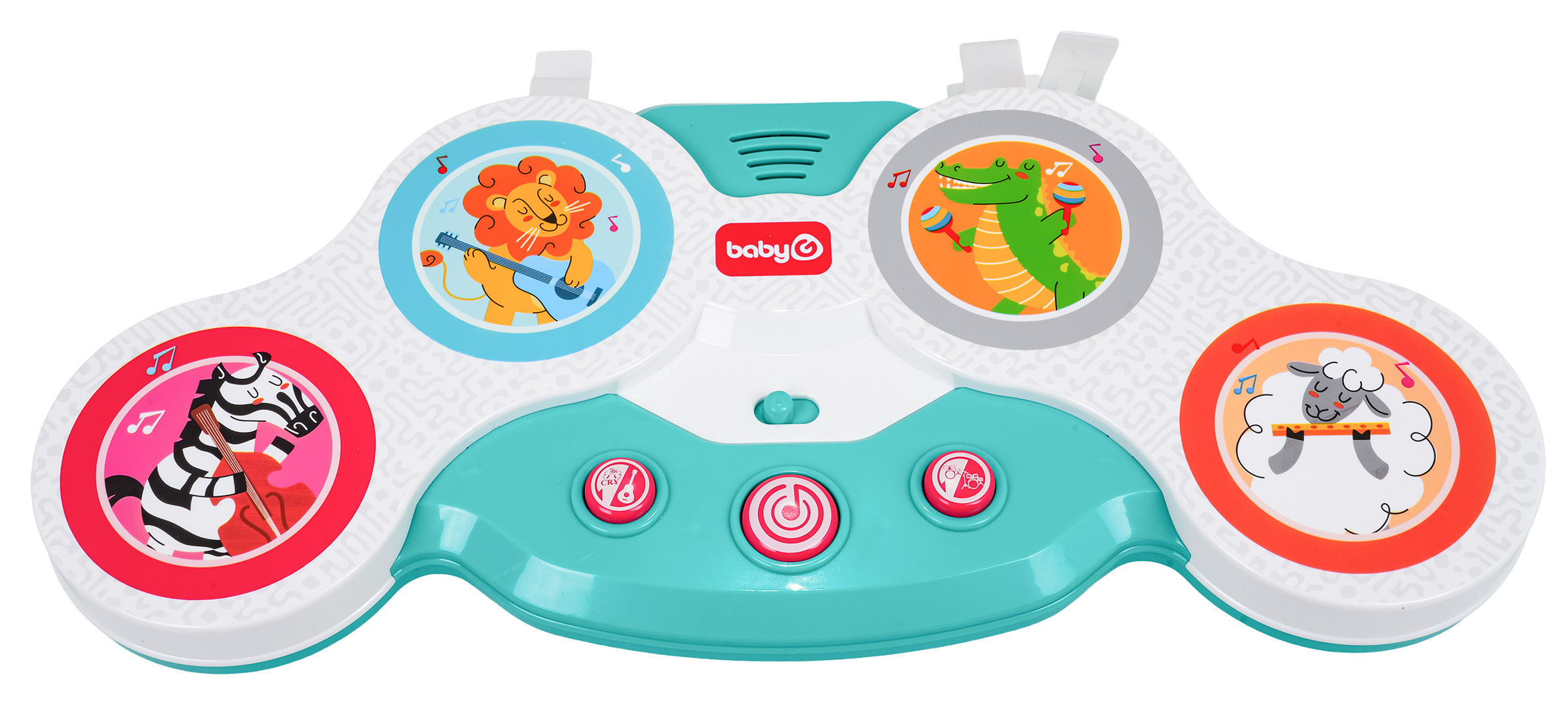 Interaktivní dotyková bicí souprava pro nejmenší od dvanáctého měsíce života. Hračka je vyrobena z nejkvalitnějších materiálů a nemá ostré hrany. Zvukové efekty a bohatství barev stimulují smysly dítěte na mnoha úrovních. Dotykové bubny mají barevné obrázky veselých zvířátek: zebry, lva, krokodýla a beránka s nástroji. Pod bubny byla umístěna dvoustupňová regulace hlasitosti a níže 3 kulaté tlačítka. Tlačítko s kytarou spouští zvuky nástrojů, které drží zvířátka, a zvuky těchto zvířátek. Tlačítko s notou veselé melodie a tlačítko s bicími její různé zvuky. Hračka je napájena bateriemi typu 3 x AA 1,5V (nejsou součástí balení).