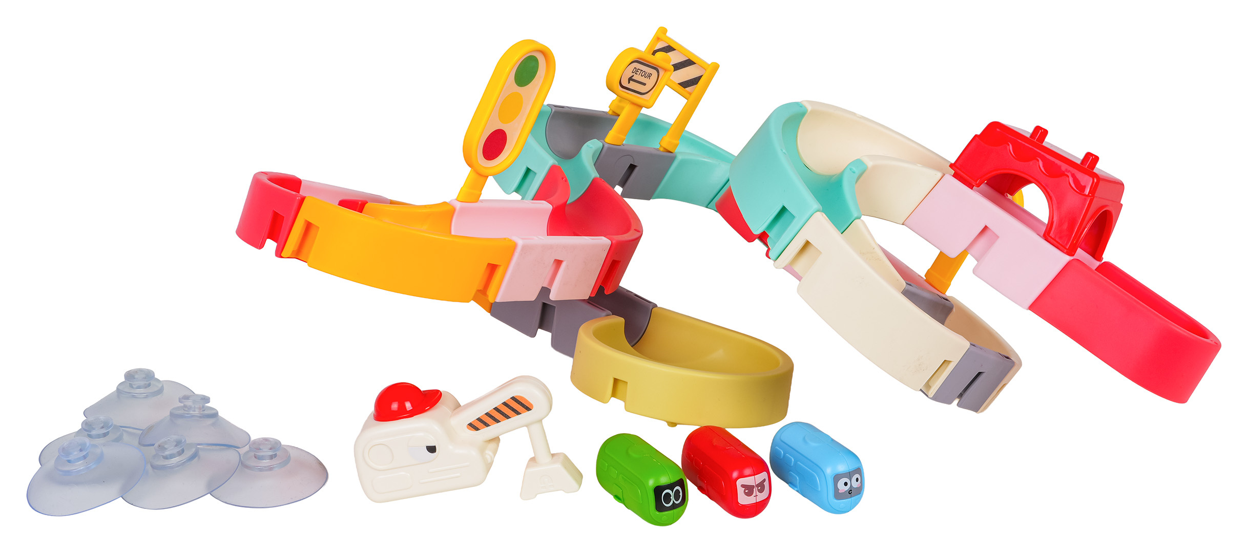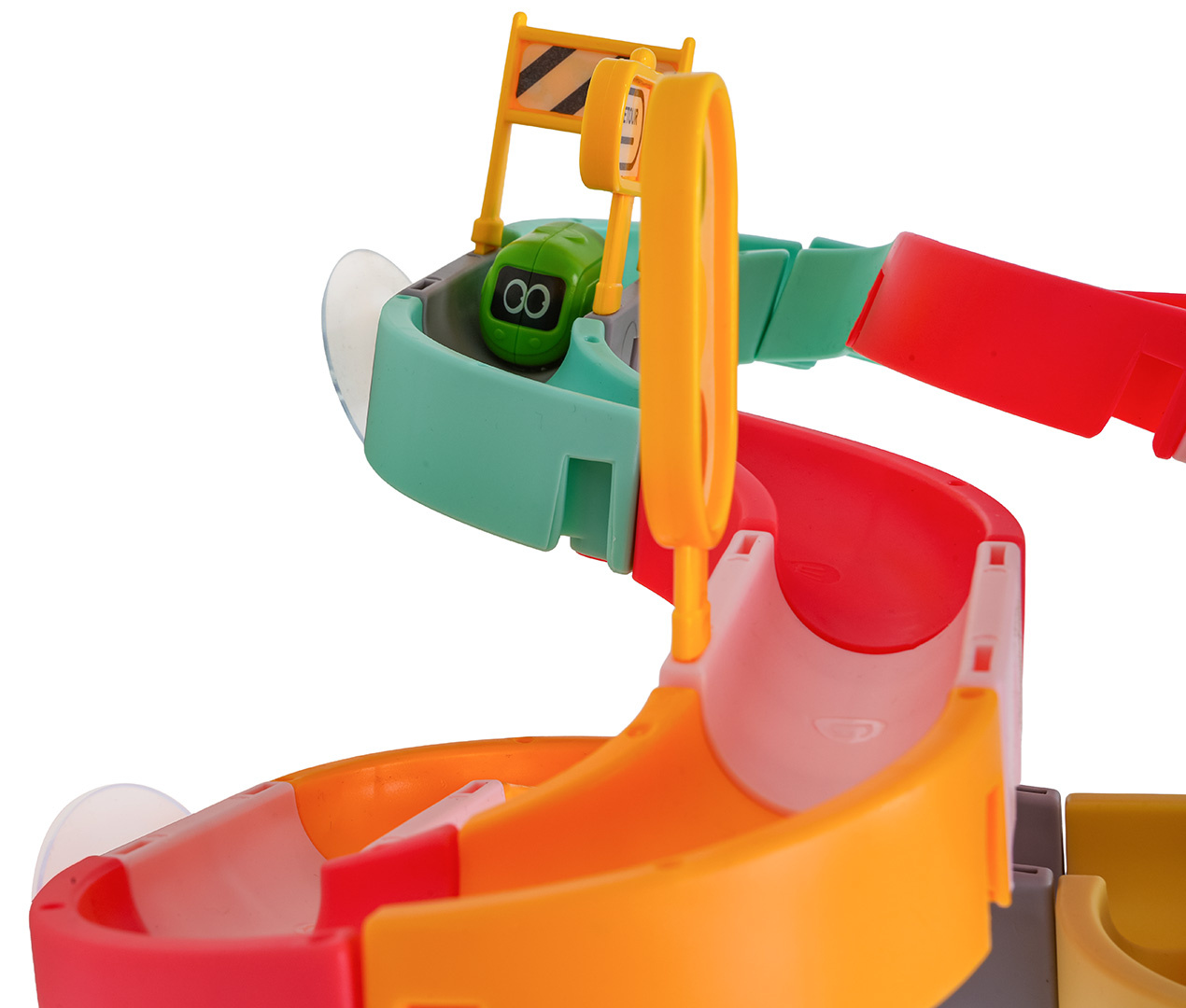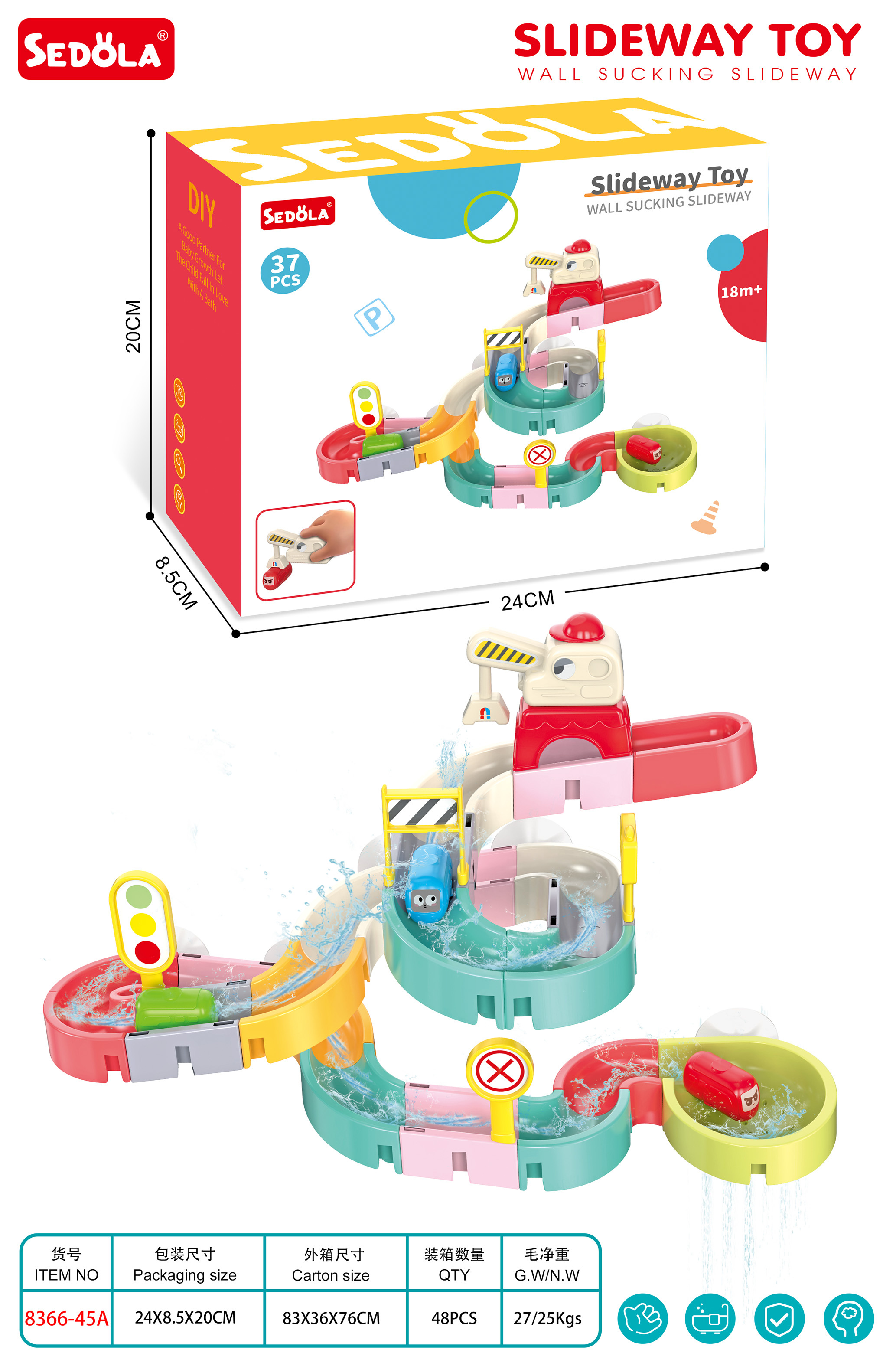 Dráha, skluzavka pro autobusy, pro koupání dětí od osmnáctého měsíce života. Barevná dráha zpříjemní nejednu koupel. Byl vyroben z nejkvalitnějších materiálů, bezpečných pro dítě, v živých barvách. Sada má přísavky, díky kterým ji lze připevnit k vaně nebo jiné rovné ploše. Po umístění autobusů na startovní čáru dráhy je stačí postříkat sprchou a vyrazí po dráze přímo do vody.