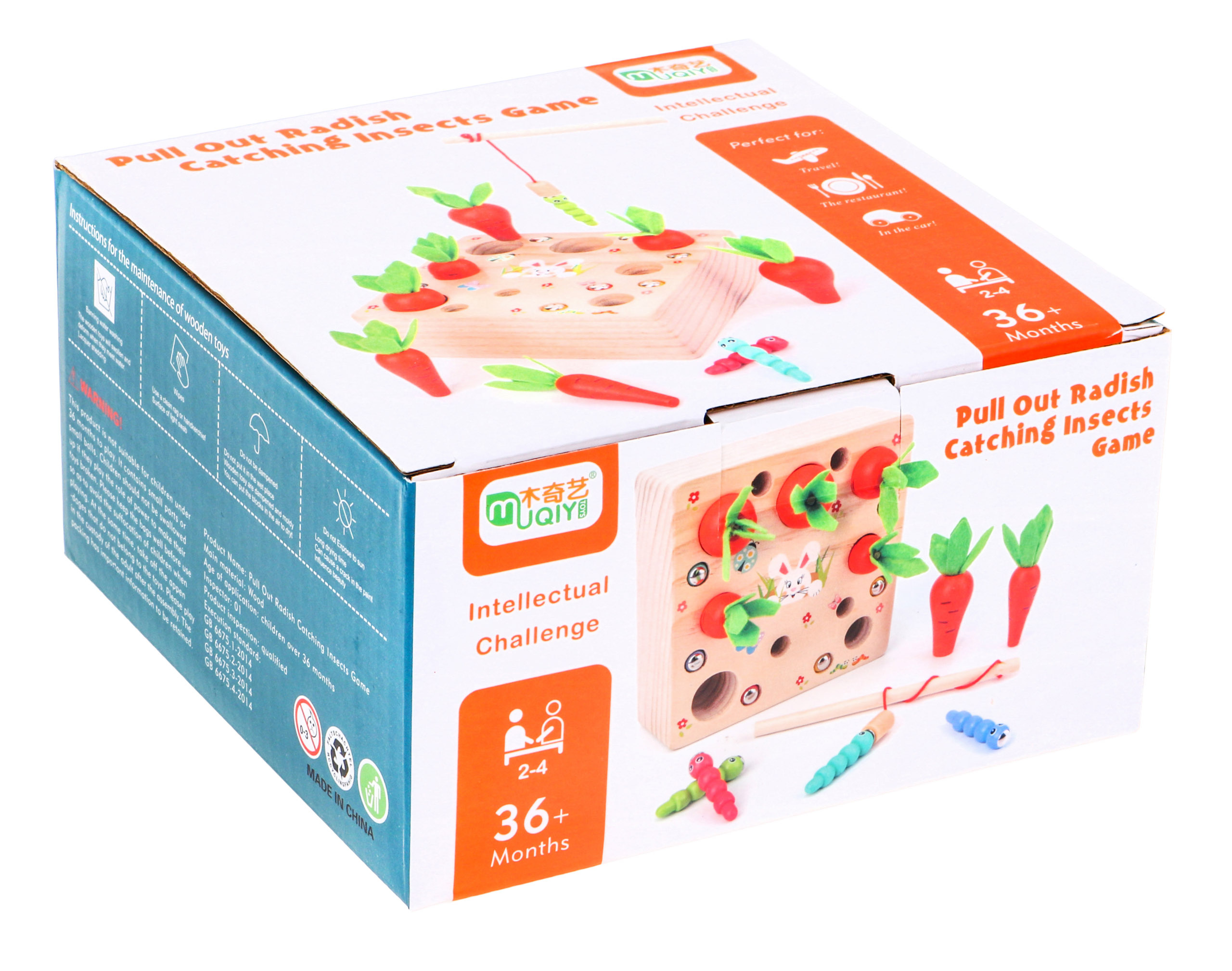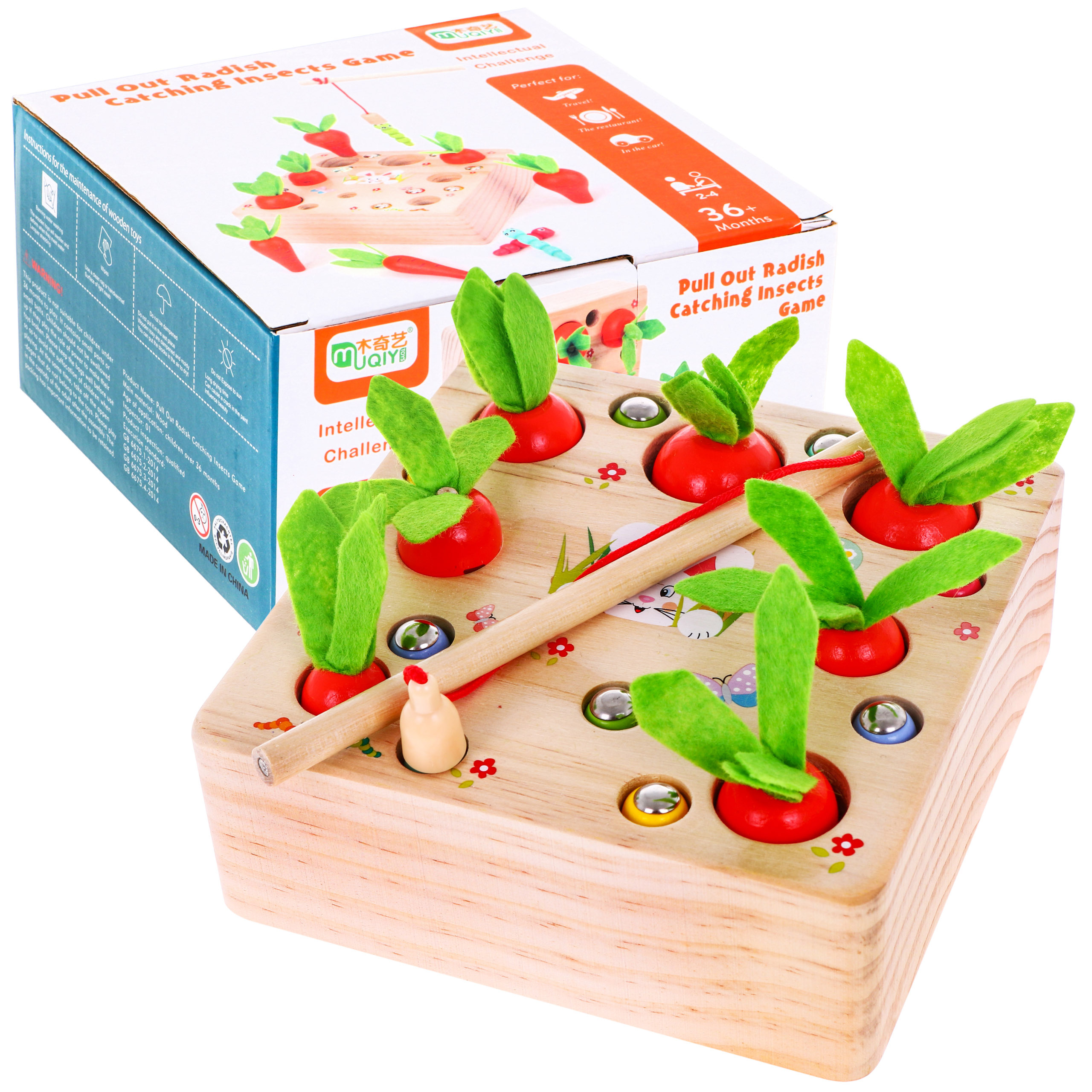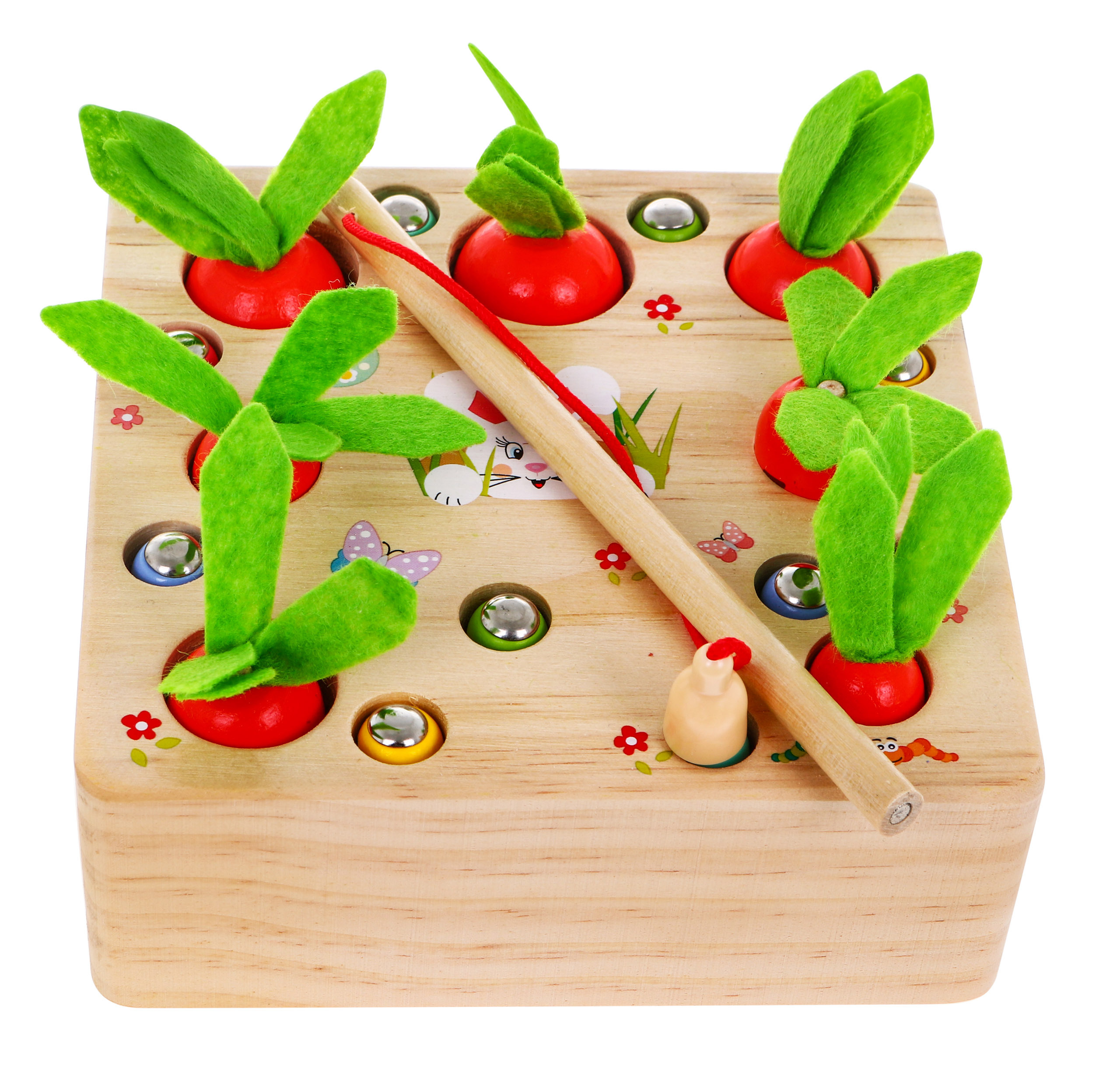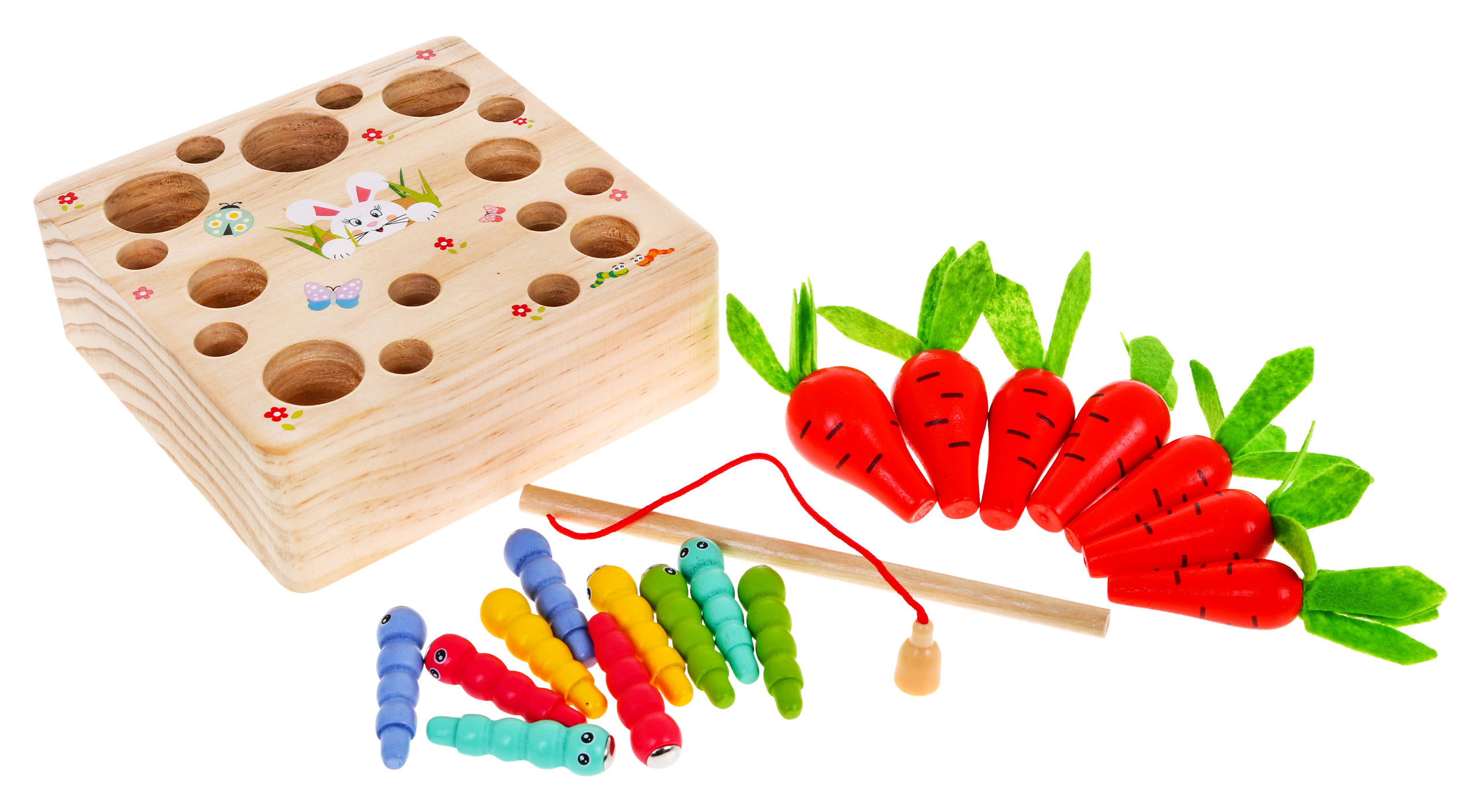 Tato hračka je vhodná pro děti od 3 let. Je vyrobena výhradně ze dřeva a natřena bezpečnými, netoxickými barvami v živých barvách, které přitahují pozornost dětí a vybízejí je ke hře. Hra podporuje rozvoj intelektu a obratnosti. Dítě musí do příslušných otvorů vložit různě velké mrkve a žížaly. Červi jsou zakončeni magnety a sada je dodávána s dřevěným rybářským prutem, který je rovněž opatřen magnetem. Můžete hrát sami nebo ve skupině. Všechny červy odstraňte rybářským prutem, aby neohrožovali rostoucí mrkev, a poté mrkev posbírejte.