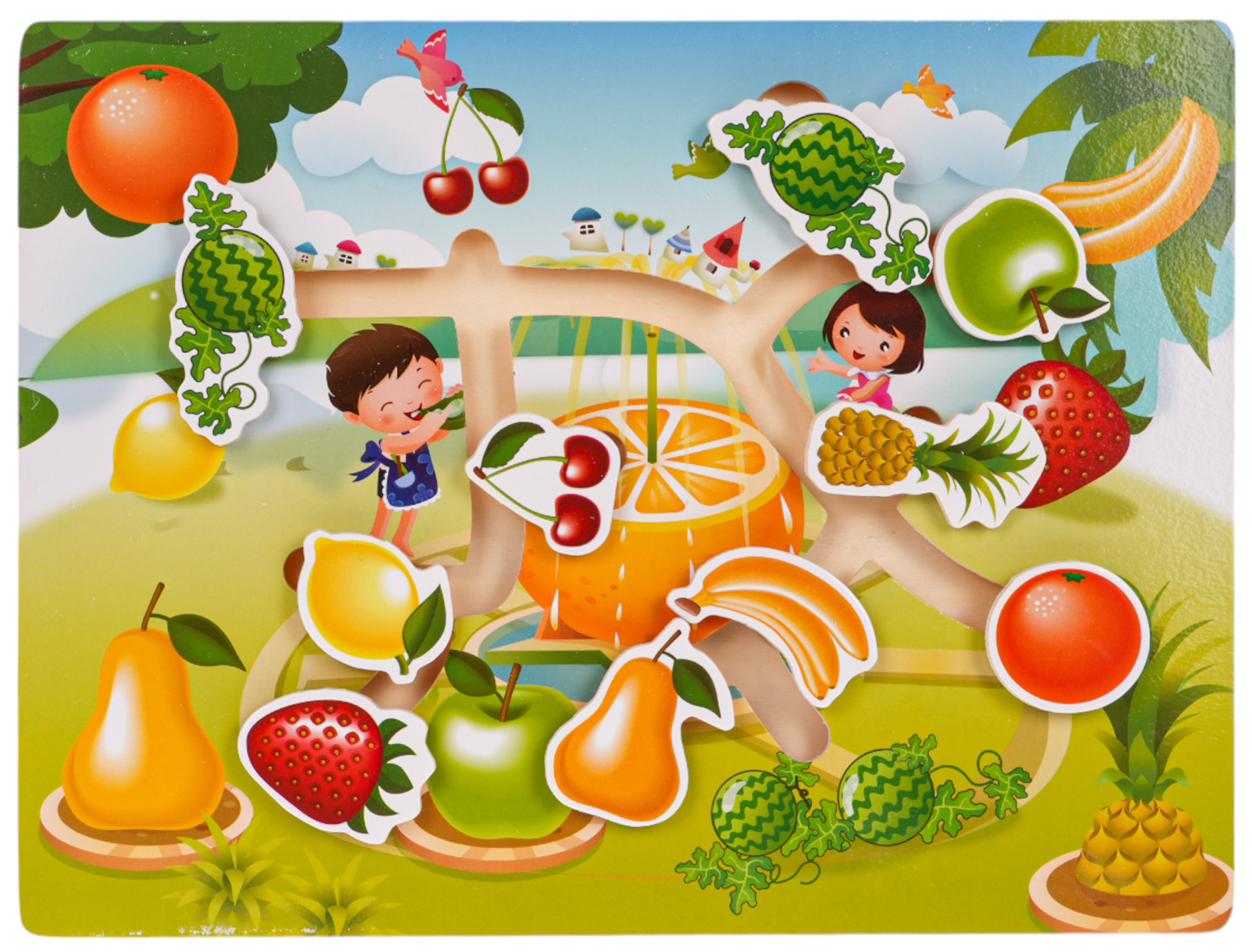 Dřevěná skládačka, překládanka s ovocem pro děti od 3 let. Na dřevěné desce se nachází deset prvků s obrázky ovoce (2 x angrešt, ananas, jahoda, banány, jablko, třešně, pomeranč, citron, hruška), které by měly být umístěny na správná místa na desce. Skládačka procvičuje koncentraci a logické myšlení, učí postřeh, tvary a barvy.