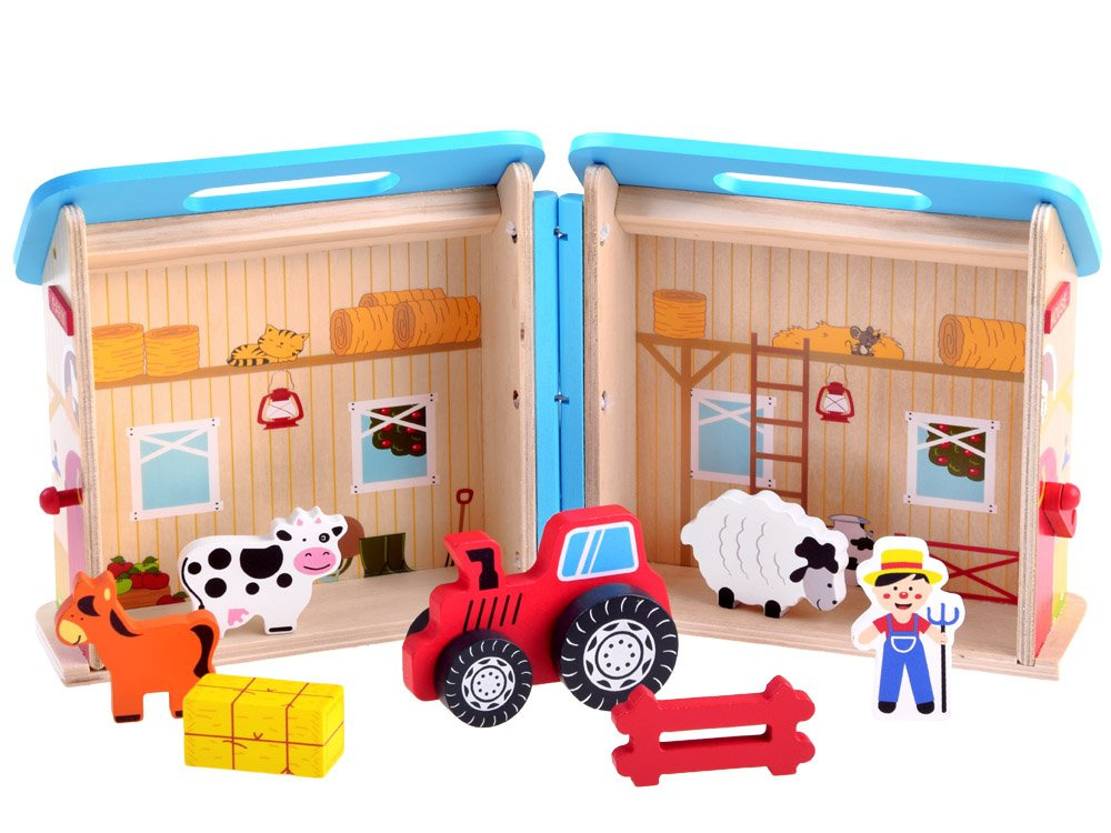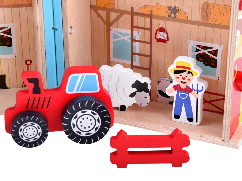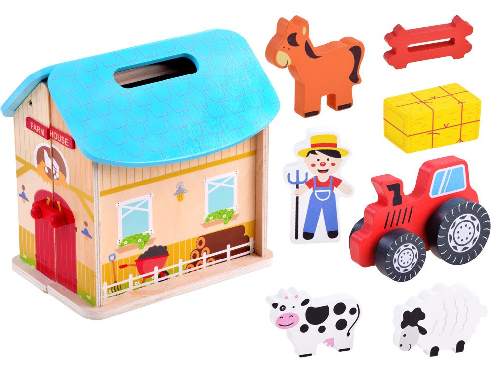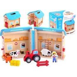 Krásný dřevěný domeček pro zvířata na farmě jistě potěší každého malého farmáře. Farma vyrobená výhradně ze dřeva je stabilní a barevná a poskytne dětem spoustu zábavy na dlouhou dobu. Na farmě žije kráva, beran, kůň a farmář. Dřevěná farma pro děti může být začátkem velkého dobrodružství. Představivost a kreativita batolat nezná mezí. Po skončení hraní lze domeček zavřít, což usnadňuje nejen jeho skladování, ale také přenášení a zajišťuje bezpečnost figurek, které se uvnitř rozhodně neztratí. Hračka podporuje tvůrčí čas, tvaruje představivost a pomáhá rozvíjet mnoho dalších dovedností.