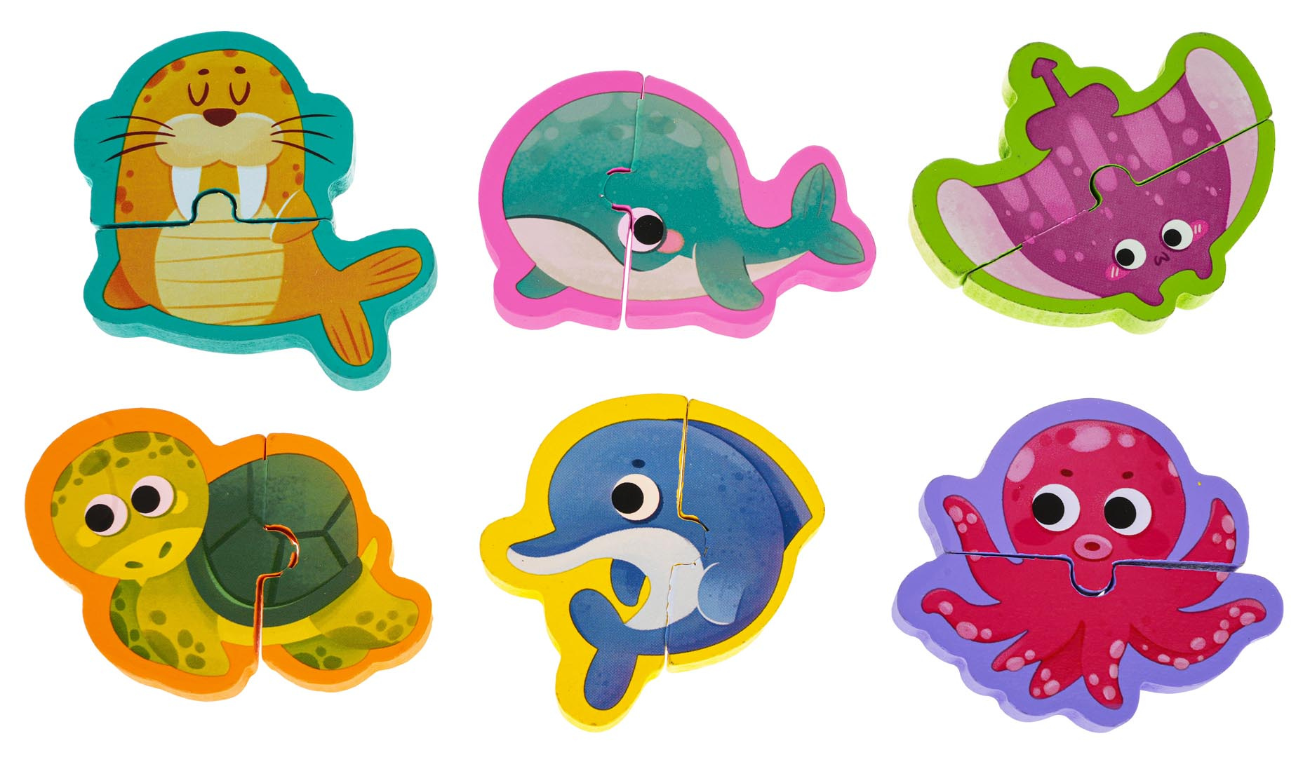 Dřevěná oboustranná tabule s mořskými zvířátky pro děti od 3 let. Z jedné strany tabule slouží k malování fixem přiloženým k sadě. Fix má také gumu, aby bylo možné obrázek vyčistit a malovat znovu. Na druhé straně tabule je kresba džungle a prohlubně pro umístění zvířátek z dřevěných kostek. Mezi zvířátky máme lachtana, želvu, delfína, velrybu, rejnoka a chobotnici. Sada byla vyrobena s důrazem na detaily, v živých barvách.