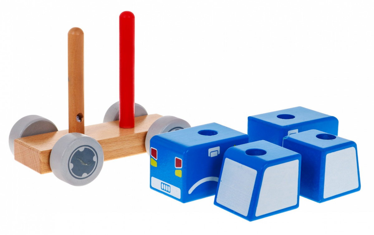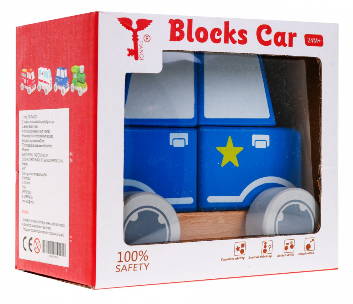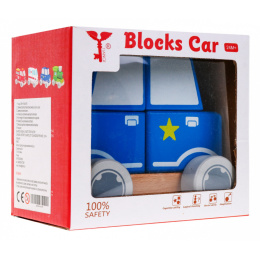 Dřevěné policejní auto je hračka určená pro kreativní batolata od dvou let. Vůz se skládá ze základny a čtyř bloků. K podstavci jsou po stranách připevněny dřevěné pohyblivé kroužky a nahoře 2 kolíky. Dítě umístí kostky na hmoždinky a vytvoří vozidlo. Všechny části hračky jsou vyrobeny ze dřeva a natřeny netoxickými barvami. Prostřednictvím hry dítě podporuje koordinační schopnosti rukou a očí a učí se logickému myšlení.
