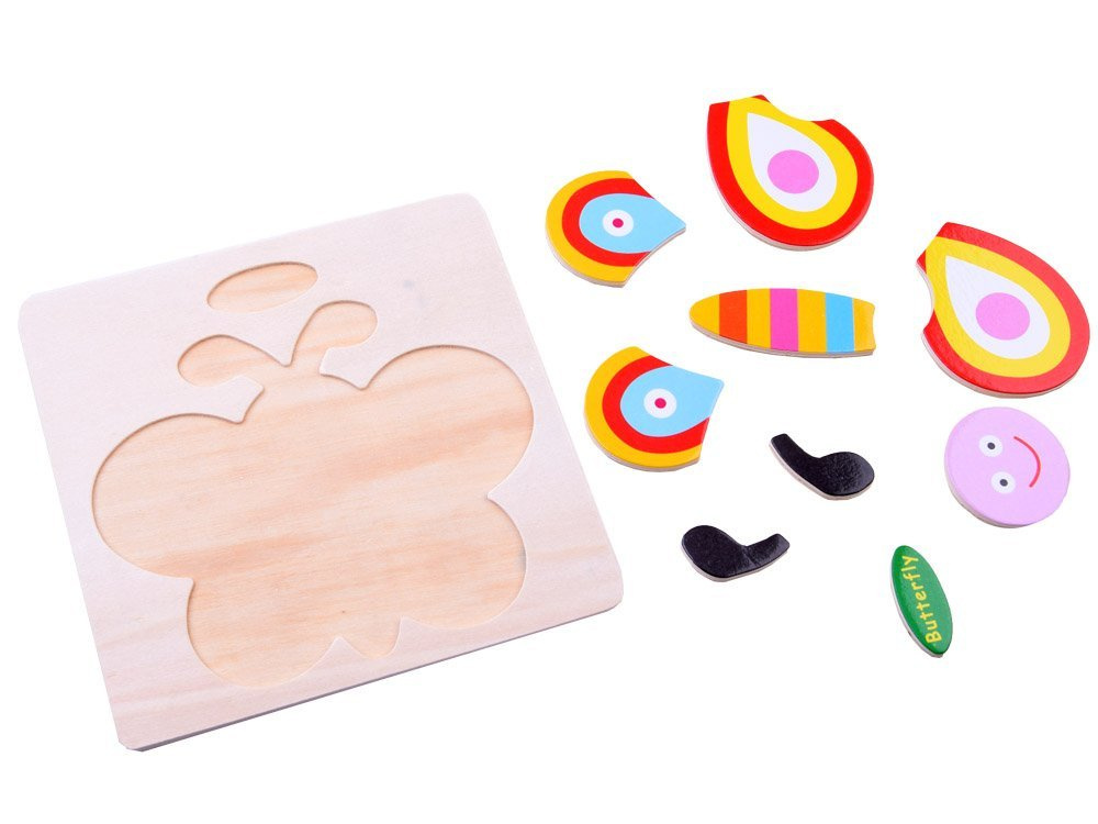Při hře s puzzle dítě přiřazuje dílky k prázdným místům, puzzle jsou vyrobeny z přírodního dřeva s barevnou strukturou.