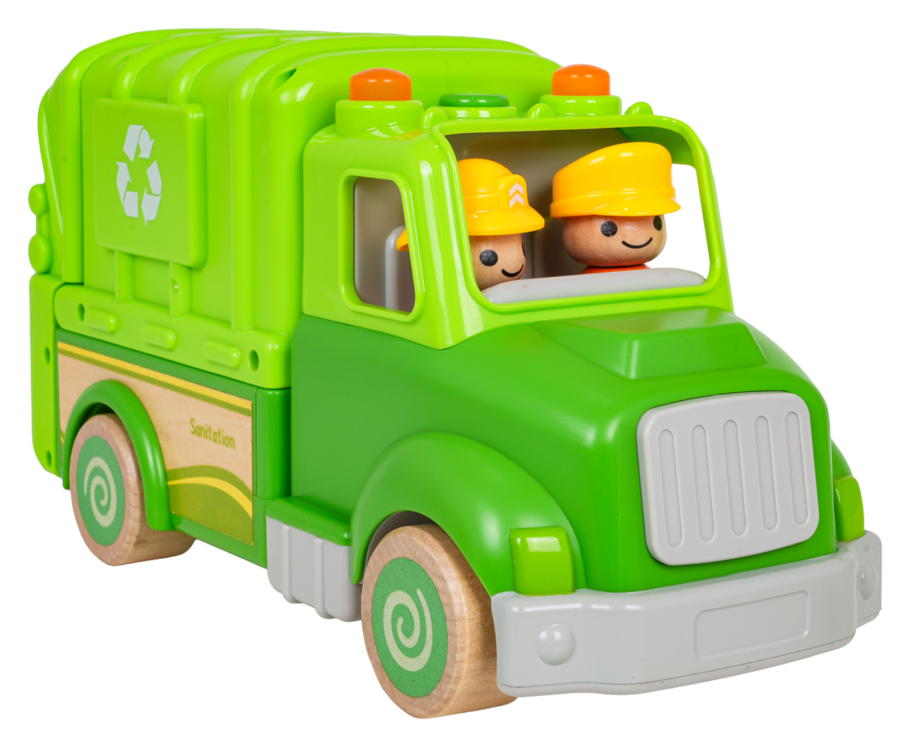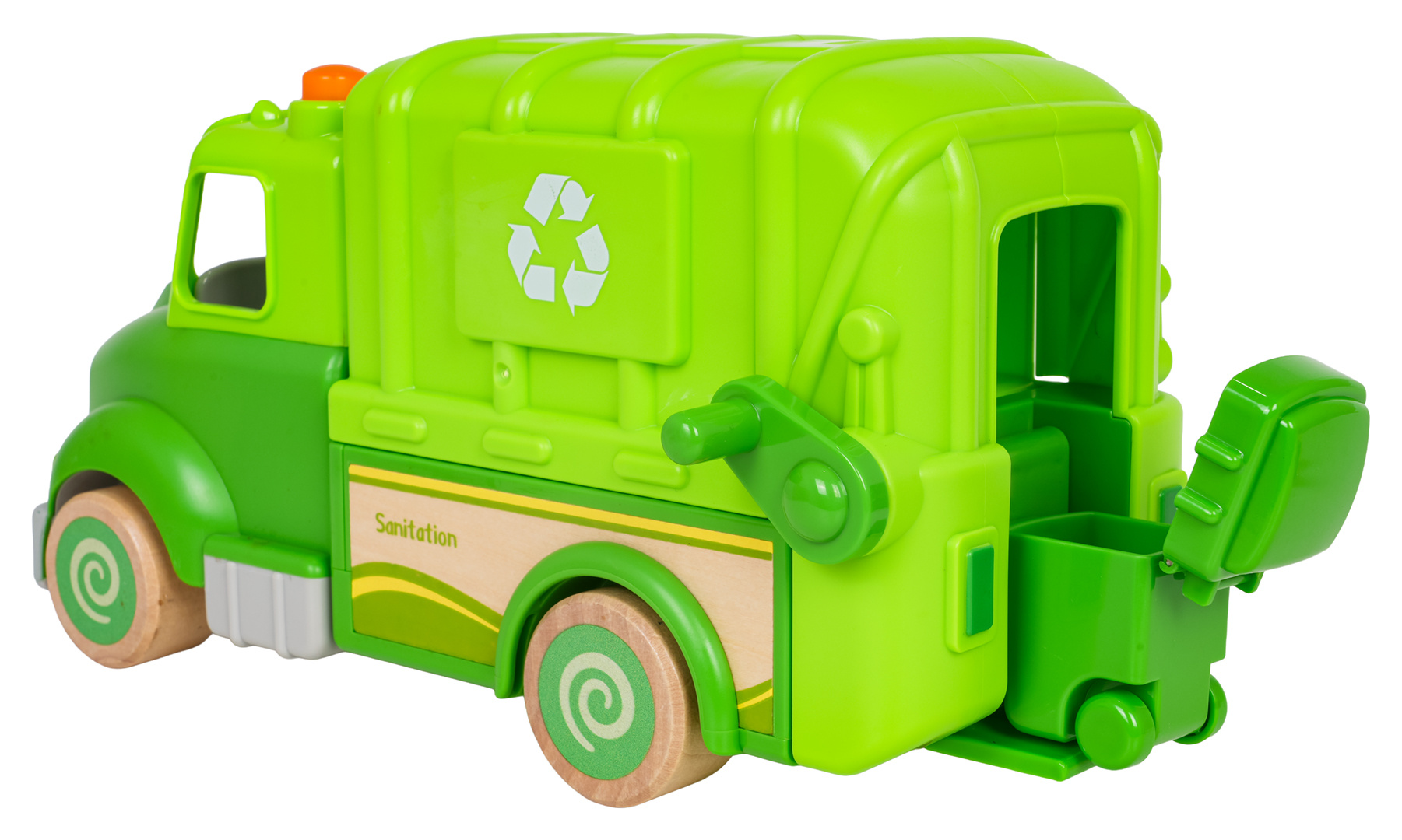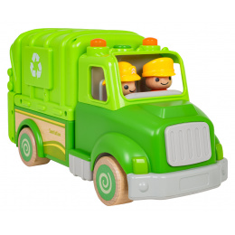 Interaktivní popelářské auto s funkcí zvuku a světla pro děti od osmnácti měsíců. Hračka byla vyrobena z nejkvalitnějších materiálů: dřeva a plastu. Nemá ostré hrany. Smetiarka má funkční zvedák na popelnice (kličku) a funkci vysypávání. Na střeše popelářského vozu se nachází tlačítko, které spouští melodie a světelné efekty v podobě blikajících světýlek. V sadě můžeme najít 2 figurky, odpadkový koš, smetáček a varovný znak. Hračka je napájena bateriemi typu 3 x AG13 (v balení).