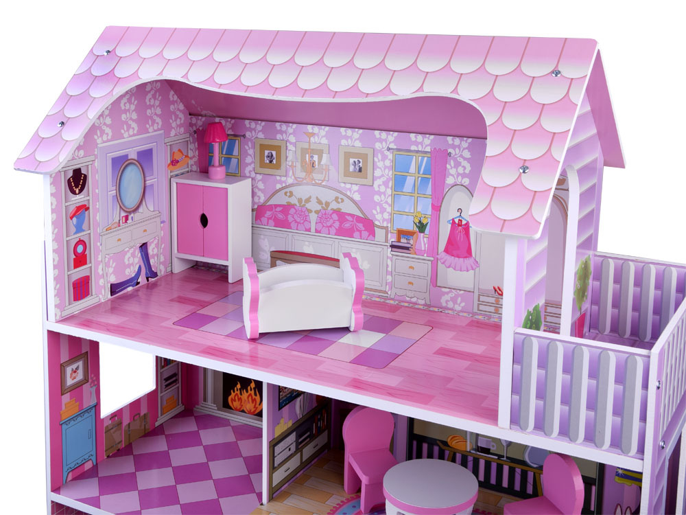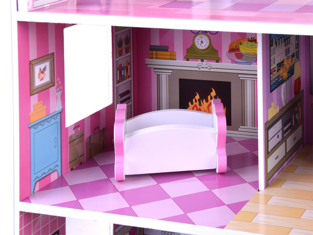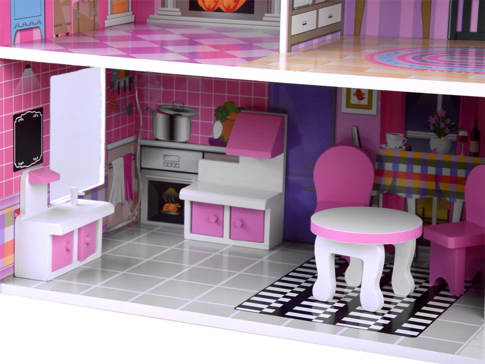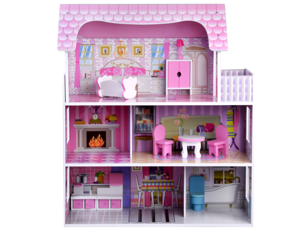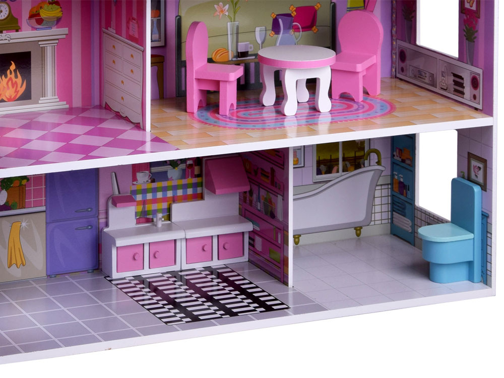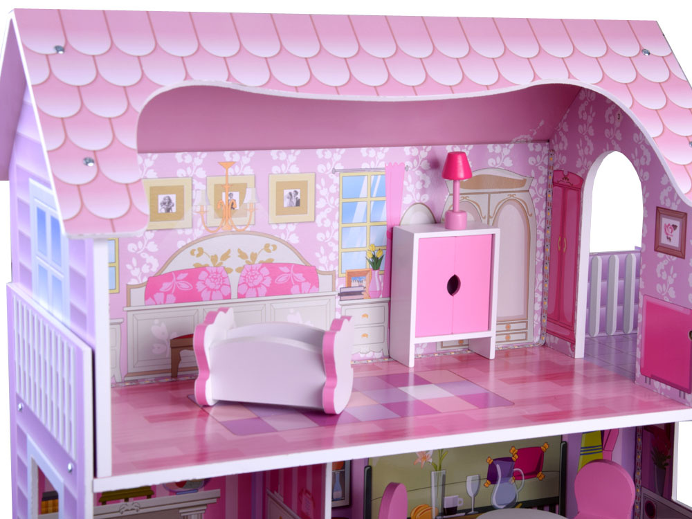 Krásná dřevěná vila pro panenky je hračkou snů každé dívky. Dřevěný domeček pro panenky s nábytkem ve skvělých barvách a grafice vám umožní vybavit pokoje, místnosti podle představ nového majitele. Dům má 3 podlaží, z nichž každé je elegantně a stylově zařízeno. Velký domeček pro panenky je vybaven veškerým potřebným nábytkem pro pohodlné bydlení. Povrchová úprava domu je velmi nápadná, hra s takovým domem bude pokračovat donekonečna. Hračka je určena k vlastnímu sestavení. Sestavení domku trvá maximálně 30 minut. je velmi jednoduchý a intuitivní. Dům je zabalen v kartonové krabici, která je uvnitř chráněna polystyrenem pro bezpečnou přepravu.