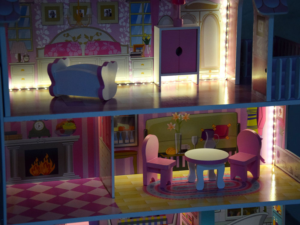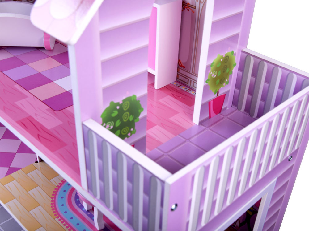 Stylový domeček pro panenky se třemi patry, pěti pokoji a terasou pojme ve svých apartmánech mnoho hostů. Dům je vybaven nábytkem, led osvětlení rozděleno do každého patra. Dům udržovaný v tónech růžové, fialové a velmi působivé s velkou grafikou dotyčných místností.