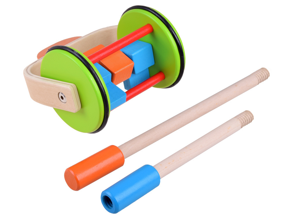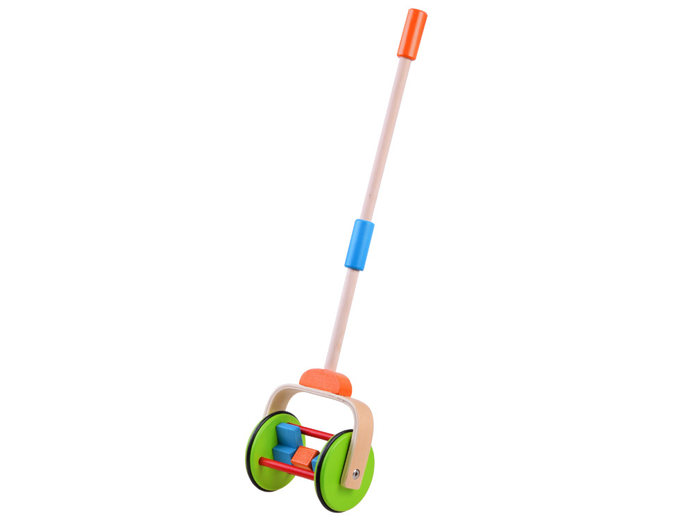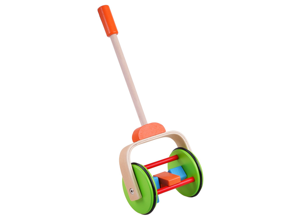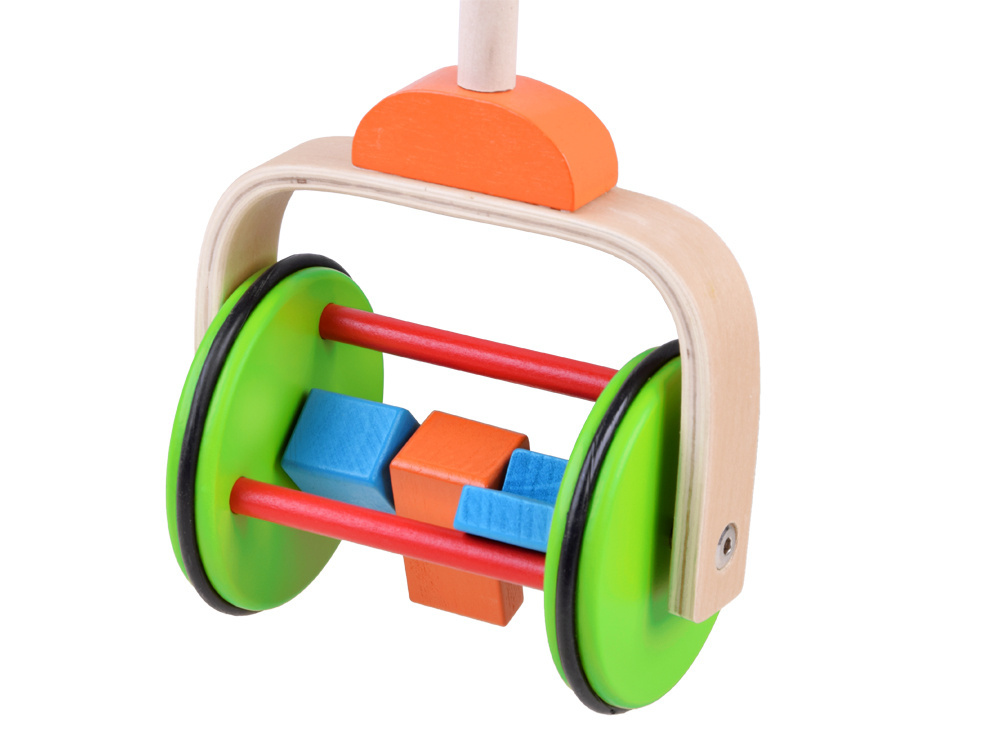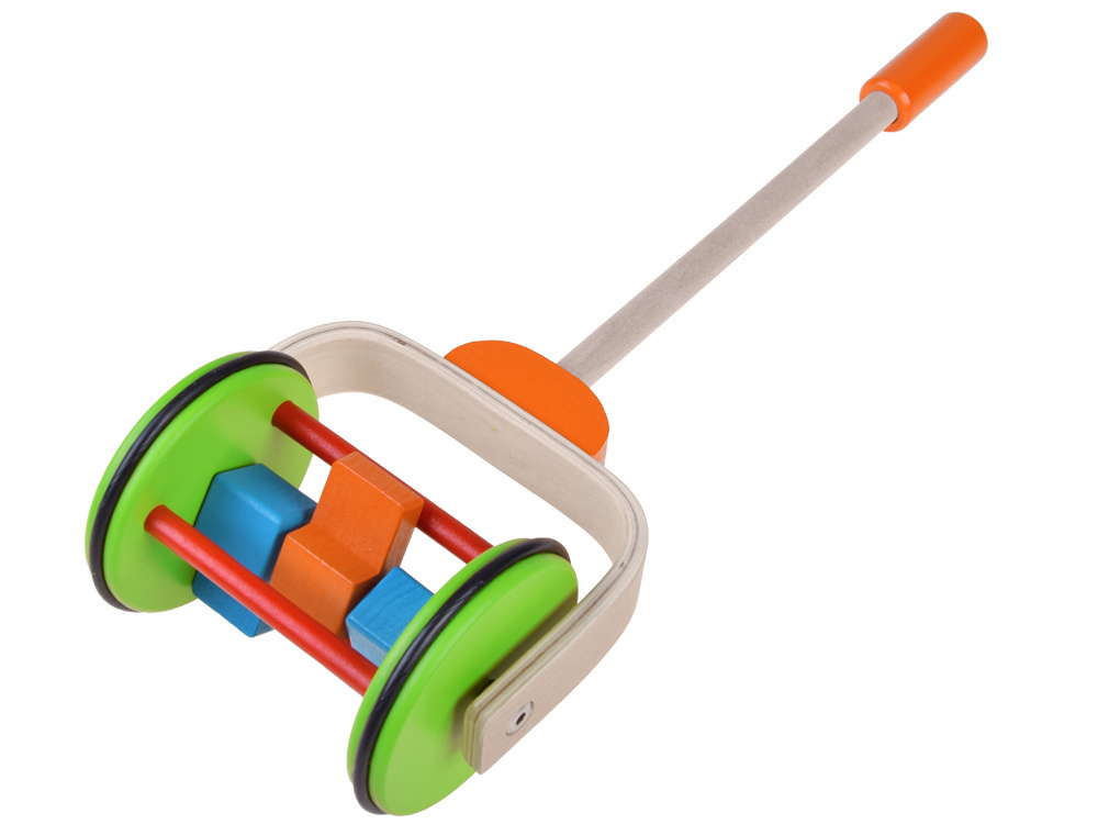 Barevný dřevěný válec, odrážedlo pro dítě, které se dá tlačit, je tipem pro všechny malé děti, které začínají své dobrodružství s chůzí. Váleček na rukojeti se otáčí kolem vlastní osy, uvnitř jsou barevné kostky, které při zatlačení na hračku vesele chrastí.