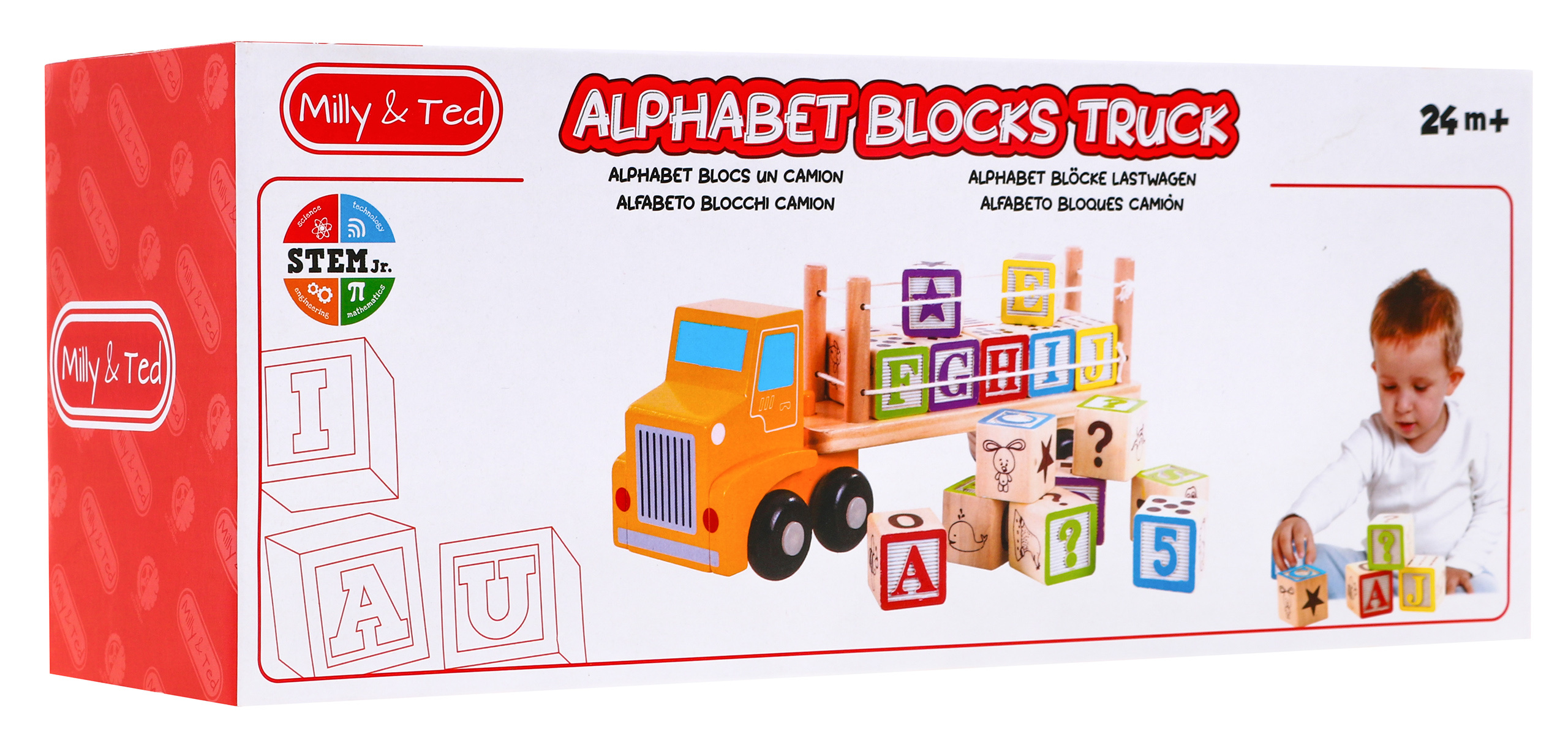 Dřevěný náklaďák s kostkami je bezpečná hračka pro batolata již od 2 let. Tato sada je kombinací učení a zábavy. Rozvíjí motoriku, manuální zručnost a koordinaci oko-ruka. Sada obsahuje 20 dřevěných kostek s písmeny abecedy a kresbami. Po skončení hry lze všechny cihly naskládat na přívěs nákladního auta.