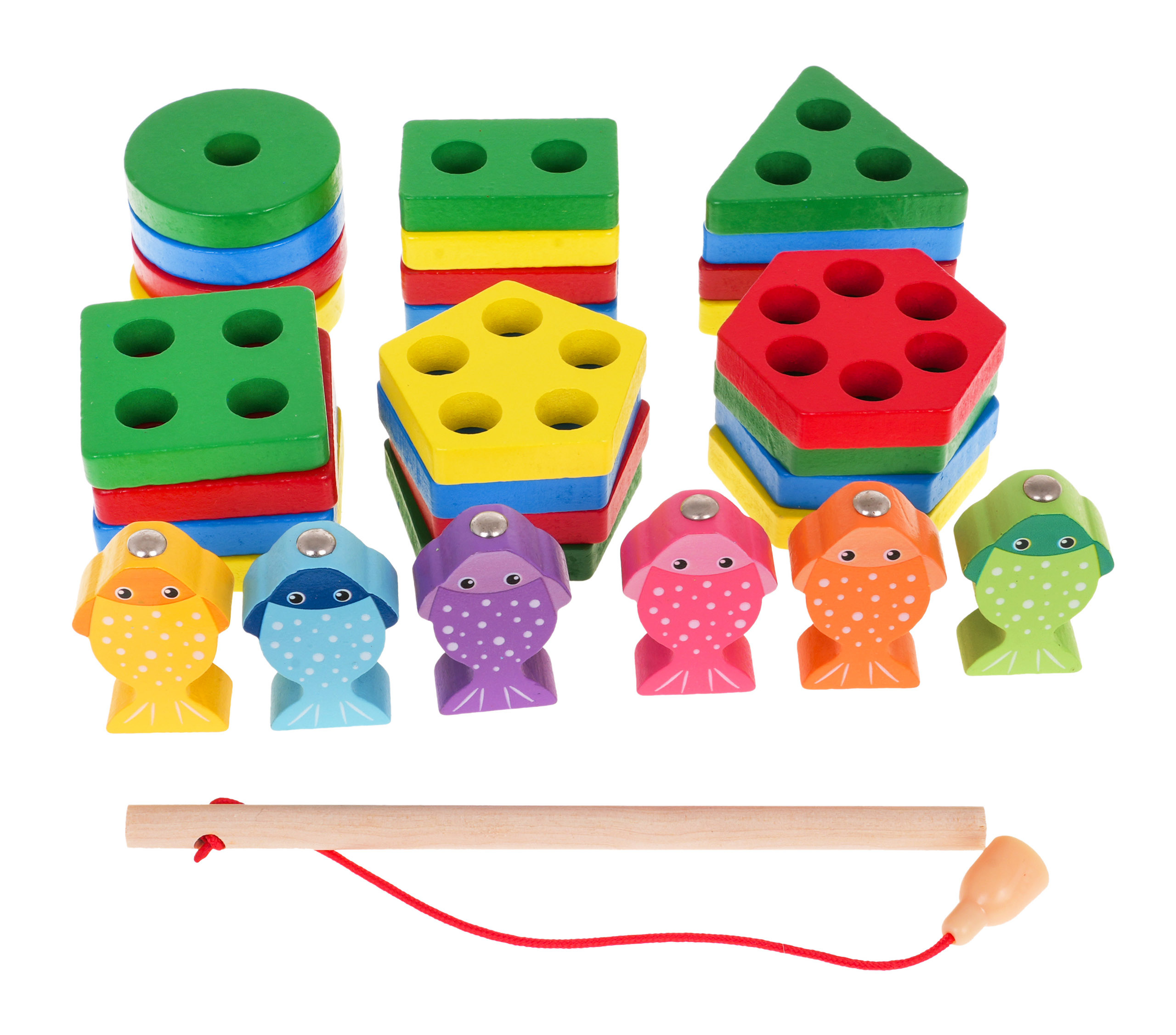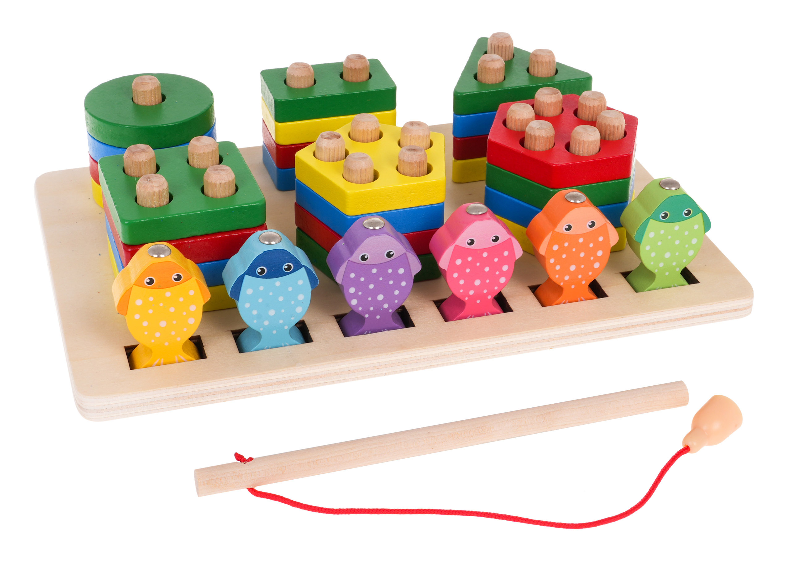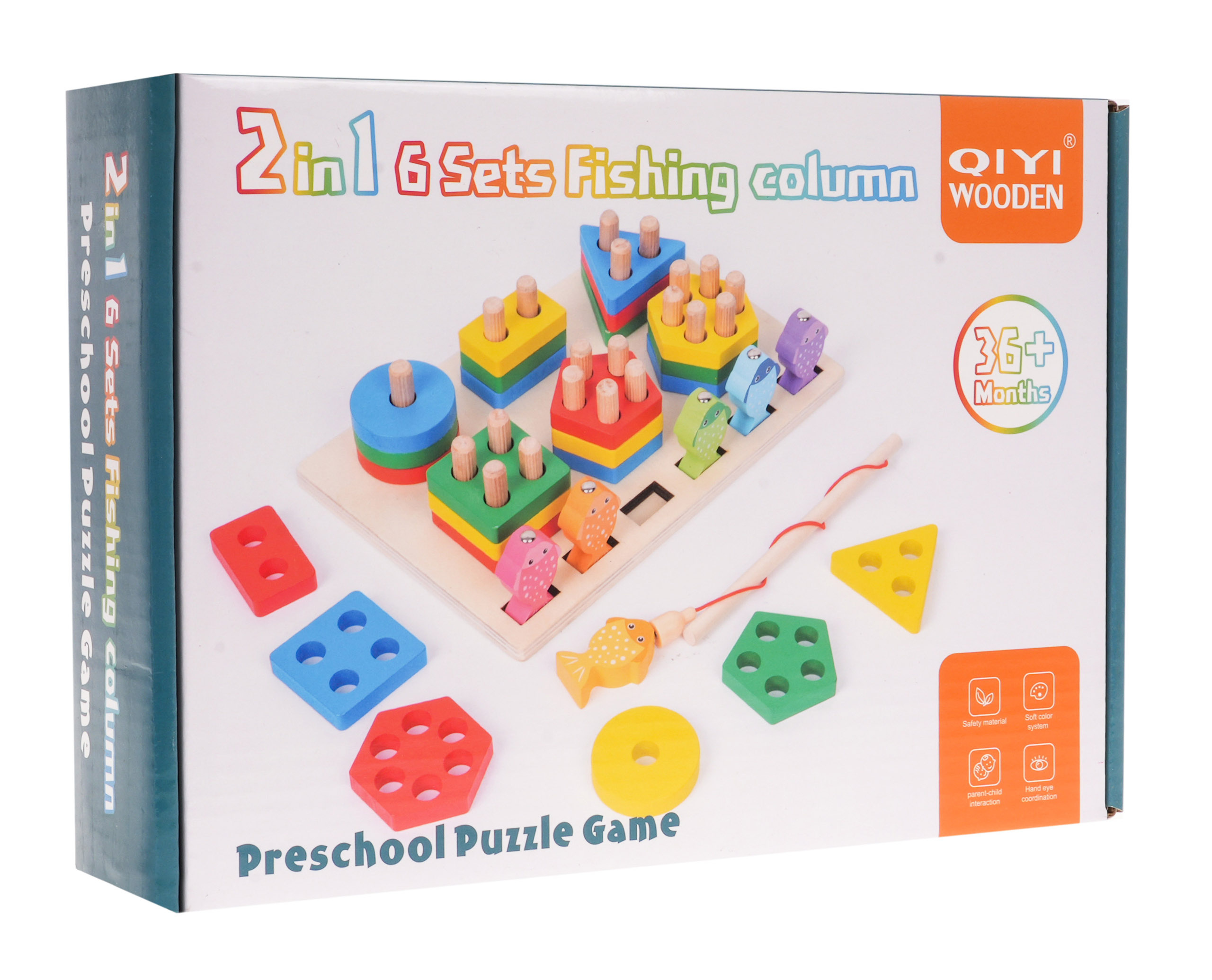 Sada 2 v 1, dřevěné puzzle a chytání rybiček je určena pro děti od 3 let. Sada se skládá z dřevěné základny s kůly a obdélníkovými jamkami. Na kůly umístíme barevné bloky se zaoblenými konci různých tvarů a do prohlubní vložíme ryby. Je třeba uspořádat různé barevné geometrické útvary, jako je kruh, obdélník, trojúhelník, čtverec, pětiúhelník a šestiúhelník. Kruh má jeden otvor, obdélník dva, trojúhelník tři, čtverec čtyři, pětiúhelník pět a šestiúhelník šest. Úkolem batolete je šikovně přiřadit určitou číslici k danému počtu kolíků. Kromě toho je na hrací ploše hra na chytání ryb. Hra spočívá v umístění ryb s magnety do obdélníkových otvorů pomocí magnetické tyče. Sada je ideální pro rozvoj manuální zručnosti, procvičuje motoriku, hmat a vizuální koordinaci batolat. Dítě si rozvíjí představivost a podněcuje kreativitu.