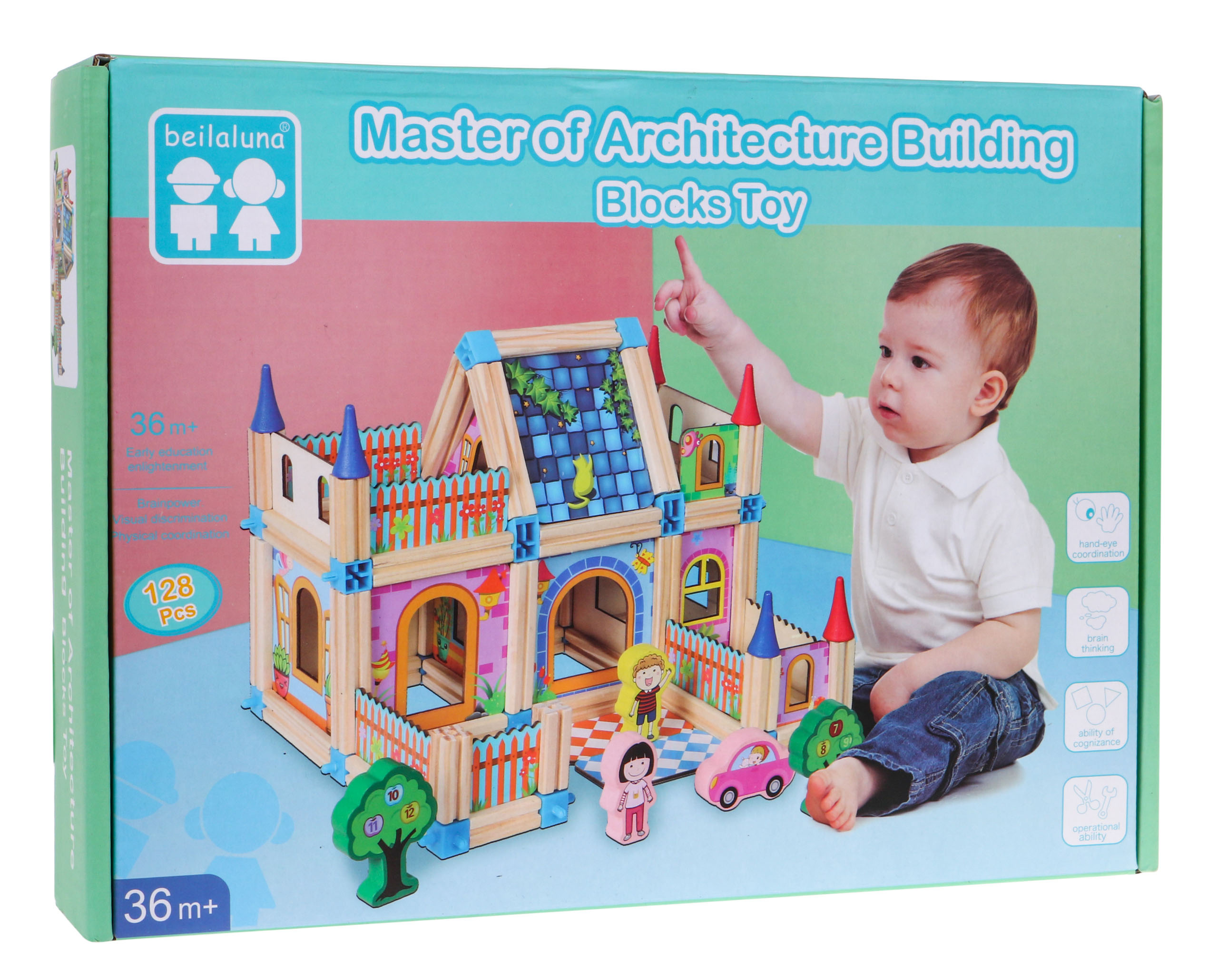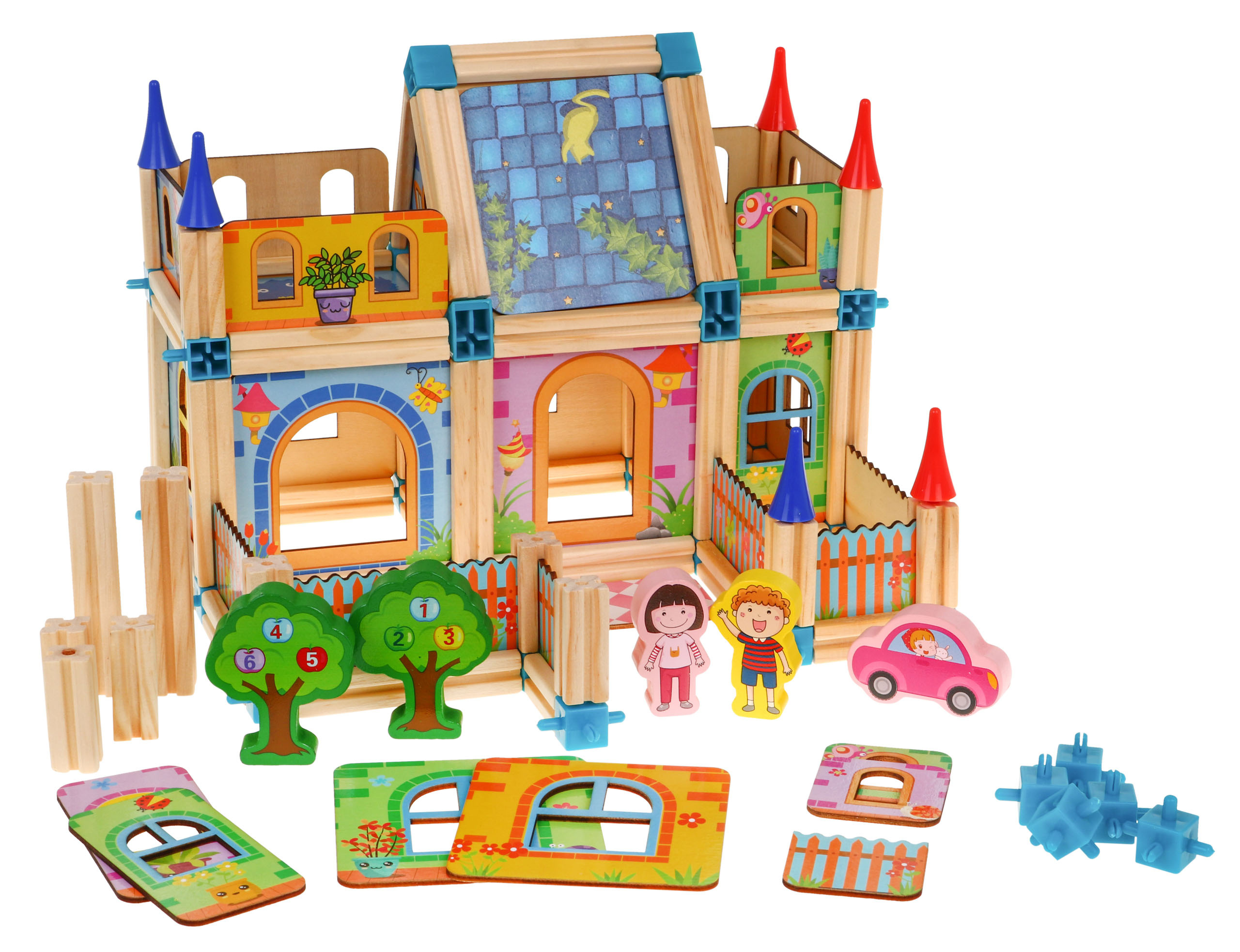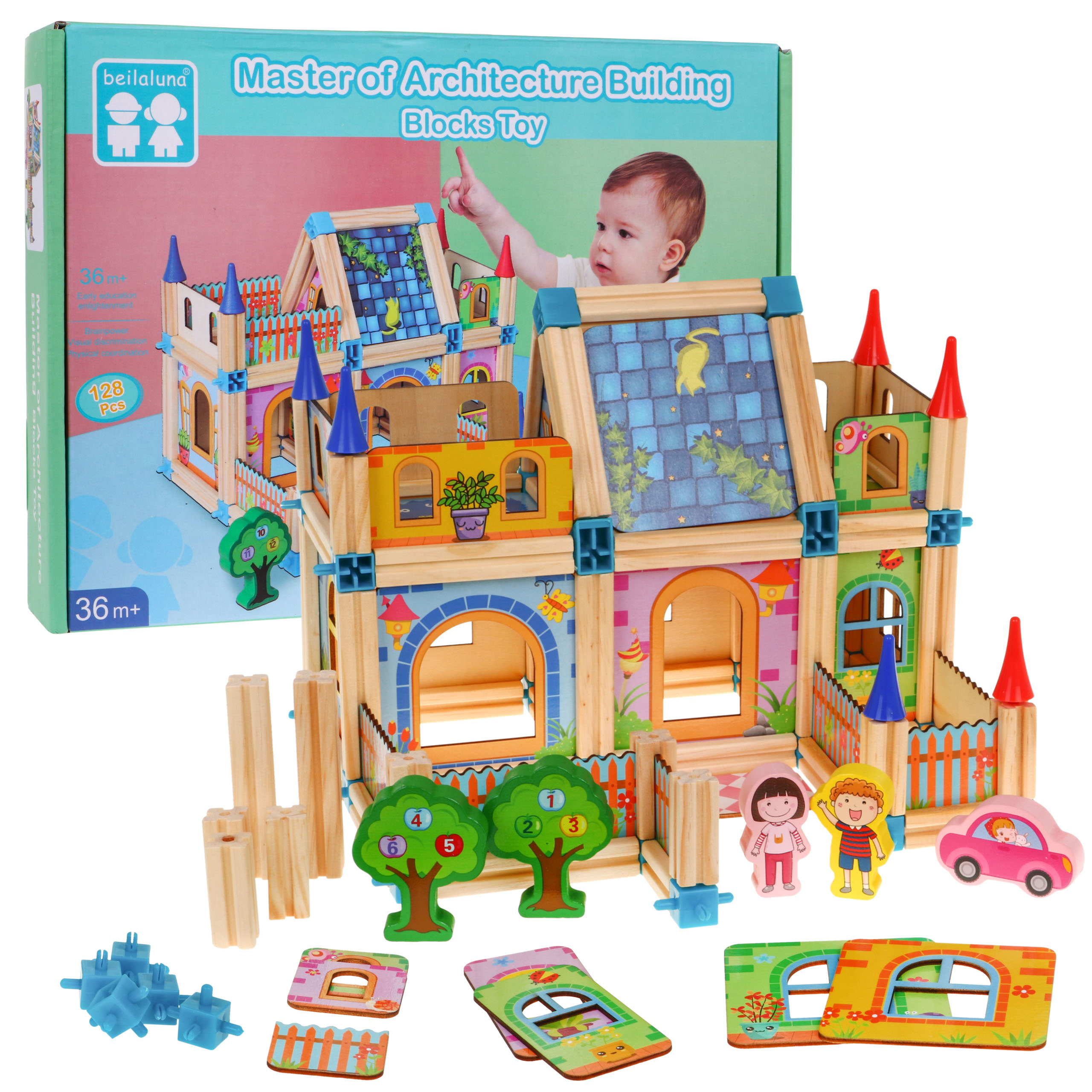 Sada dřevěných, barevných a bezpečných kostek pro děti od 3 let. Balení obsahuje 128 dílků, které po sestavení tvoří barevné dřevěné domečky. Kromě stavebních prvků sada obsahuje také kostky ve tvaru stromu s postavičkami chlapců a dívek a autíčky a obrázkový návod.