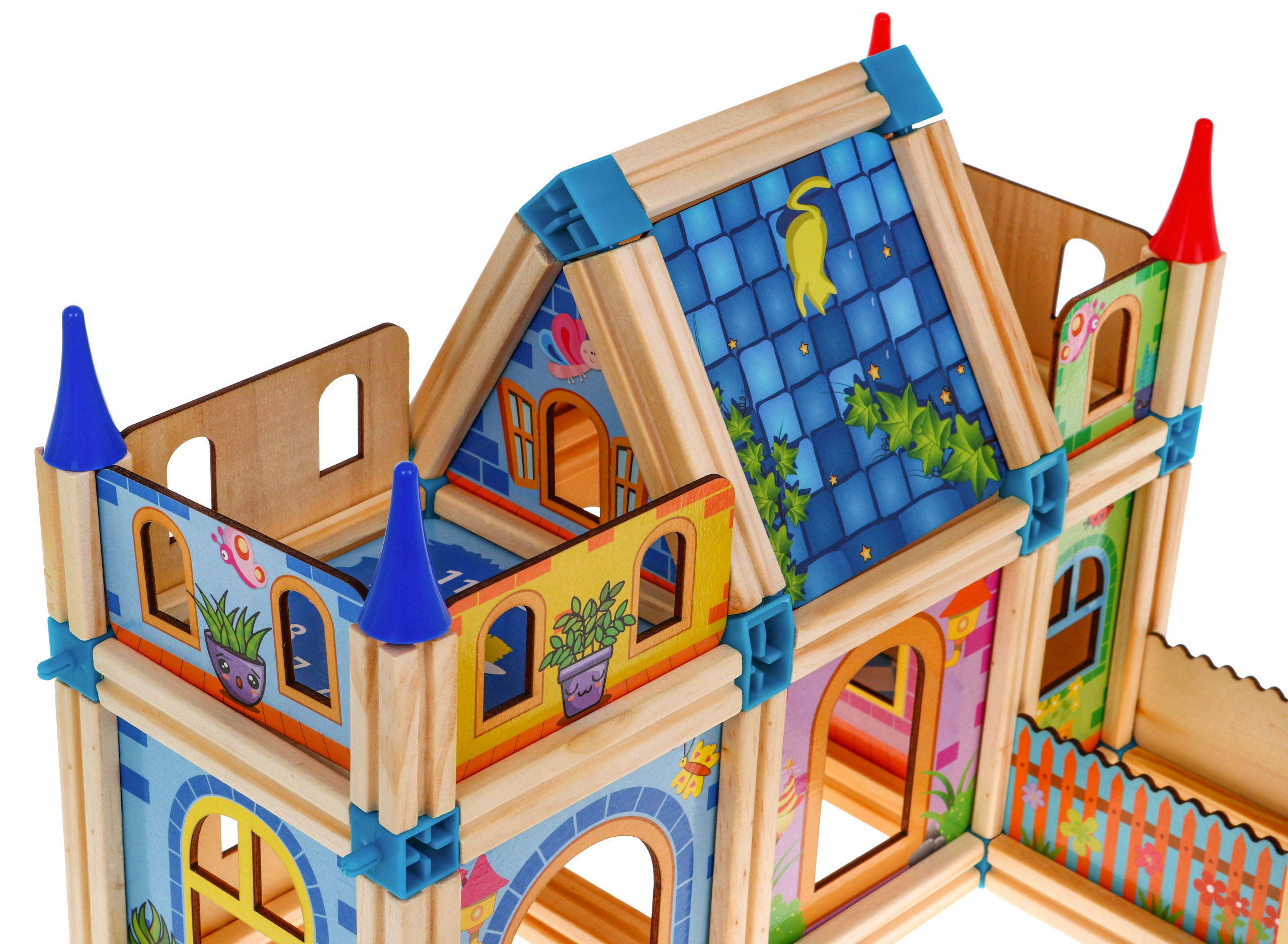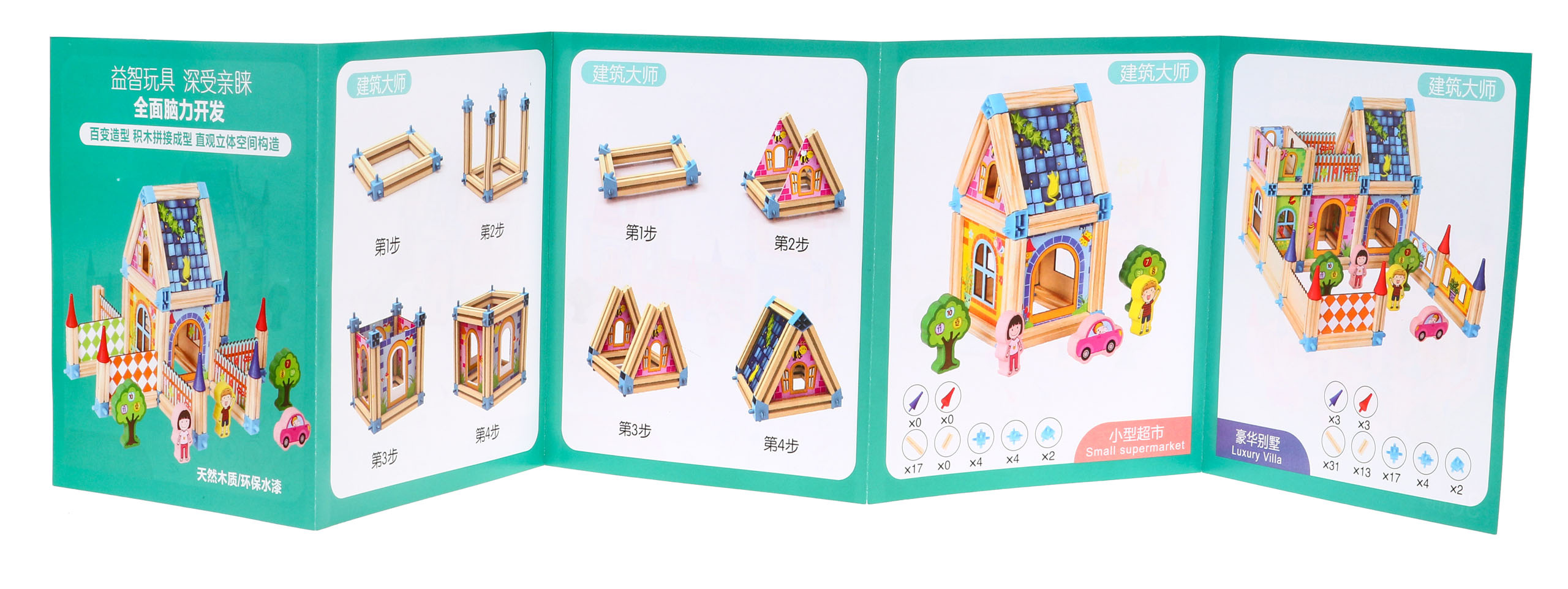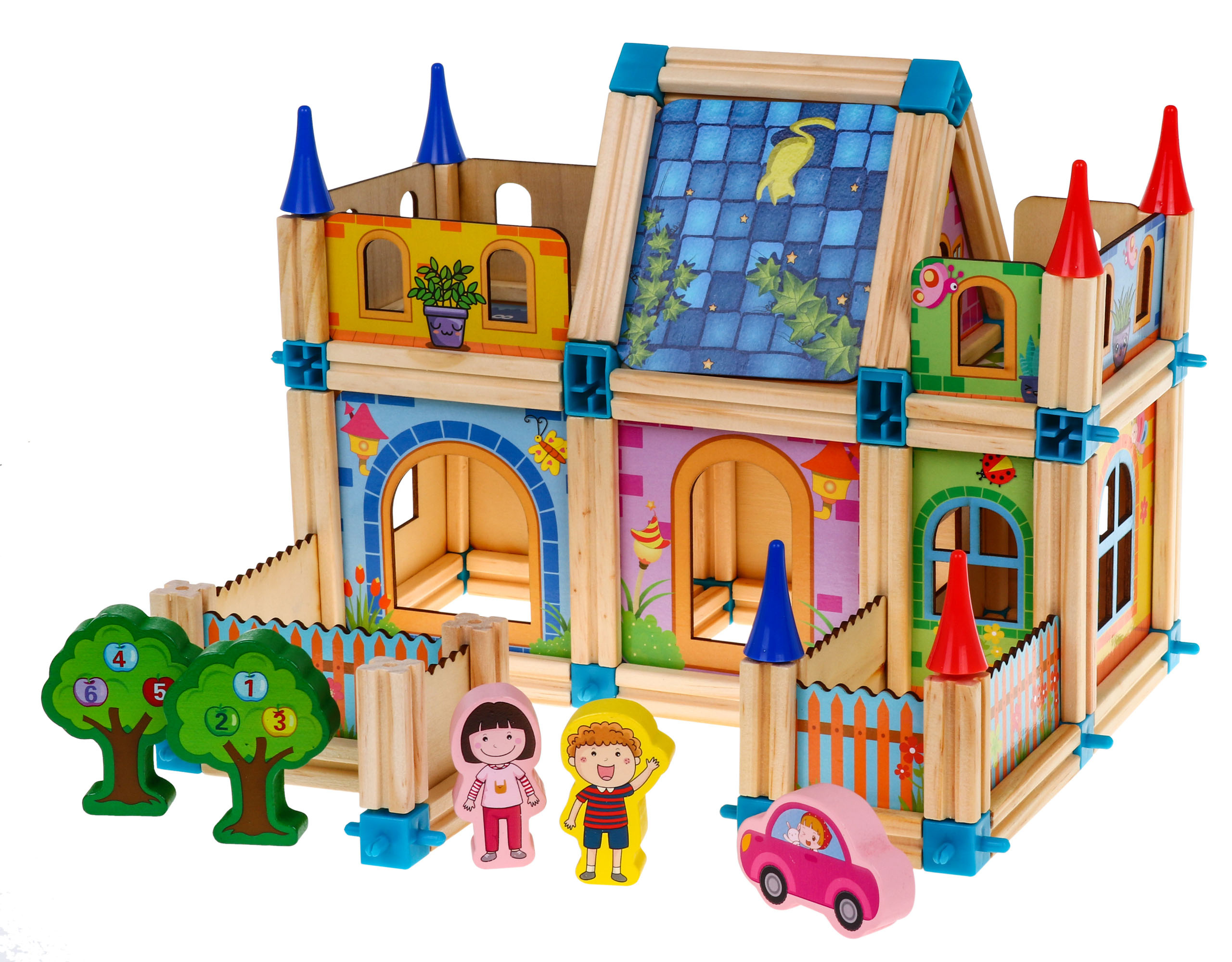 Sada dřevěných, barevných a bezpečných kostek pro děti od 3 let. Balení obsahuje 128 dílků, které po sestavení tvoří barevné dřevěné domečky. Kromě stavebních prvků sada obsahuje také kostky ve tvaru stromu s postavičkami chlapců a dívek a autíčky a obrázkový návod.