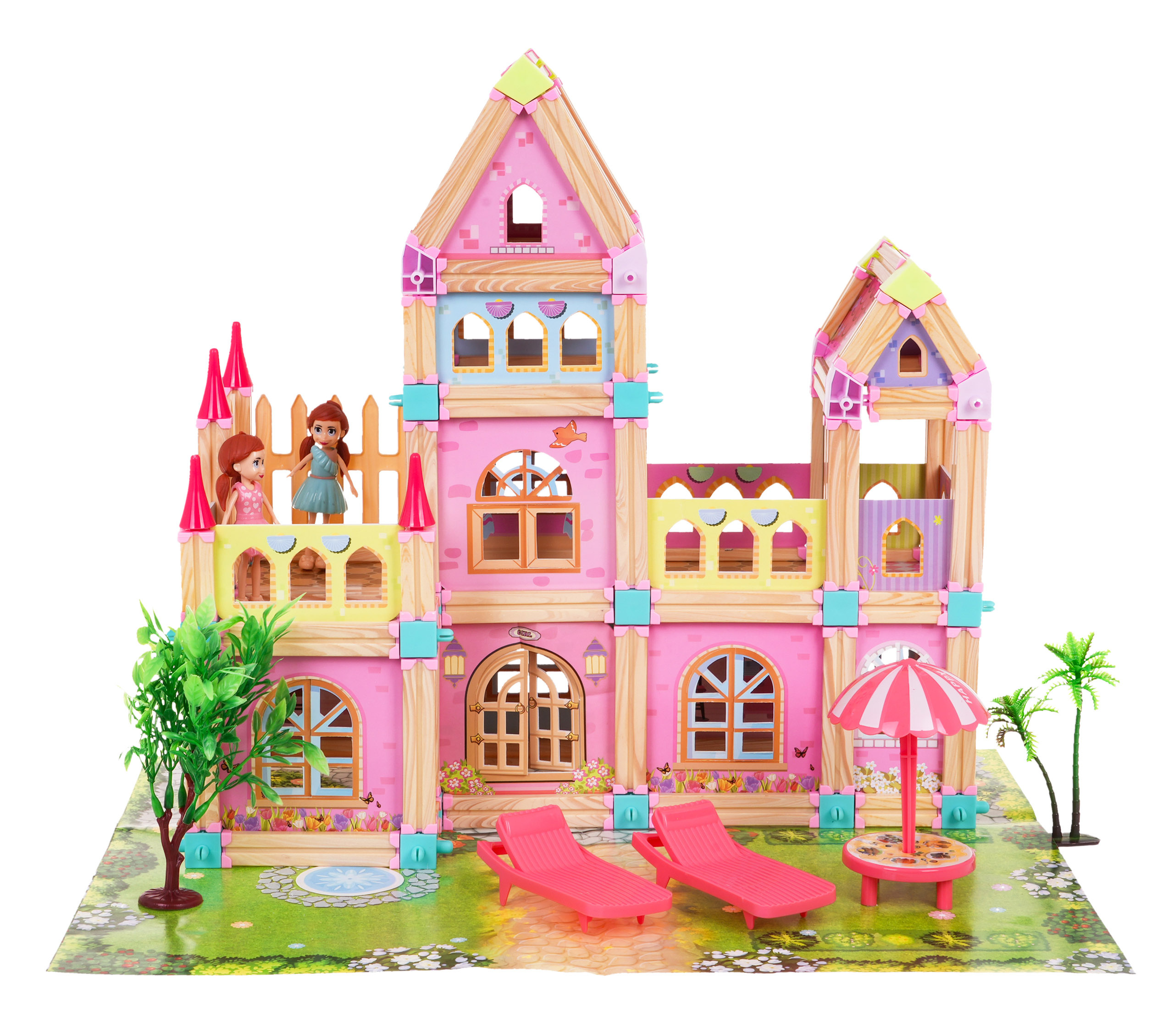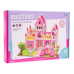 Sada dřevěných, barevných a bezpečných kostek pro děti od 3 let. Balení se skládá ze 183 dílů, které po sestavení tvoří dřevěný domek se zahradou a odpočinkovou zónou. Součástí sady jsou také 2 figurky princezen.