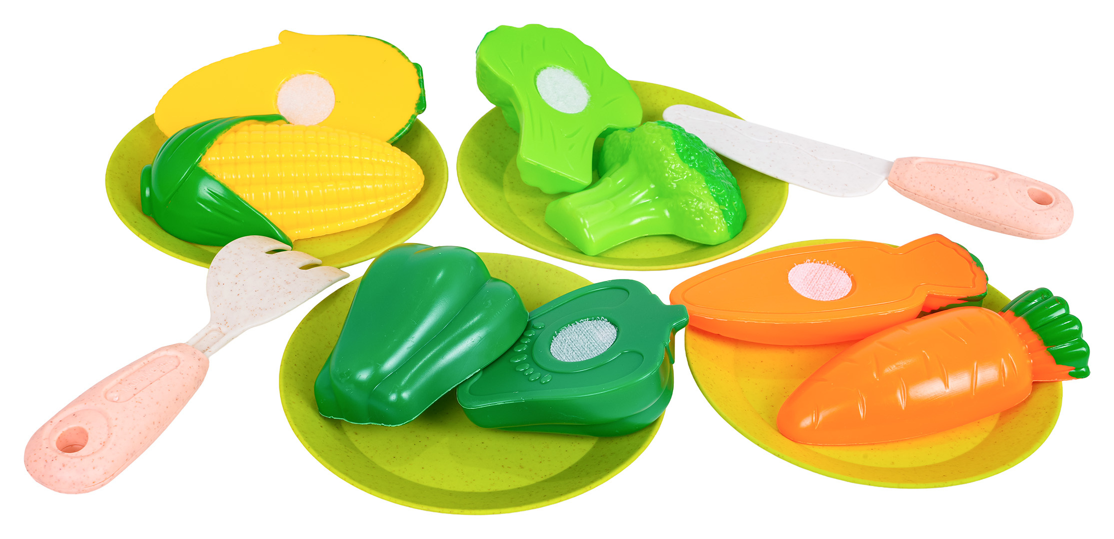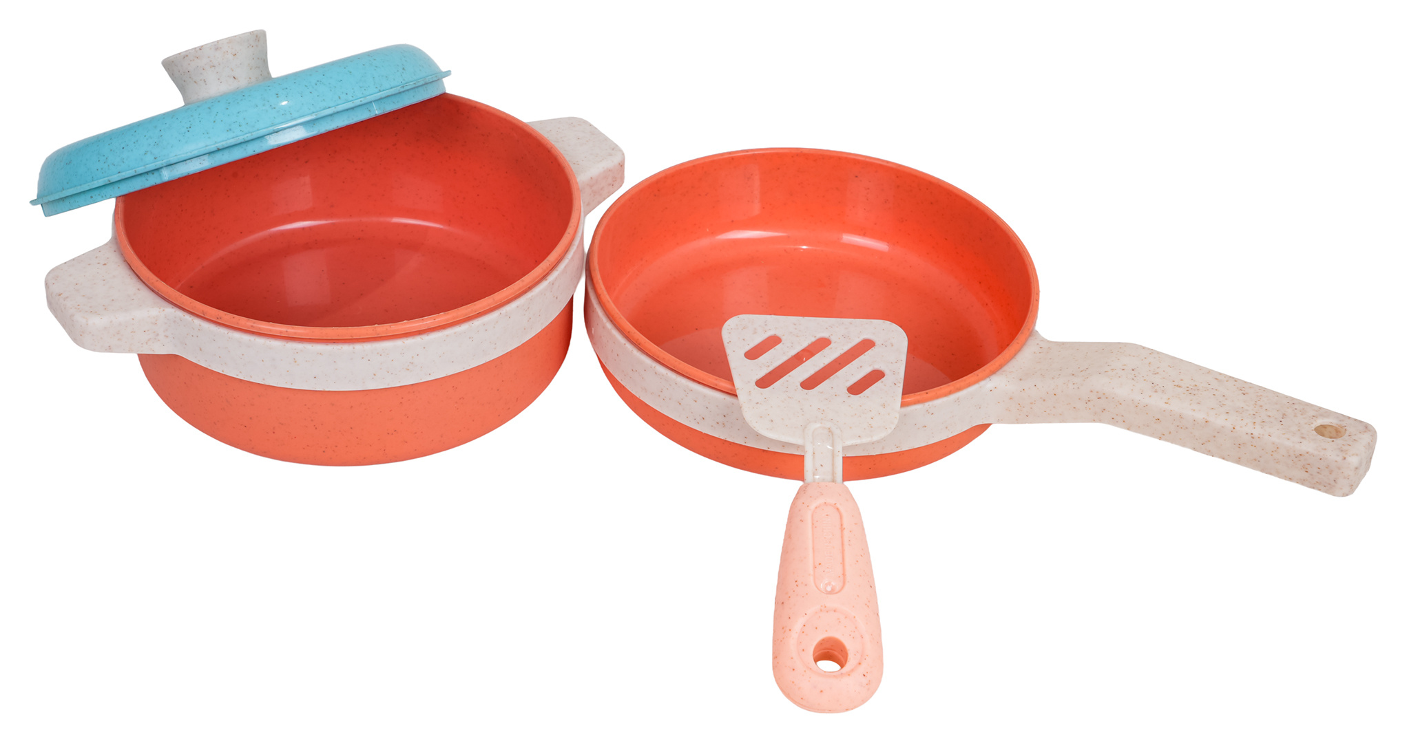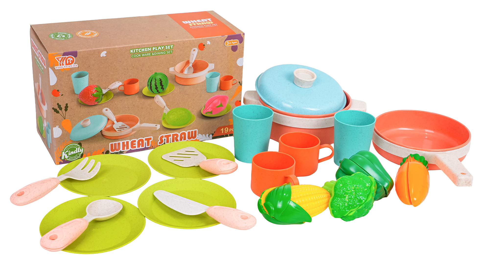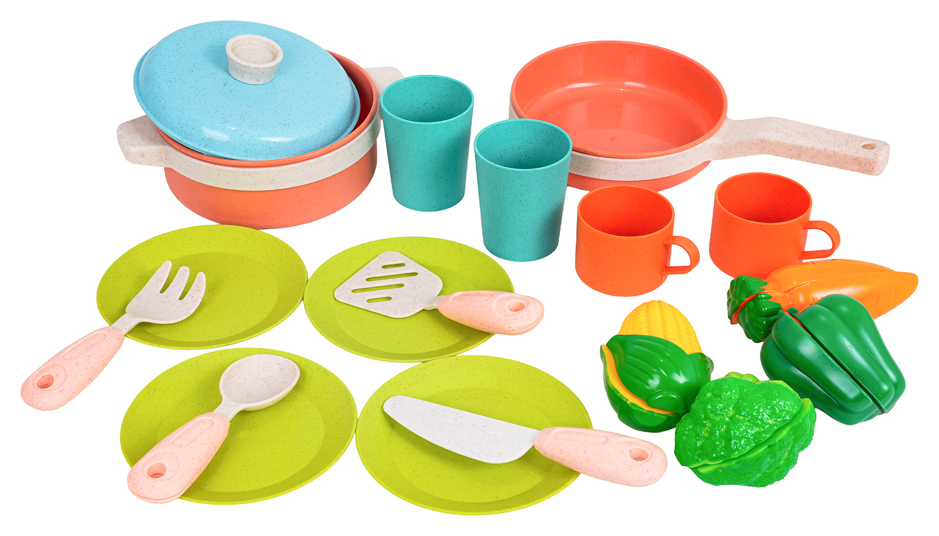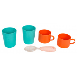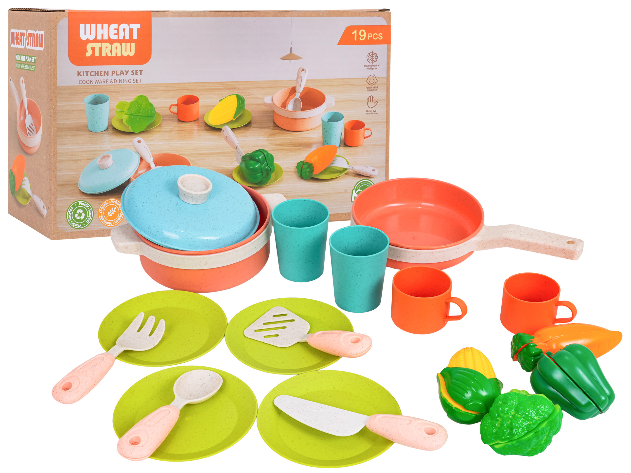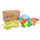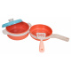 Sada ekologických hrnců a příslušenství pro děti od tří let. Sada je vyrobena z bioplastu a obsahuje 19 prvků: hrnce a atrapy potravin. Živé barvy provedení přitahují pozornost dítěte a povzbuzují ke hře.