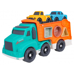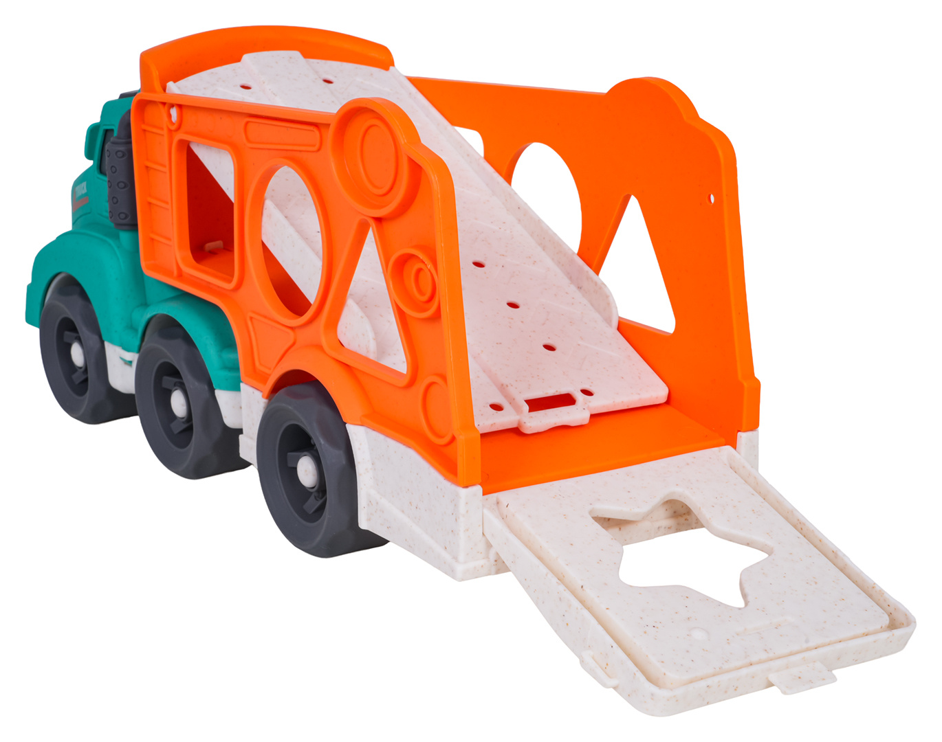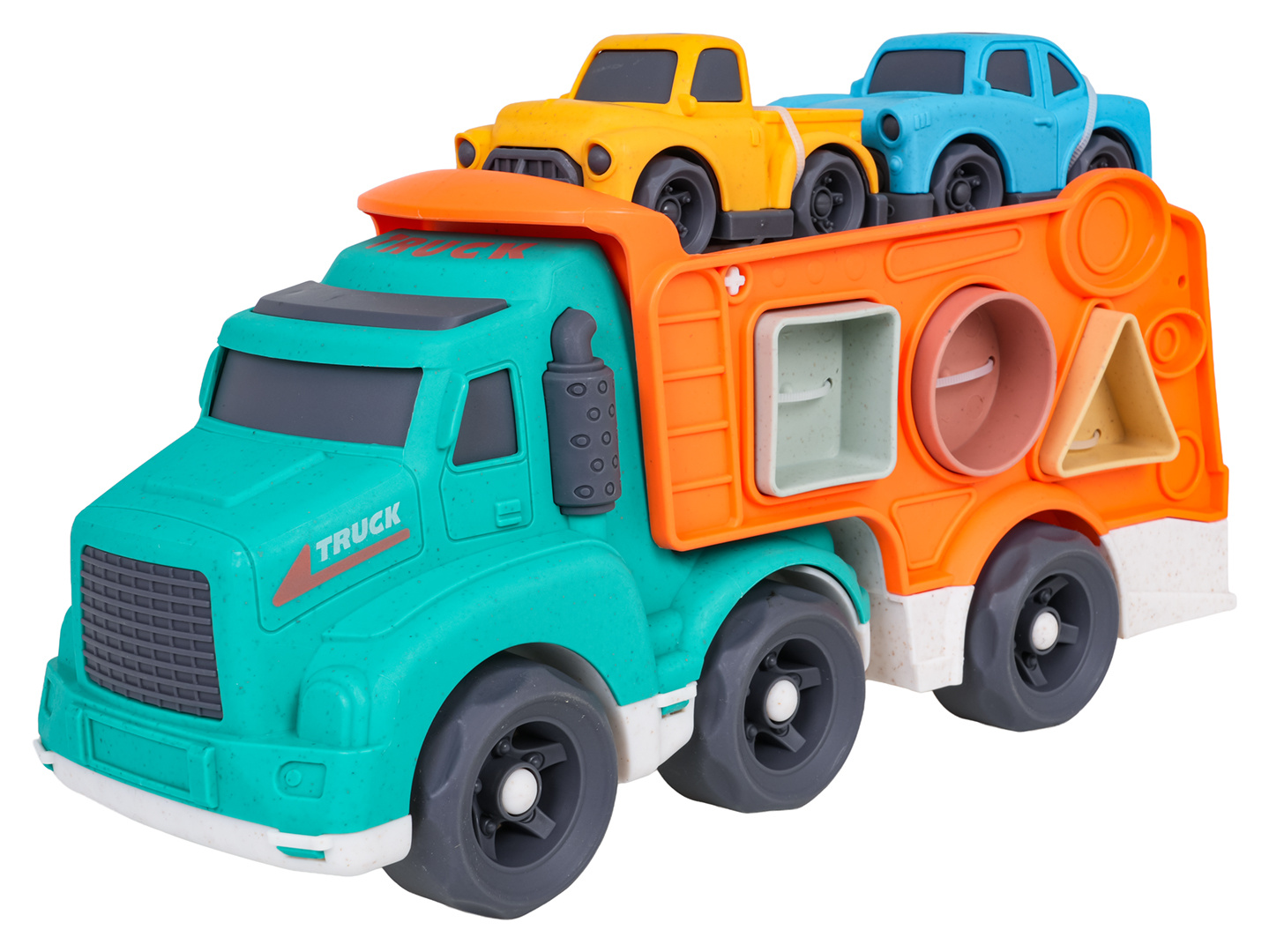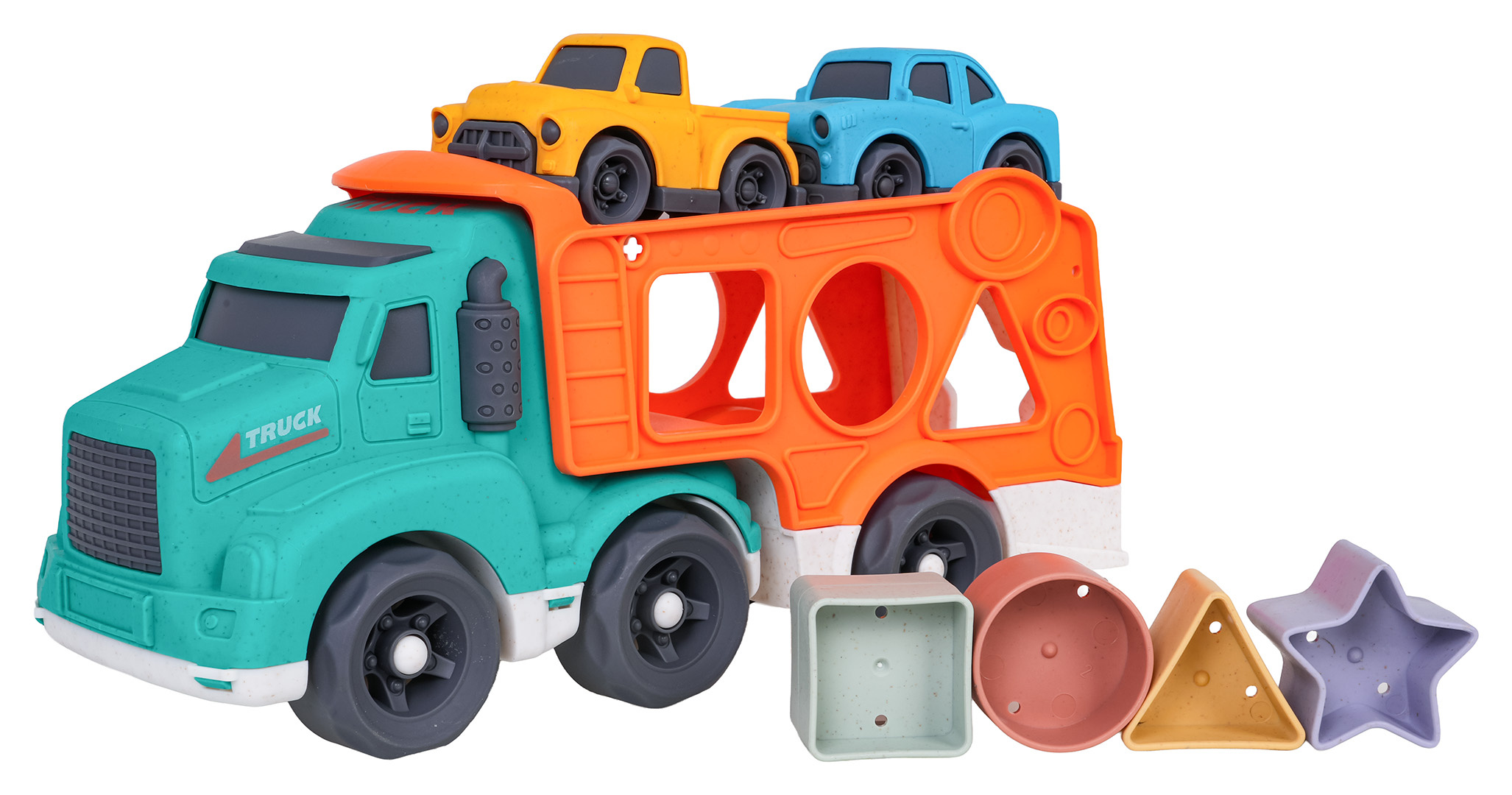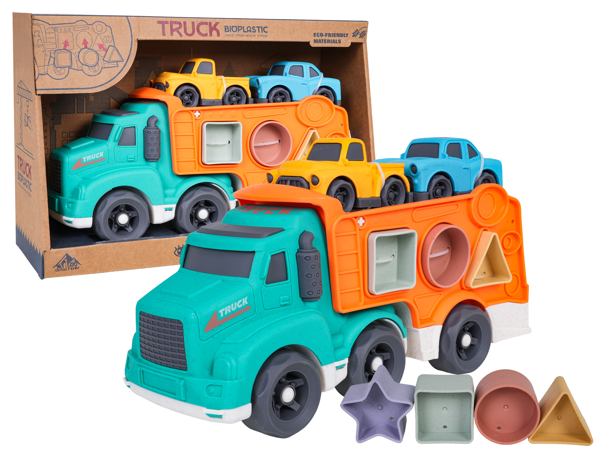 Sada odtahovka, vozidla, třídič vyrobený z bioplastu pro děti od osmnáctého měsíce života. Sada se skládá z vozidla a velkého přívěsu, po jehož stranách je třídič tvarů, kostky a 2 autíčka. Eko-materiál je bezpečný pro děti a šetrný k životnímu prostředí. Vozidla jsou barevná, odolná a odolná proti poškození. Přívěs můžeme odpojovat od vozidla. Ideální hračka do domu i na ven.